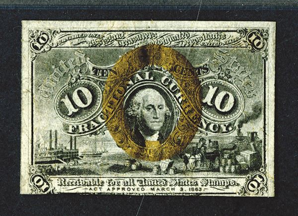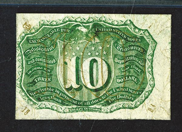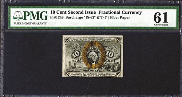 Fractional Currency. Fr. 1249 Surcharge 18-63 T-1. Fiber paper. PMG Uncirculated 61. Previously mounted noted.