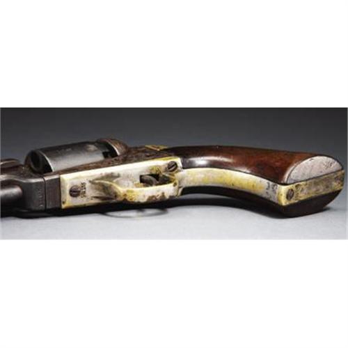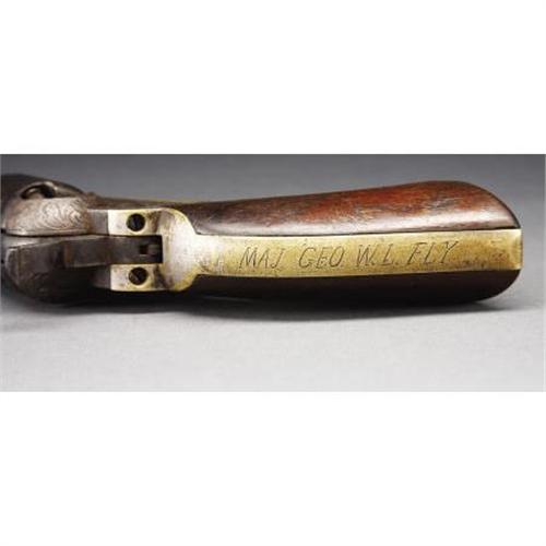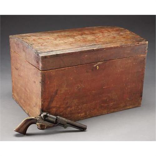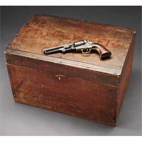 <B>Colt Model 1849 Pocket Revolver and Campaign Trunk Belonging to Major George Washington Lafayette Fly of the 2nd Texas Infantry Regiment</B></I> An outstanding Civil War group belonging to Major George Washington Lafayette Fly (1835-1905). Fly was born in Yalobusha County, Mississippi on June 2, 1835 and moved with his family to Brazoria County, Texas in 1853. There the Fly family operated a large plantation with the assistance of about 100 slaves. With the outbreak of the war, George Fly entered the Confederacy as a Captain of Company I, 2nd Texas Regiment of Volunteer Infantry, also known as “The Gonzalez Invincibles”. With the 2nd Texas Fly participated in the bloody battle at Shiloh, Tennessee; the engagement at Iuka, Mississippi; the stormy conflict at Fort Pemberton; and the battle at Corinth, Tennessee where he was taken prisoner at Fort Robinat (one of two times he found himself captured). Fly was paroled in a prisoner exchange and upon his return was promoted to major and given command of the 2nd Texas Infantry Regiment and held the position of commander of the Port of Galveston. After the fall of Vicksburg and until the end of the war the 2nd Texas operated primarily along the lower Rio Grande valley and the Texas coast. After the war Fly enjoyed a career in law and as administrator of Gonzalez College. <BR><BR>Included in the group is Major Fly’s personal .31 caliber Colt Model 1849 Pocket Revolver, 5 shot version, 5” octagonal barrel, with floral and bird head engraving motif on the frame and barrel, serial number 142185 (grip, frame, barrel, cylinder and trigger group match) with “Address Saml Colt/ New York City” along top of barrel, walnut grips, small trigger guard, attached loading lever, silver plated brass grip straps and trigger guard, with “Maj. W. L. Fly” engraved on the back strap of the grip.<BR><BR>Fly’s campaign trunk personalized with “Maj. Geo. W. L. Fly/ 2nd Tex. Inf. Reg’t/ C.S.A.” on the lid in red paint rounds out this outstanding group. The stained walnut trunk measures 18.5” x 13” x 12.25”, with a slightly arched lid, constructed with dove tailed sides and square nails, missing the locking mechanism and with honest wear but an attractive piece with a wonderfully aged patina. The lot is sold with a small file of papers concerning the Fly family, including information on Major Fly’s son, Frank Merriman Fly, a noted Texas judge.<BR><BR><B>Condition:</B></I> The silver plating on the revolver brass is wearing thin, there's some light pitting present, and the cylinder engraving is faint, else a nice example of this Colt model.<BR><BR><b>Shipping:</b> Other (oversized items, group lo (<a target="_blank" href="http://www.heritageauctions.com/common/shipping.php">view shipping information</a>)