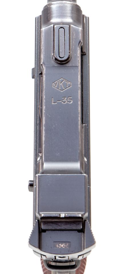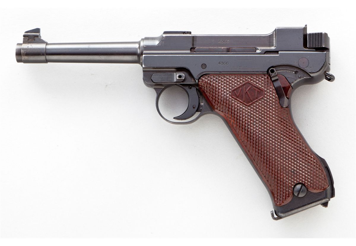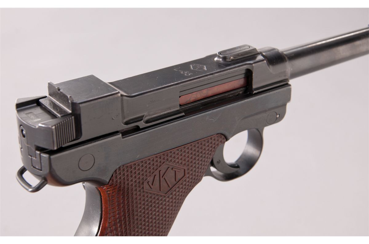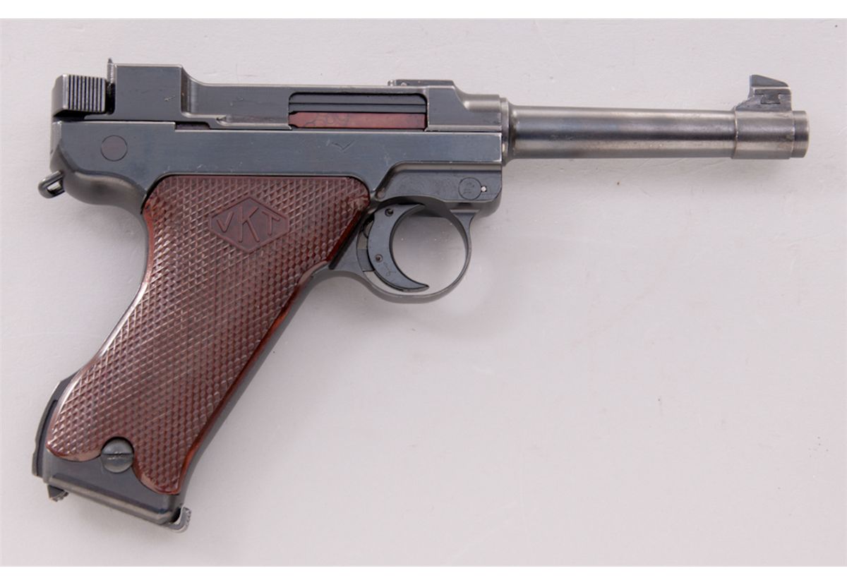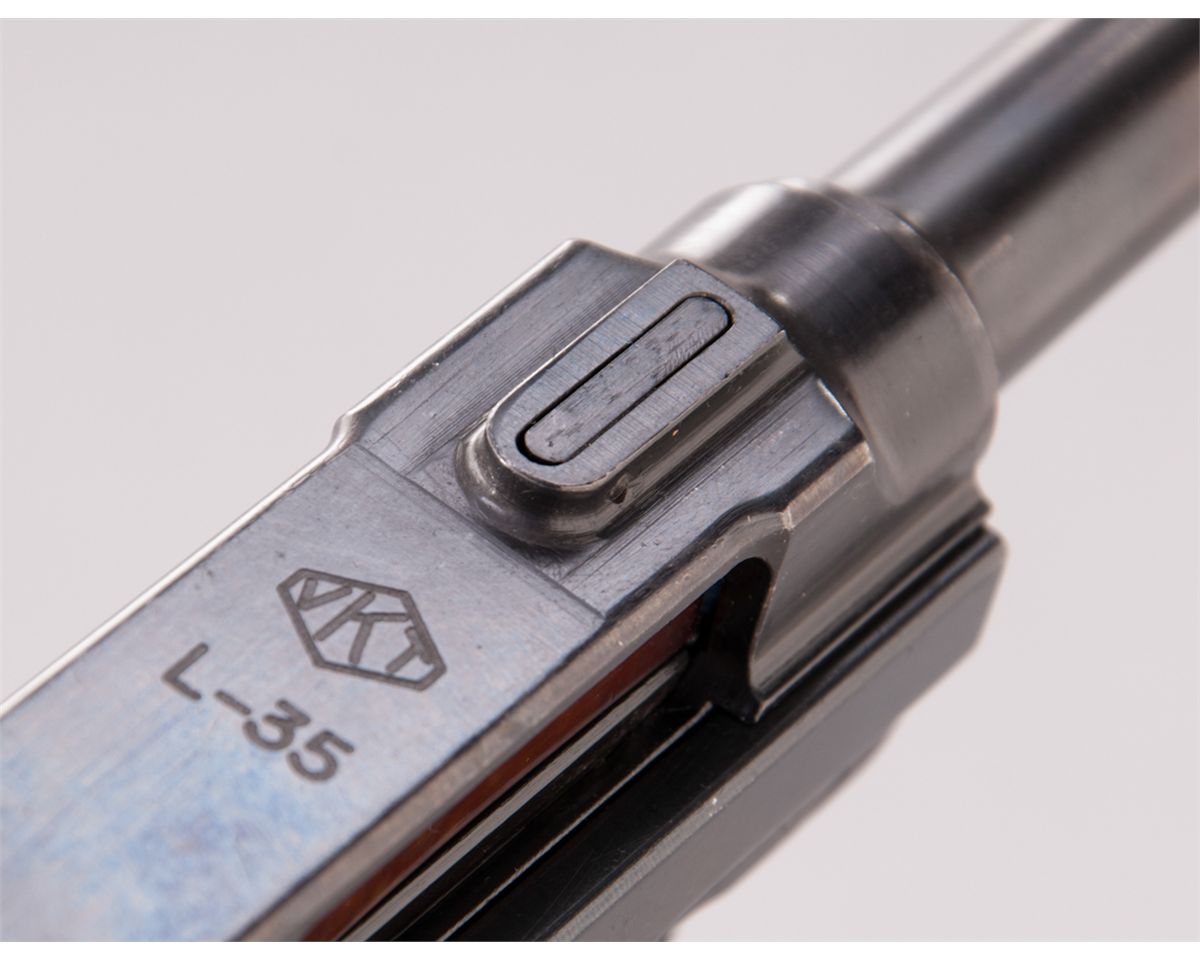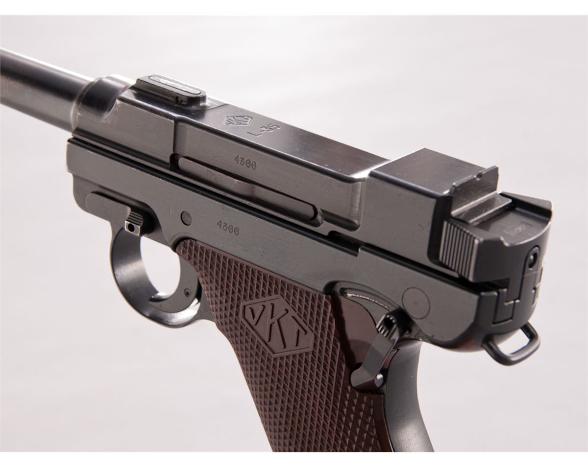 2nd Variation Lahti L-35 Semi-Automatic Pistol, #4366, 9mm, 4.7'' barrel, blue finish, brown checkered plastic grips with VKT logo, cut for shoulder stock, with rounded Loaded Chamber indicator; early narrow upper receiver marked ''VKT/L-35'' with yoke locking piece and protrusion eliminated; with etched letter ''E'' to right side of trigger and takedown latch. Produced from 1941-1943 in serial range 3700-4700, with estimated production approx. 1000. All Lahti pistols were uniquely designed with a slide accelerator to aid in their operation in severe cold weather. This type pistol, as well as the First Variation, was used in the Russo-Finnish Continuation War. Condition is excellent retaining approx. 98%+ Finnish military blue, with most of the losses as very minor thinning at high edges and some micro-scratching. Grips are crisp. Action is tight, bore is mirror bright. An excellent example of a very difficult-to-obtain European service pistol with only approx. 1000 produced. Est.: $2,000-$3,000. (C&R)