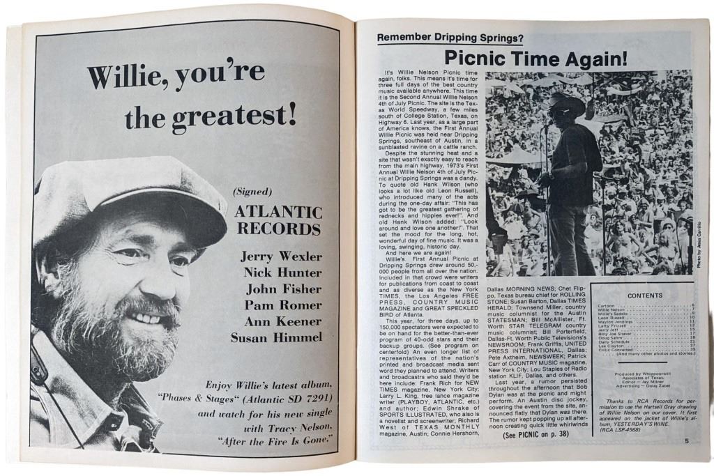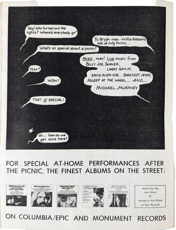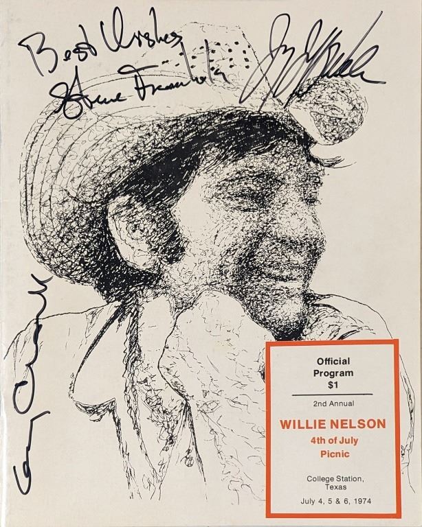 Second 4th of July Picnic College Station Texas 1974. Signed by Guy Clark, Steve Fromholz, & Jerry Jeff Walker. Was on display at the Country Music Hall of Fame in Nashville. From Ray Benson's personal collection.