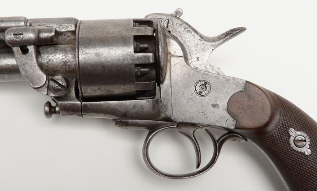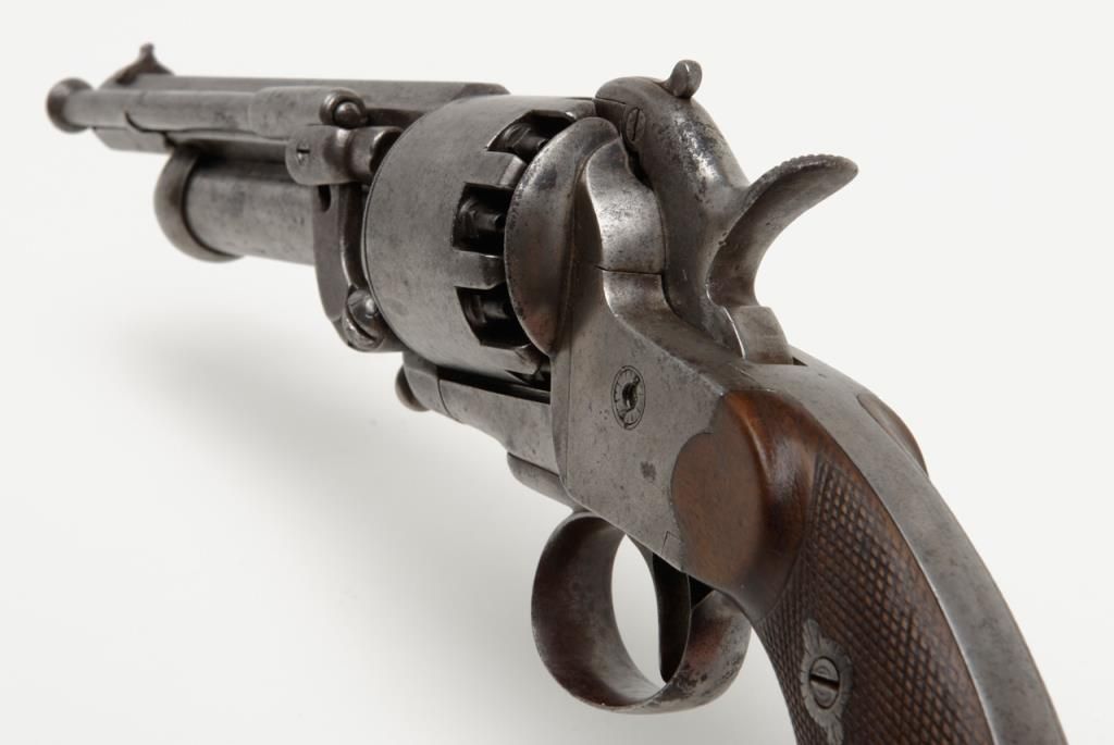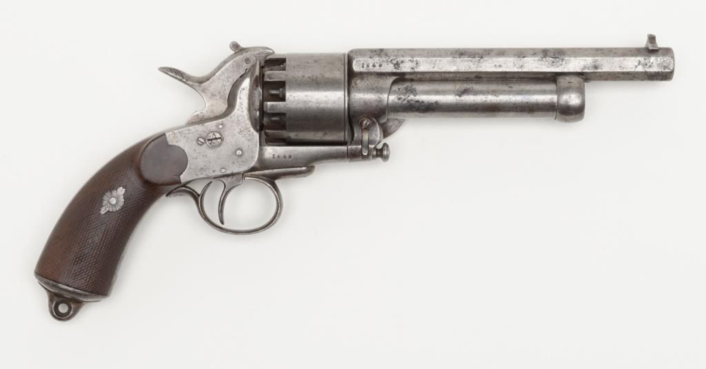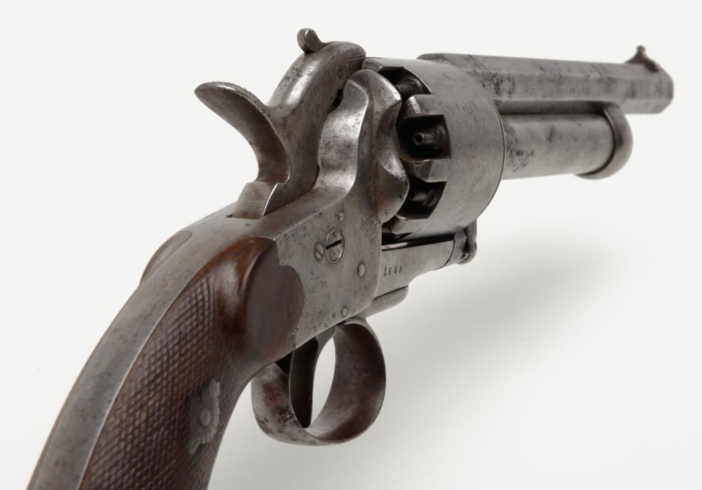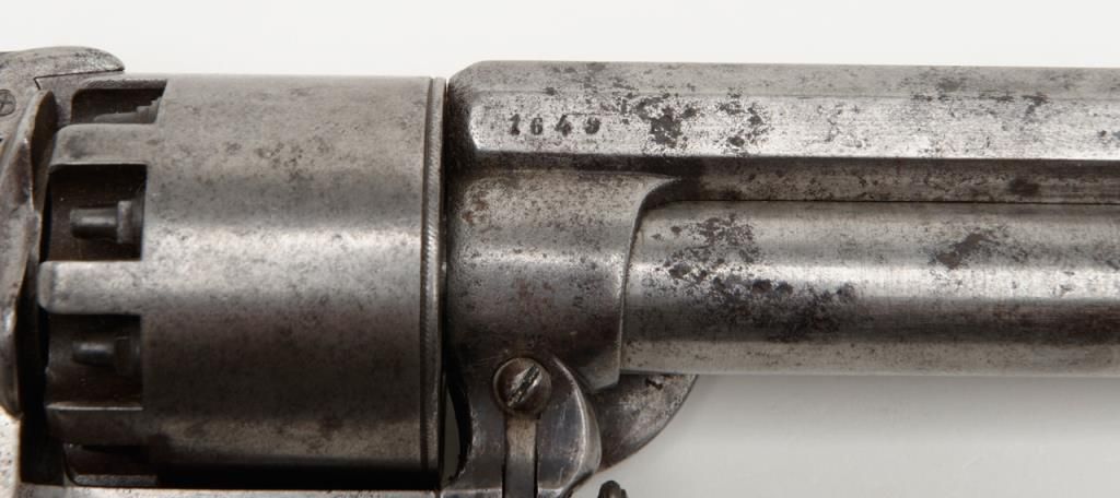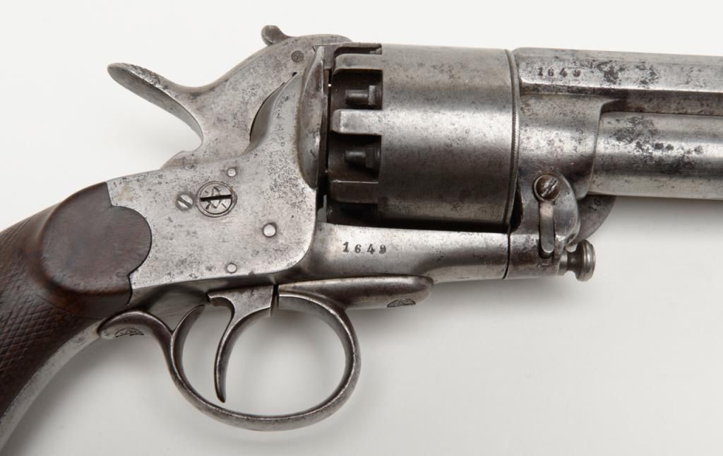 2nd model Le Mat revolver showing, .42 caliber 9 shot cylinder revolving on axis around smoothbore 5” barrel of .63 caliber for firing shot. This pistol is in the Confederate serial number range and serial number is 1649. The barrel shows aengraved script address which is crisp and fully legible. The metal surfaces show some light to moderate scattered pitting and erosion with a couple of small areas of slightly heavier pitting on the right side of the barrel. All matchingvisible serial numbers. The left side of the hammer shows the initial N. The loading lever catch and spring are all original as is the movable firing pin. The grips are very good with fairly sharp checkering and just slight edge wear. The action works well and the interior is very good with strong rifling. Refer Flayderman 10 – 013. . The collection of William A. Gary consigned by his estate. Est.: $9,000-$18,000
