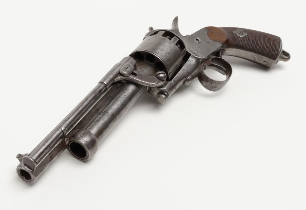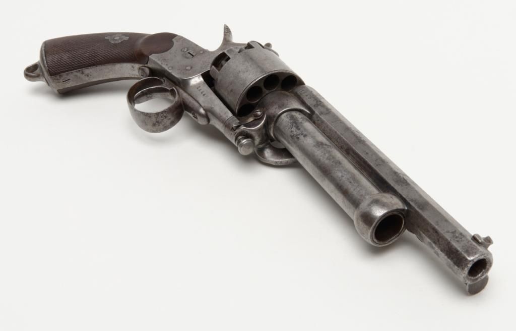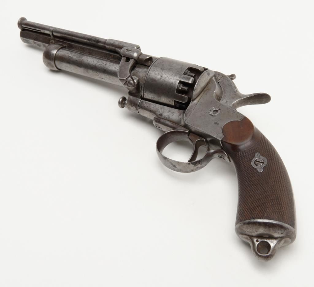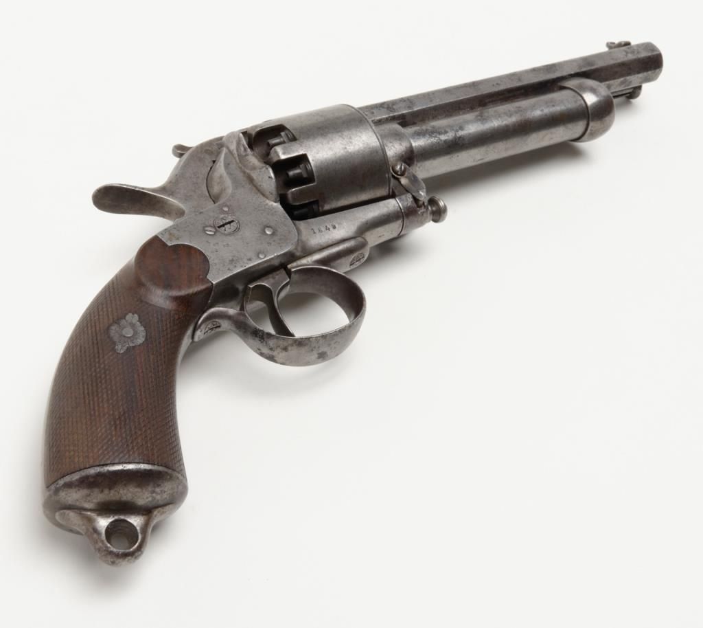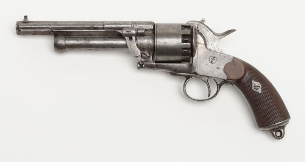2nd model Le Mat revolver showing, .42 caliber 9 shot cylinder revolving on axis around smoothbore 5” barrel of .63 caliber for firing shot. This pistol is in the Confederate serial number range and serial number is 1649. The barrel shows aengraved script address which is crisp and fully legible. The metal surfaces show some light to moderate scattered pitting and erosion with a couple of small areas of slightly heavier pitting on the right side of the barrel. All matchingvisible serial numbers. The left side of the hammer shows the initial N. The loading lever catch and spring are all original as is the movable firing pin. The grips are very good with fairly sharp checkering and just slight edge wear. The action works well and the interior is very good with strong rifling. Refer Flayderman 10 – 013. . The collection of William A. Gary consigned by his estate. Est.: $9,000-$18,000