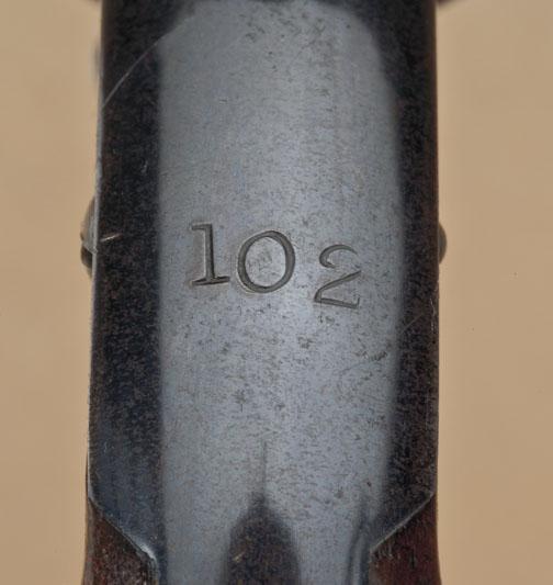 2nd model Schofield, .45 Schofield caliber single-action revolver, U.S. martially marked, blue finish, serial #6928, numbered “102” behind hammer, and one of a number identified to San Francisco PoliceDepartment. An article by Charles W. Pate entitled The San Francisco Police S&W Schofield discusses in depth the identification of these revolvers which are rack marked and to summarize, he states ‘300Schofield revolvers were provide to California in 1877’. The pistol remains in fine to near excellent original condition with 75-85% original bright blue, some slight flaking, and areas where the blue has lifted show a light grey to brown patina. Super-sharp edges and markings. Very crisp overall, with 75-85% case hardening on hammer and triggerguard with some good rainbow hues. Good action, tight at the latch,excellent bore. Back of cylinder has not been relieved for .45 ACP cartridges as many often are. Matching cylinder number with all correct inspections, and cartouche wood grips show “DAL” and “1877” on left, “CW” on