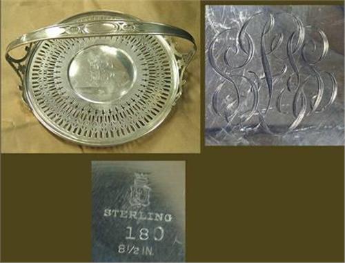 2oz Sterling pierced canapé server with handle. Ornate monogram in center of plate. Stands 4" tall to handle and measures 8 1/2" across