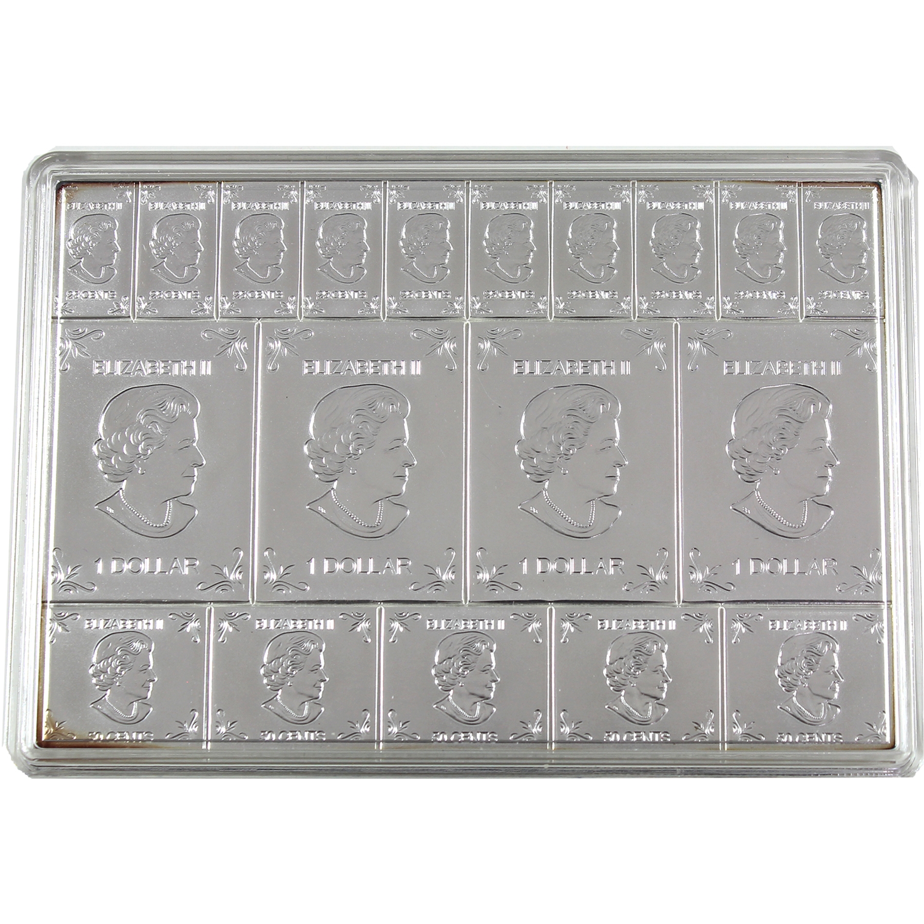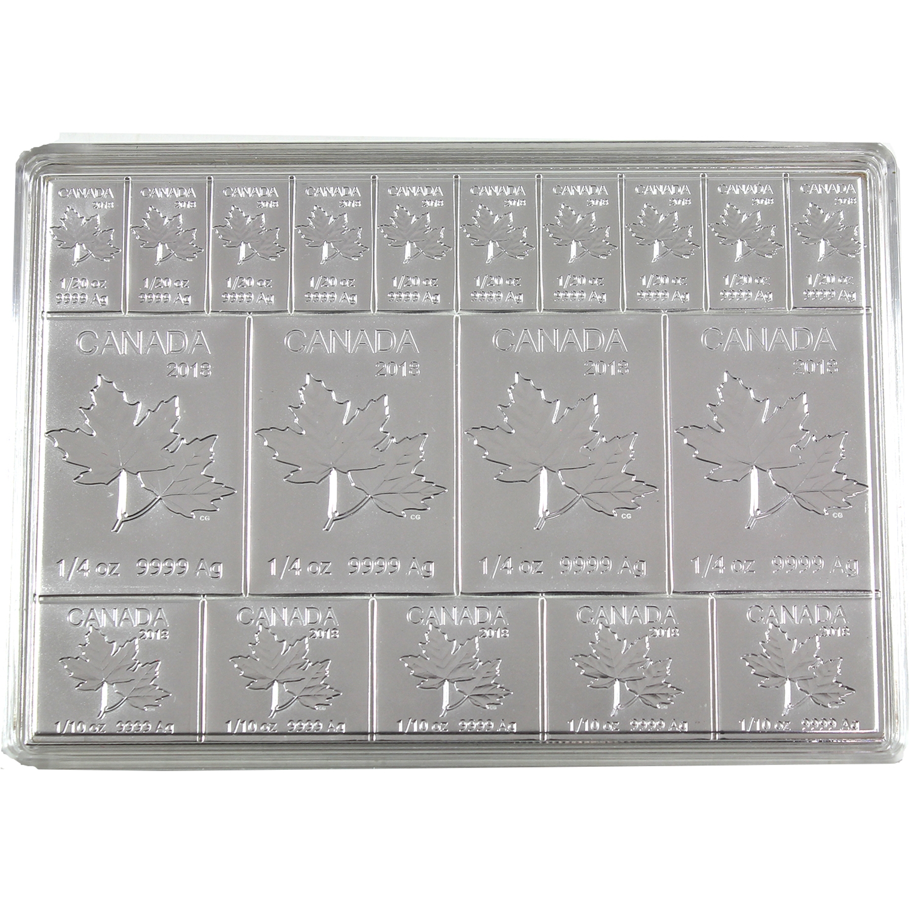 This unique fractional bar features 3 different, smaller bar weights, arranged in rows with the largest type in the middle. There are 10 1/20 oz bars, 5 1/10 oz bars and 4 1/4 oz bars within the bar's design. (Tax Exempt)