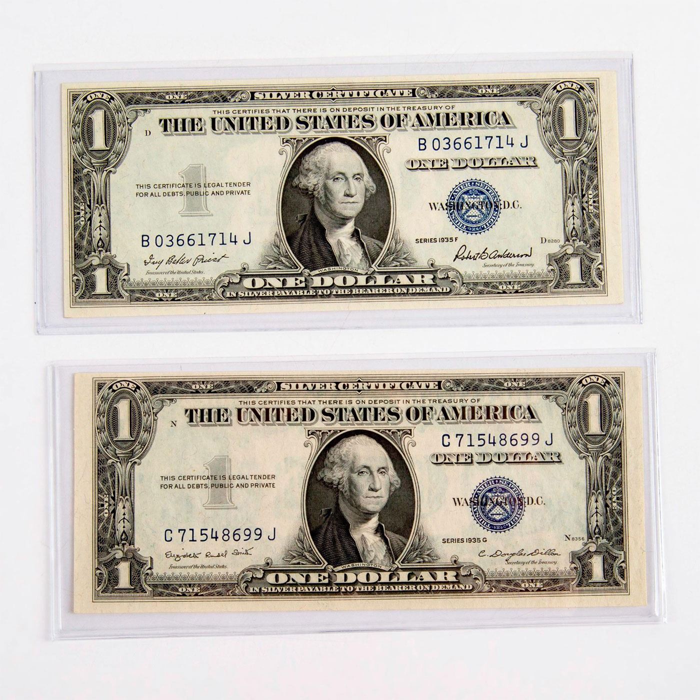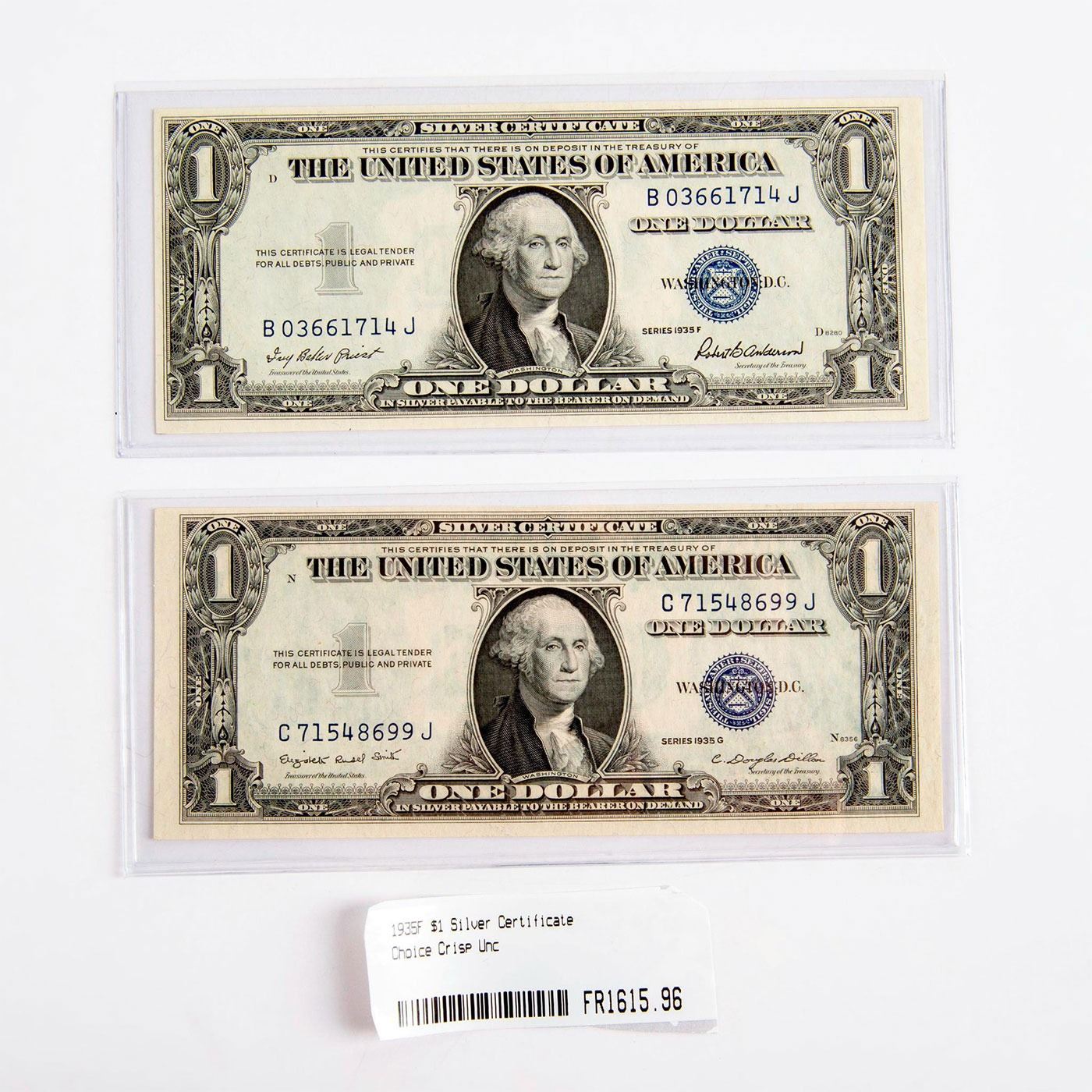 Crisp Choice Uncirculated. Serial Number B03661714J and C71548699J. Small-size Silver Certificates were issued with series dates of 1928, 1934, 1935, and 1957