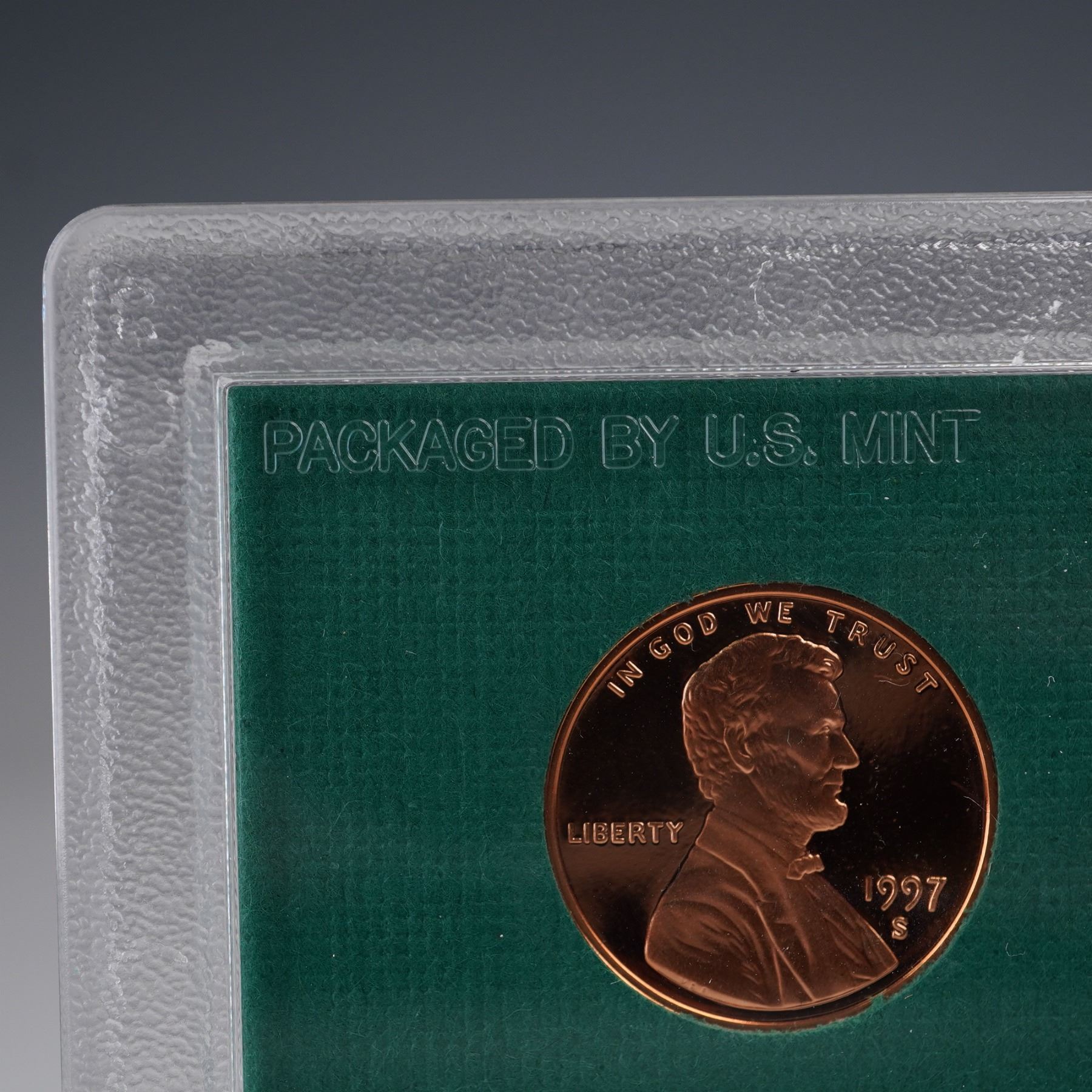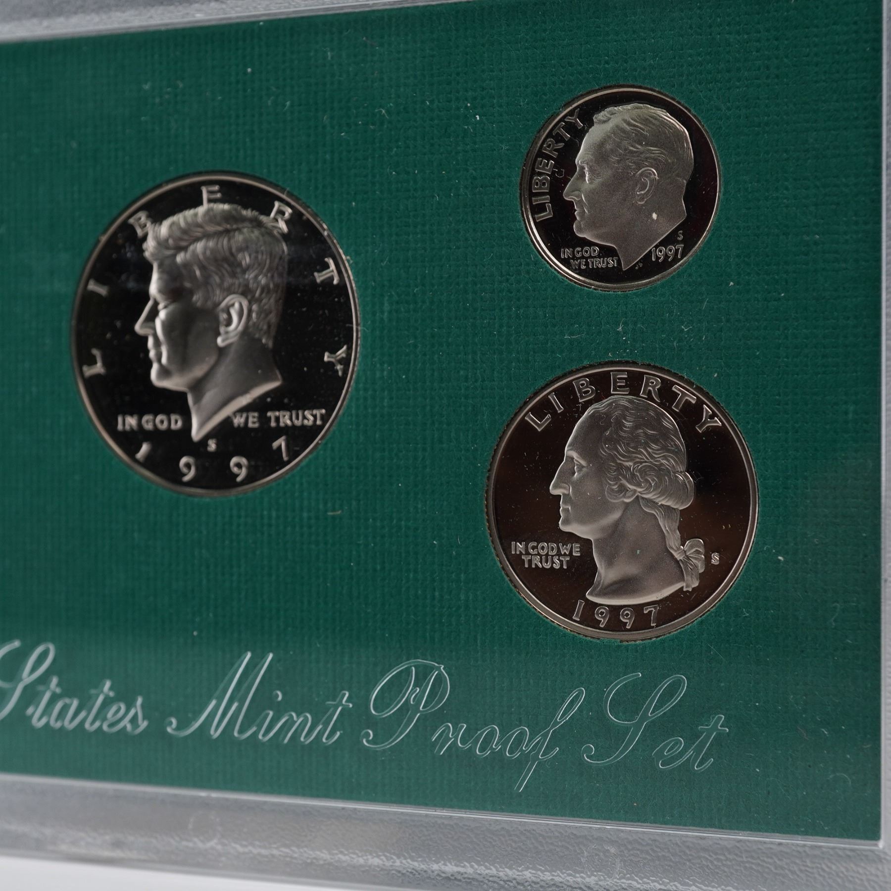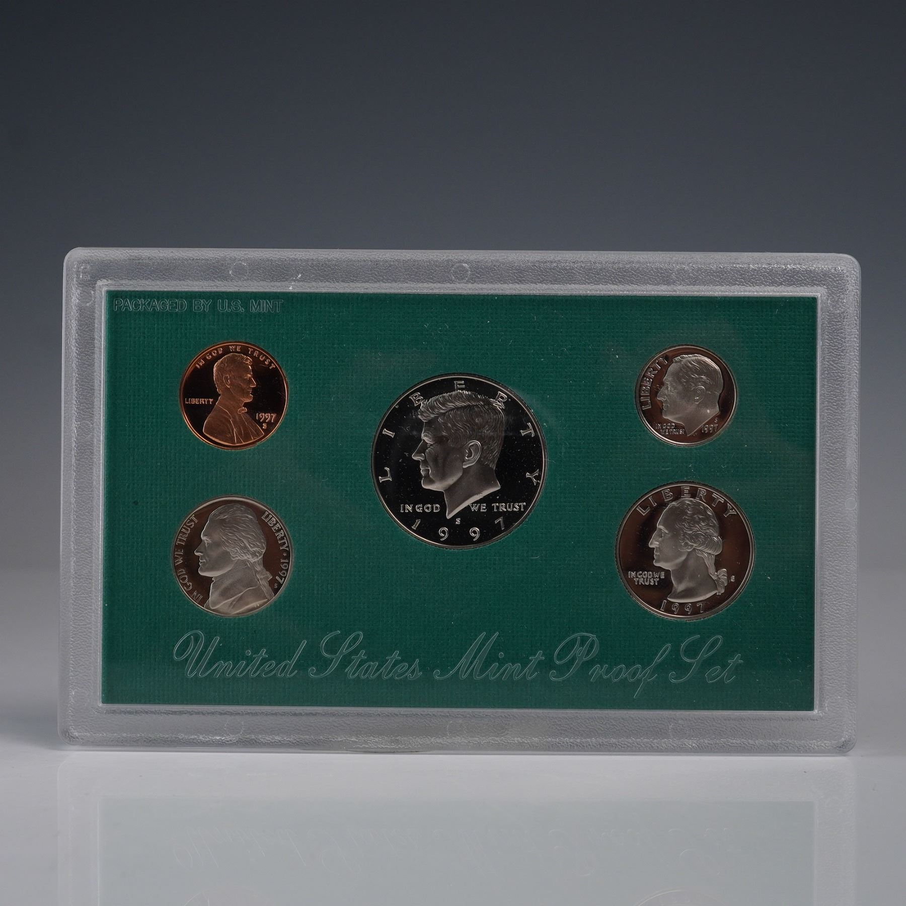 This two piece collection includes both the standard and silver proof sets issued by the United States Mint in 1997 each struck at the San Francisco Mint and bearing the "S" mintmark. The standard proof set features five coins; the cent, nickel, dime, quarter, and half dollar. The coins obverse of this set includes Lincoln, Jefferson, Roosevelt, Washington, and Kennedy, inscribed with "LIBERTY", "IN GOD WE TRUST", dated "1997", and "S" for the San Francisco Mint origin. The reverse inscribed with Lincoln Memorial, Monticello, Torch, Olive Branch, Oak Tree, and Heraldic Eagle "UNITED STATES OF AMERICA", "E PLURIBUS UNUM" and the type of coin. The Silver Proof Set features five coins; the dime, cent, nickel, quarter, and the half dollar. The coins obverse of this set also includes Lincoln, Jefferson, Roosevelt, Washington, and Kennedy, inscribed with "LIBERTY", "IN GOD WE TRUST", dated "1997", and "S" for the San Francisco Mint origin and the reverse inscribed with Lincoln Memorial, Monticello, Torch, Olive Branch, Oak Tree, and Heraldic Eagle with "UNITED STATES OF AMERICA", "E PLURIBUS UNUM" and the type of coin. Housed in their original government issued holders for authentication and protection and labeled "UNITED STATES MINT PROOF SET" and "PACKAGED BY U.S. MINT" on the top left corner of reverse of the holder. Holders measure: 5.25"L x 0.25"W x 3.5"H. Largest diameter of coin (half dollar): 30.61 mm. This item has its original boxes. Boxes measure: 5.5"L x 0.25"W x 3.5"H. Certificate of Authenticity included.