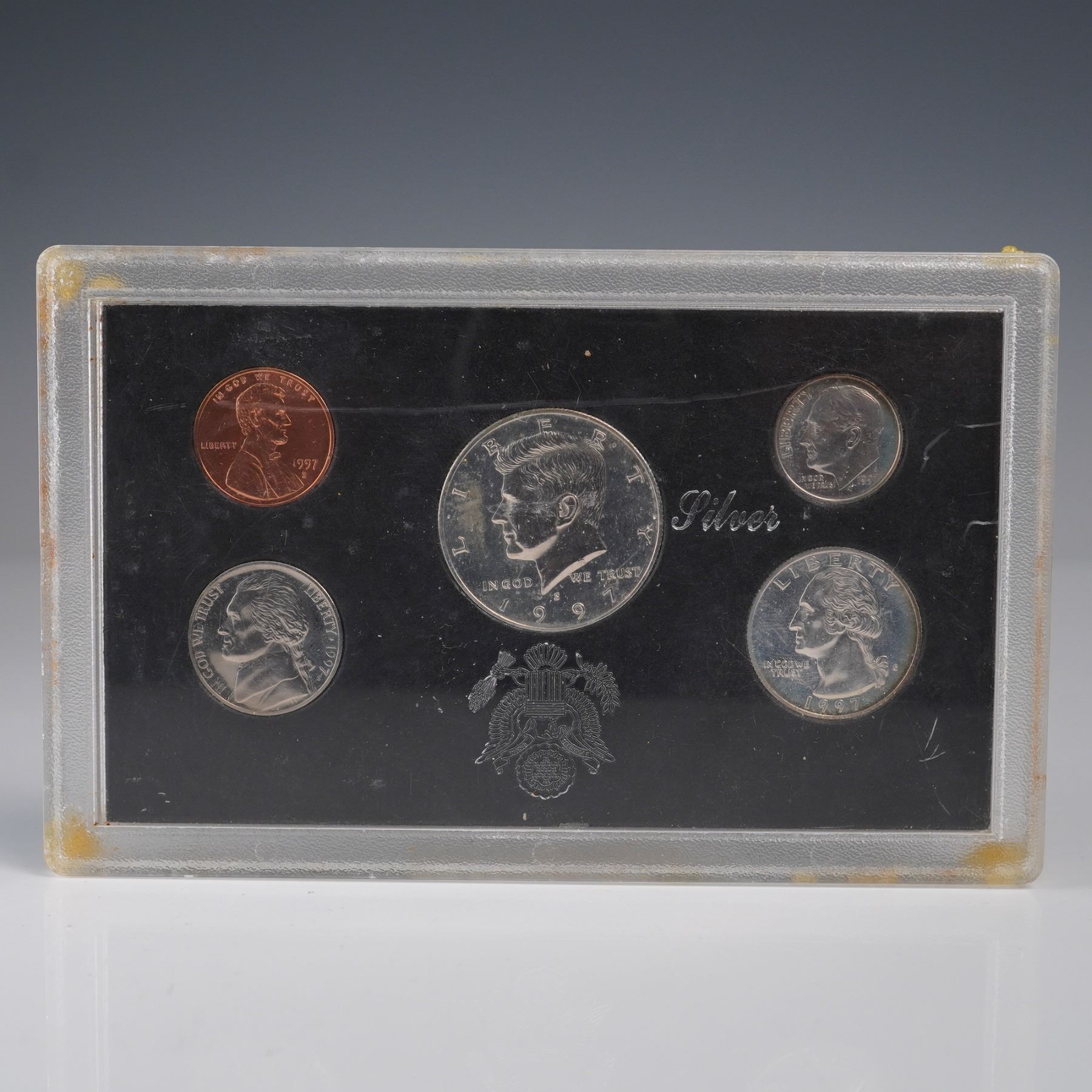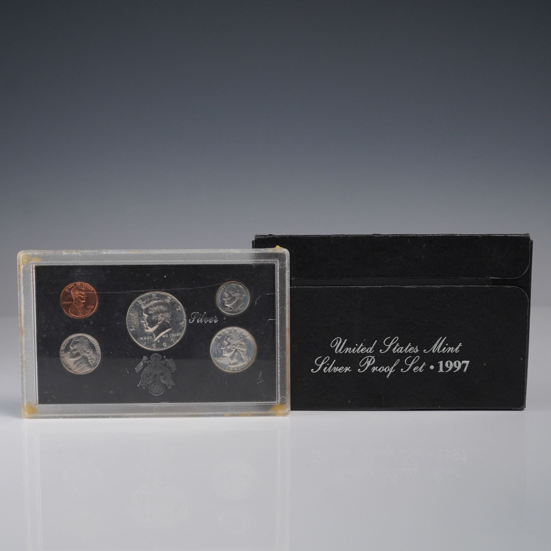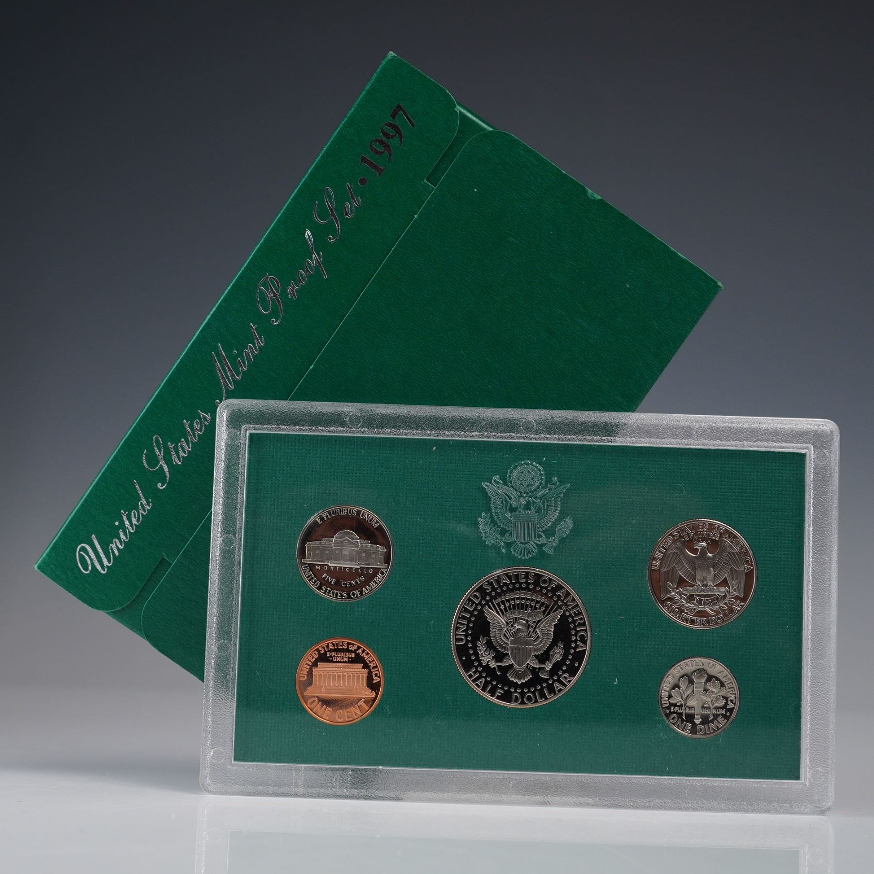 This two piece collection includes both the standard and silver proof sets issued by the United States Mint in 1997 each struck at the San Francisco Mint and bearing the "S" mintmark. The standard proof set features five coins; the cent, nickel, dime, quarter, and half dollar. The coins obverse of this set includes Lincoln, Jefferson, Roosevelt, Washington, and Kennedy, inscribed with "LIBERTY", "IN GOD WE TRUST", dated "1997", and "S" for the San Francisco Mint origin. The reverse inscribed with Lincoln Memorial, Monticello, Torch, Olive Branch, Oak Tree, and Heraldic Eagle "UNITED STATES OF AMERICA", "E PLURIBUS UNUM" and the type of coin. The Silver Proof Set features five coins; the dime, cent, nickel, quarter, and the half dollar. The coins obverse of this set also includes Lincoln, Jefferson, Roosevelt, Washington, and Kennedy, inscribed with "LIBERTY", "IN GOD WE TRUST", dated "1997", and "S" for the San Francisco Mint origin and the reverse inscribed with Lincoln Memorial, Monticello, Torch, Olive Branch, Oak Tree, and Heraldic Eagle with "UNITED STATES OF AMERICA", "E PLURIBUS UNUM" and the type of coin. Housed in their original government issued holders for authentication and protection and labeled "UNITED STATES MINT PROOF SET" and "PACKAGED BY U.S. MINT" on the top left corner of reverse of the holder. Holders measure: 5.25"L x 0.25"W x 3.5"H. Largest diameter of coin (half dollar): 30.61 mm. This item has its original boxes. Boxes measure: 5.5"L x 0.25"W x 3.5"H. Certificate of Authenticity included.