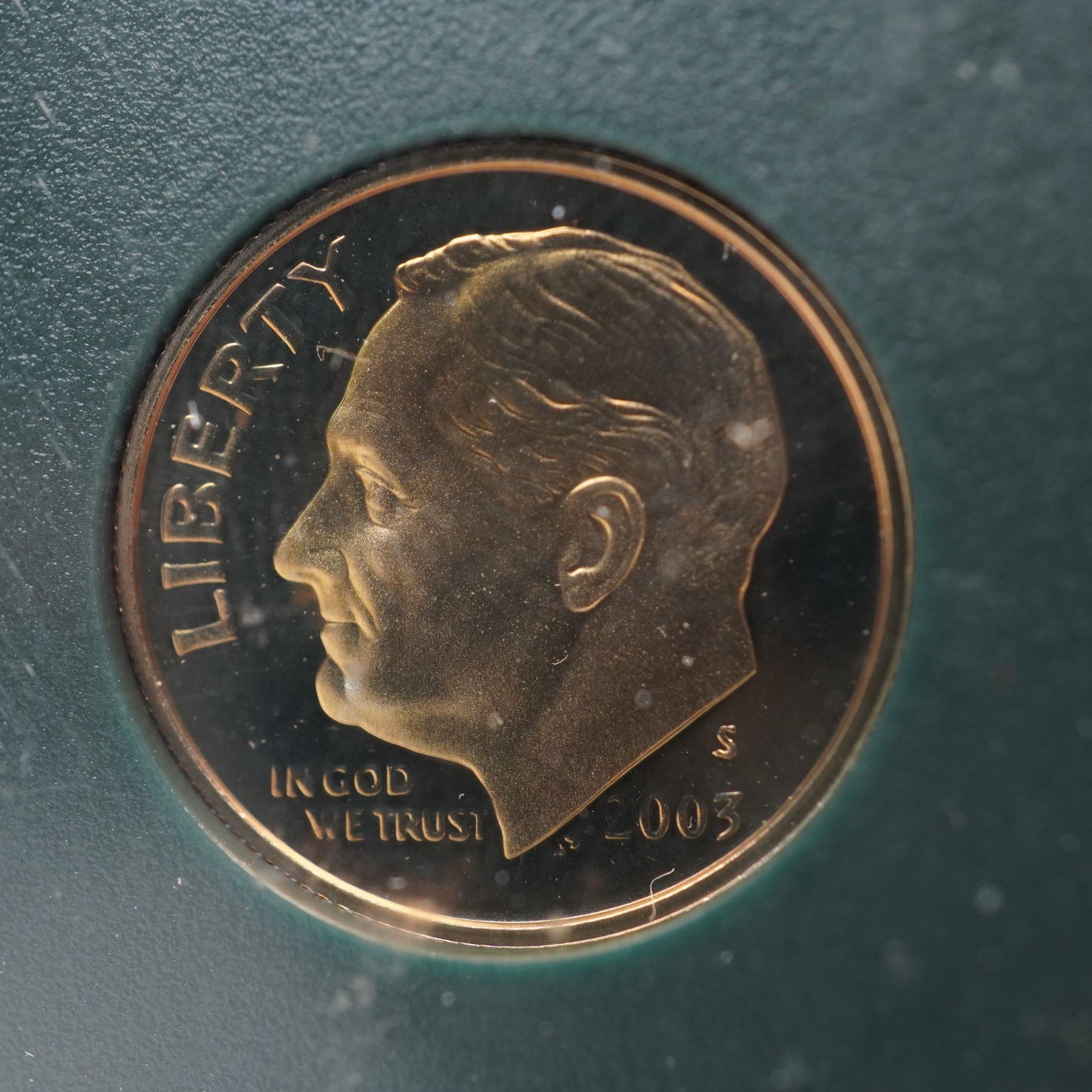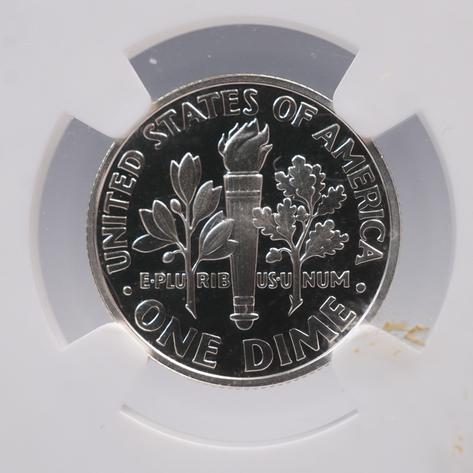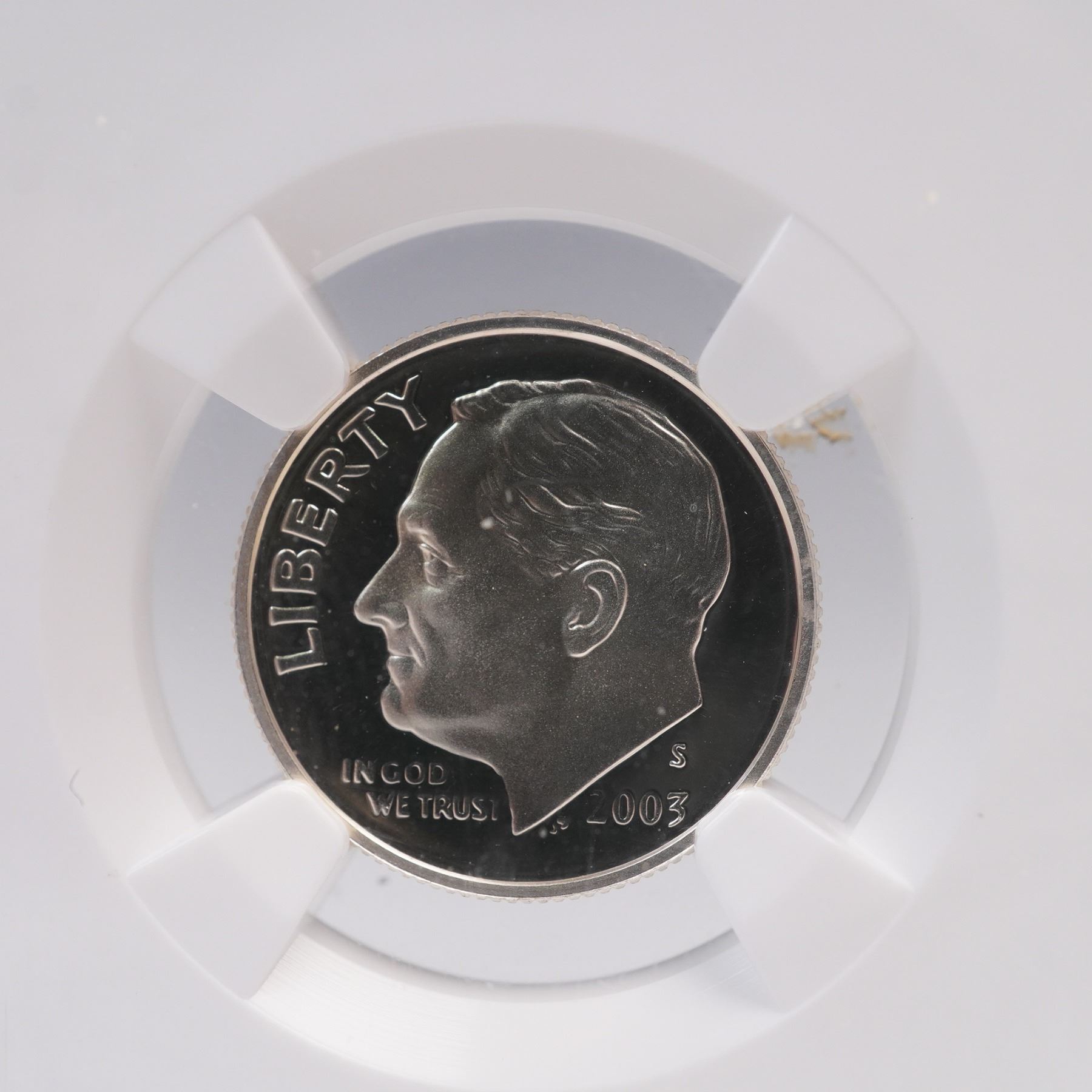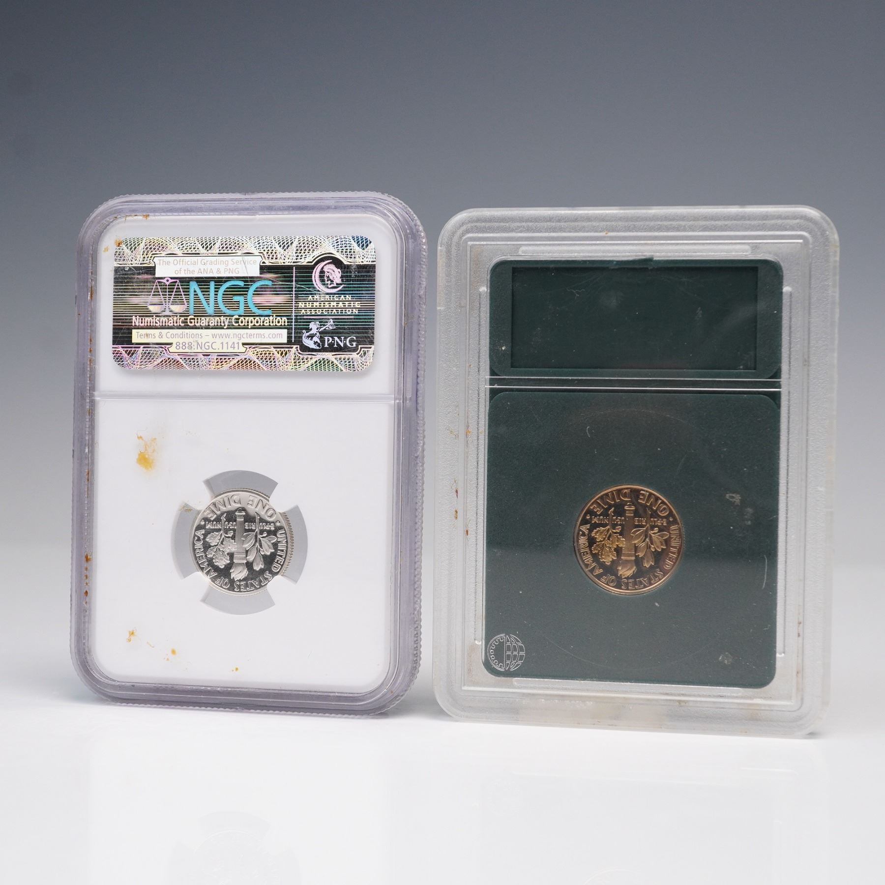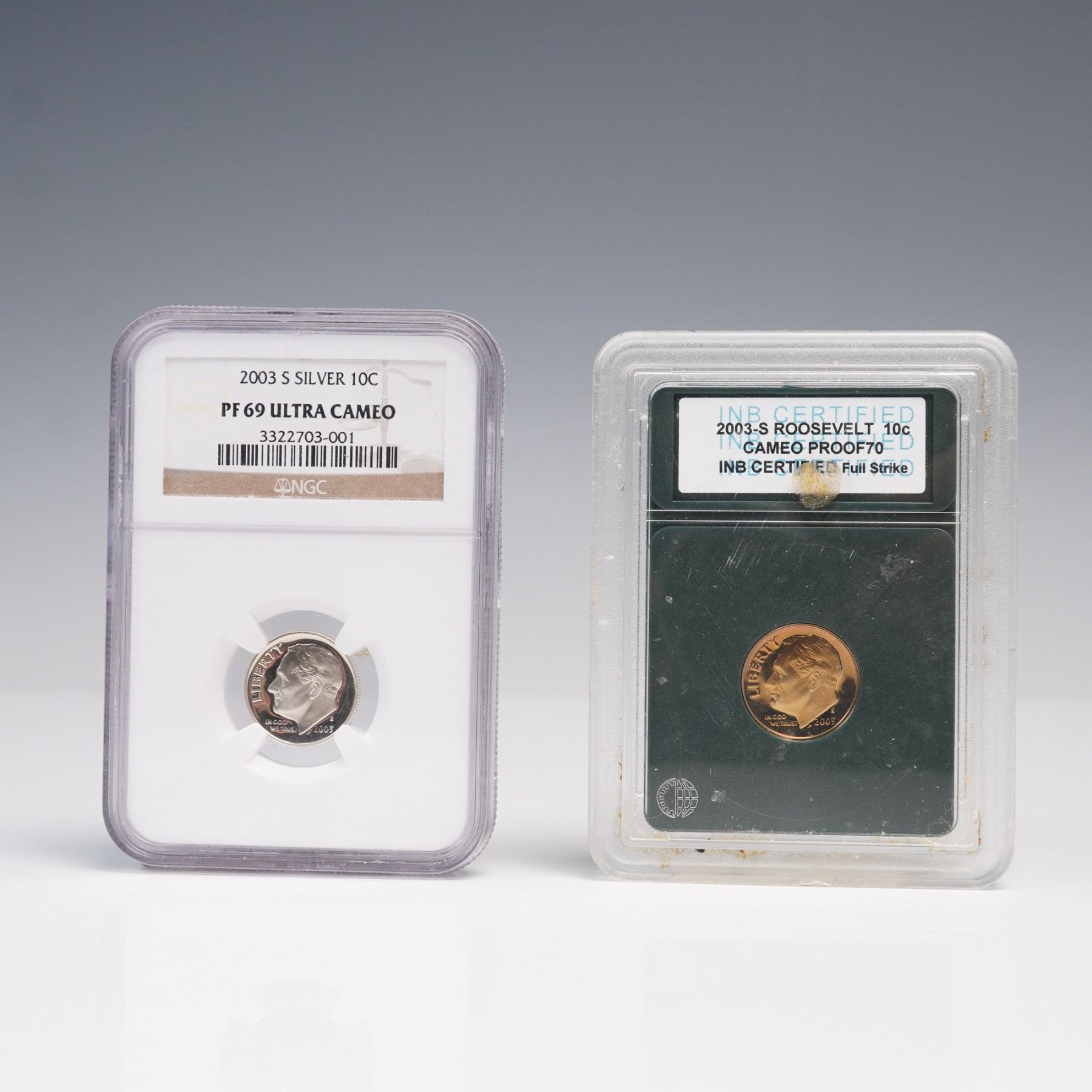 Two 2003-S Roosevelt Dimes, each professionally graded and encapsulated, are featured in this lot. One coin is certified by INB as Cameo Proof 70 and encased in its original INB Certified Full Strike holder. The other is certified by NGC as PF 69 Ultra Cameo and enclosed in an NGC holder. Both dimes are struck in proof quality and bear the S mintmark, indicating production at the San Francisco Mint. The obverse of each dime portrays the left-facing portrait of Franklin D. Roosevelt, the 32nd President of the United States, who served from 1933 to 1945. The portrait is accompanied by the inscriptions LIBERTY, IN GOD WE TRUST, and the date 2003, along with the "S" mintmark. The reverse design features a vertical torch flanked by an olive branch on the left and an oak branch on the right. This trio of symbols represents liberty, peace, and victory. Above the branches is the motto E PLURIBUS UNUM, and the surrounding legends include UNITED STATES OF AMERICA and ONE DIME. These coins highlight differences in third-party grading standards and encapsulation, with one designated Cameo Proof 70 by INB and the other designated Ultra Cameo PF 69 by NGC. INB Slab: 2.5"L x 0.5"W x 3.25"H. NGC Slab: 2.25"L x 0.5"W x 3.25"H. Coin diameter: 17.9mm.