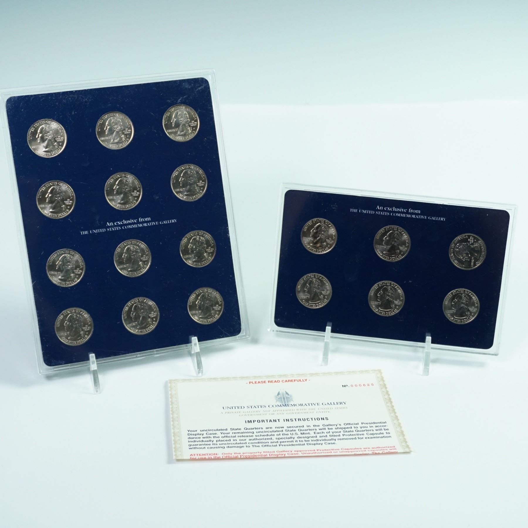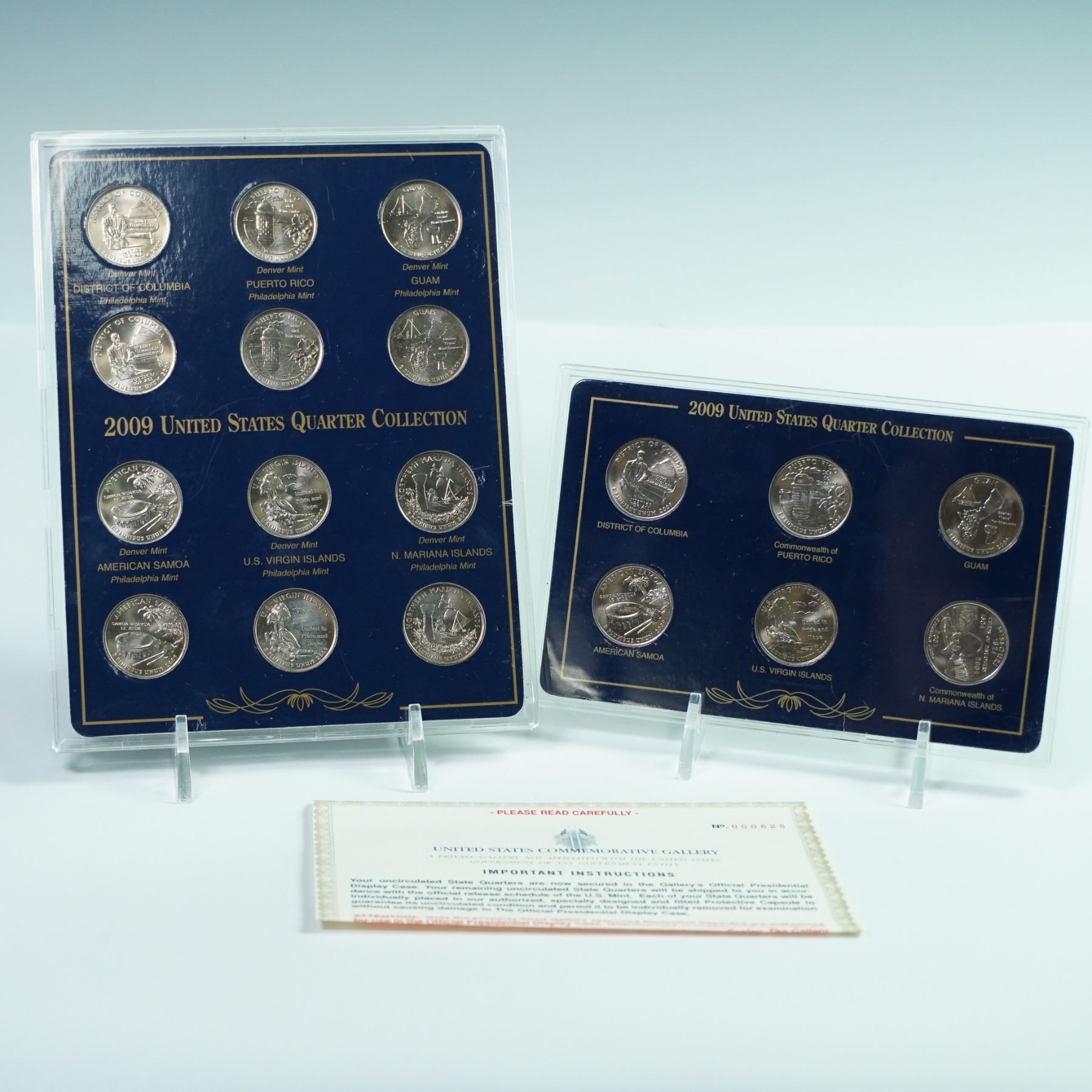 Two 2009 United States Quarter Collection sets issued by the United States Commemorative Gallery. Each set contains six commemorative state and territory quarters, presented in blue display holders with clear casing. The reverse sides feature designs honoring the District of Columbia, Puerto Rico, Guam, American Samoa, the U.S. Virgin Islands, and the Northern Mariana Islands. Each set includes quarters minted at both the Denver and Philadelphia Mints. Accompanied by an official certificate of authenticity detailing the uncirculated condition and origin of the coins. A well-preserved pair of collector's sets celebrating the final year of the U.S. State Quarters program. Largest set measures 5.5"L x 7"H.