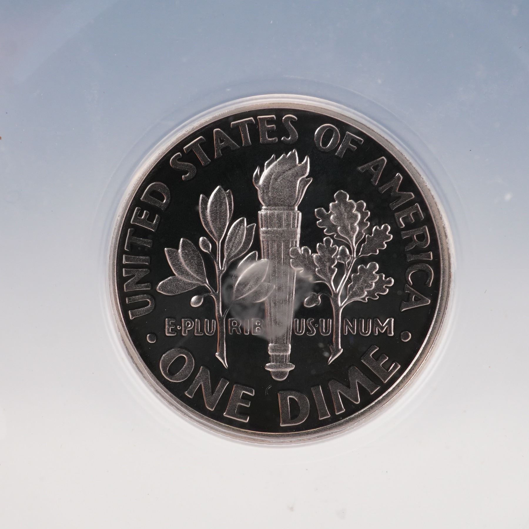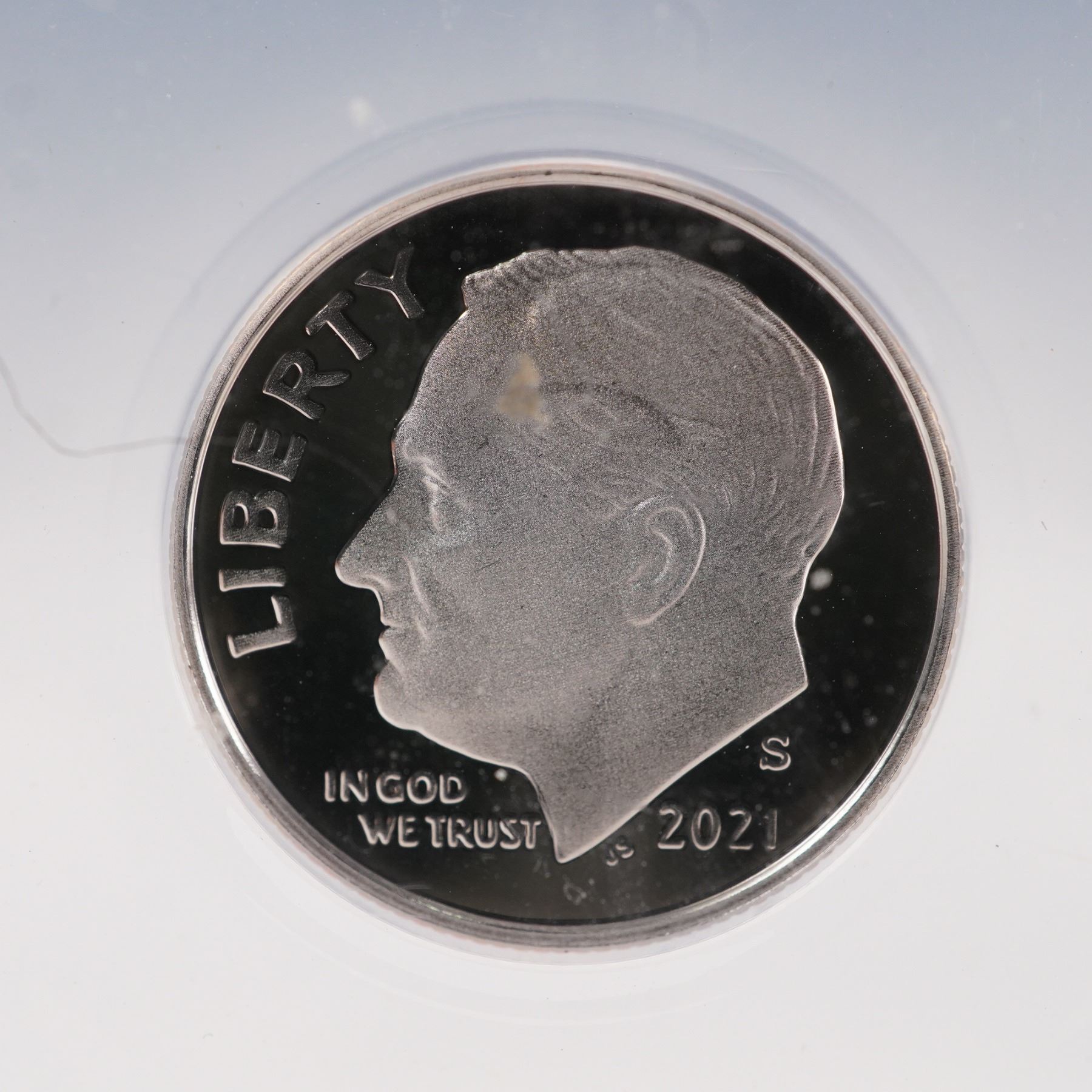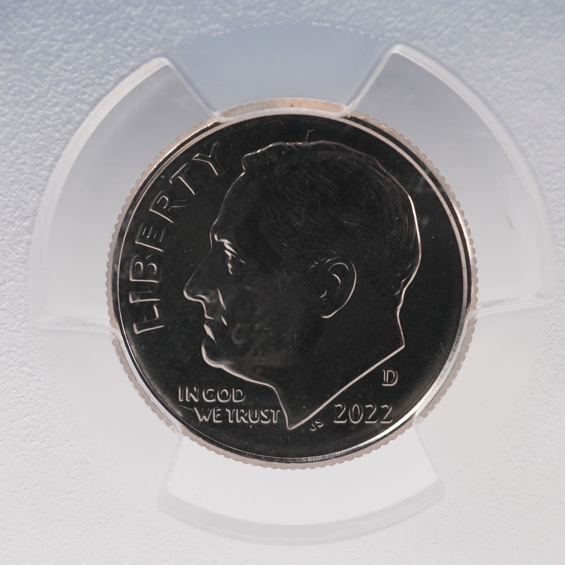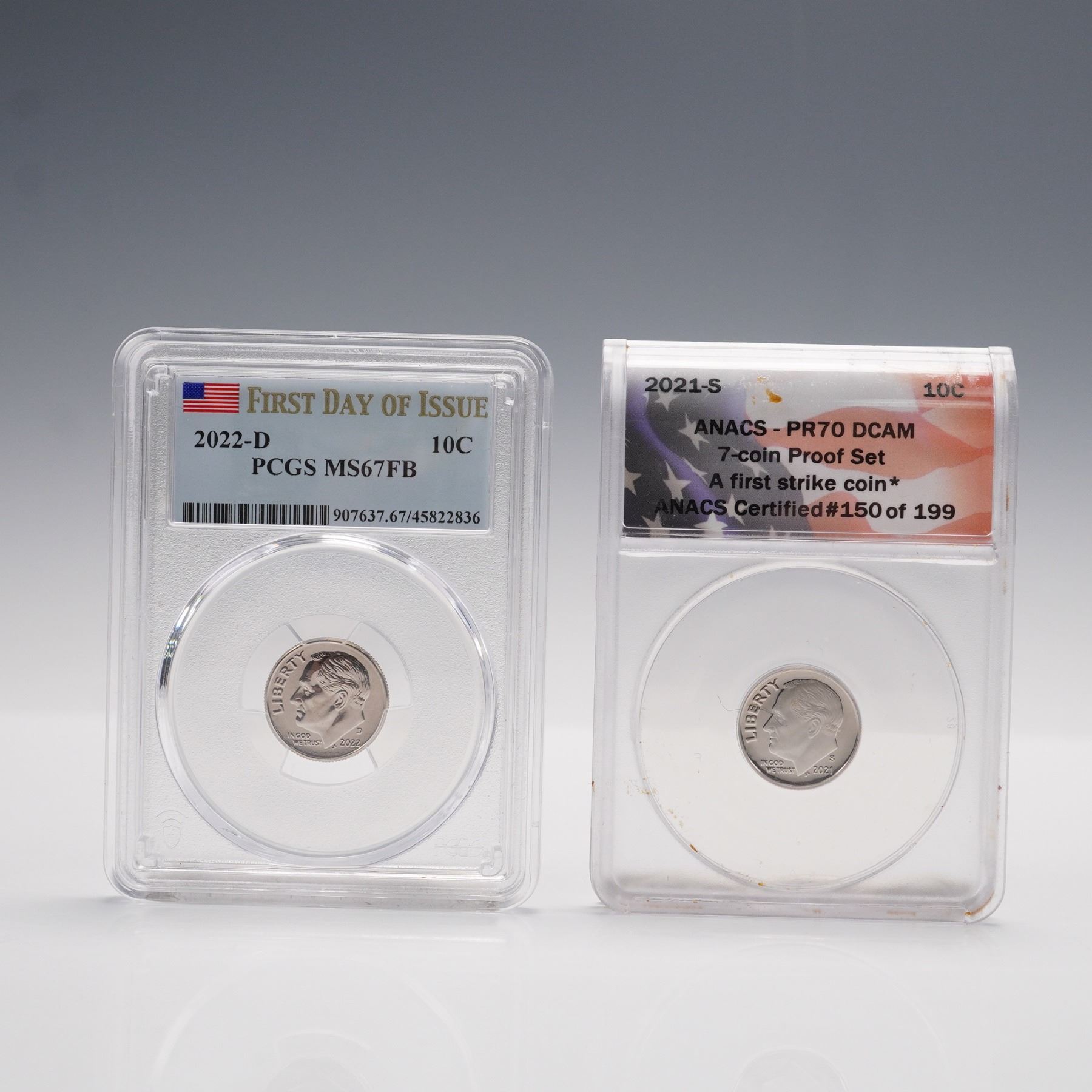 A two coin offering features a contrast of numismatic excellence from two different minting and certification authorities. The first specimen is a 2021-S Roosevelt dime struck at the San Francisco mint and graded PR70 DCAM (deep cameo) by ANACS, certified as a First Strike and part of a limited 7-coin proof set, numbered 150 of just 199 examples. The accompanying coin is a 2022-D Roosevelt dime certified MS67FB by PCGS and designated First Day of Issue. The face of both coins feature the portrait of Franklin D. Roosevelt facing left, the 32nd President of the United States from 1933 to his death in 1945, accompanied by the motto: IN GOD WE TRUST and surrounded with the lettering LIBERTY, while the reverse bears E PLURIB US UNUM, an olive branch, a torch, and an oak branch symbolize respectively peace, liberty, and victory and are surrounded with the face value and the lettering UNITED STATES OF AMERICA. Enclosed in graded slabs for further preservation and authentication. PCGS slab measures: 2.5"L x 0.25"W x 3.25"H. ANACS slab measures: 2.25"L x 0.25"W x 3.25"H. Coin's diameter: 17.91 mm.