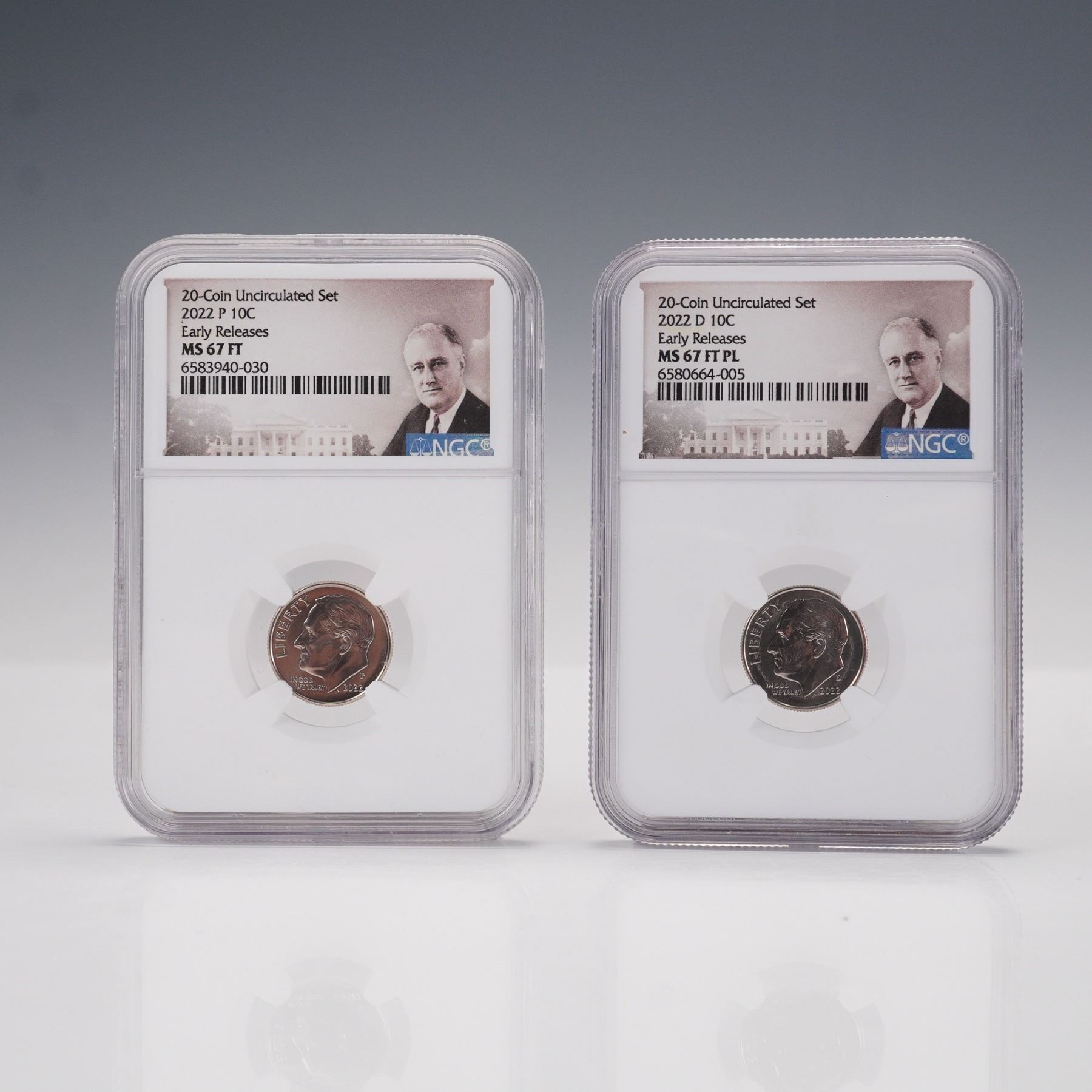 A matched pair of 2022 Roosevelt dimes from the official U.S. Mint Uncirculated Set, certified by NGC and designated as "Early Releases." Includes a 2022-P dime graded MS67 FT (Full Torch) minted in the Philadelphia mint and a 2022-D dime graded MS67 PL FT (Proof like), each encapsulated with a specialized White House label. The obverse of each coin engraved with the portrait of Franklin D. Roosevelt facing left, the 32nd President of the United States from 1933 to his death in 1945, accompanied by the motto: IN GOD WE TRUST and surrounded with the lettering LIBERTY. The reverse featuring ahead of the motto E PLU RIB US UNUM, an olive branch, a torch, and an oak branch symbolize respectively peace, liberty, and victory and are surrounded with the face value and the lettering UNITED STATES OF AMERICA. Enclosed in a graded NGC label for further preservation and authentication. Slabs measure: 2.25"L x 0.25"W x 3.25"H. Coin's diameter: 17.91 mm.