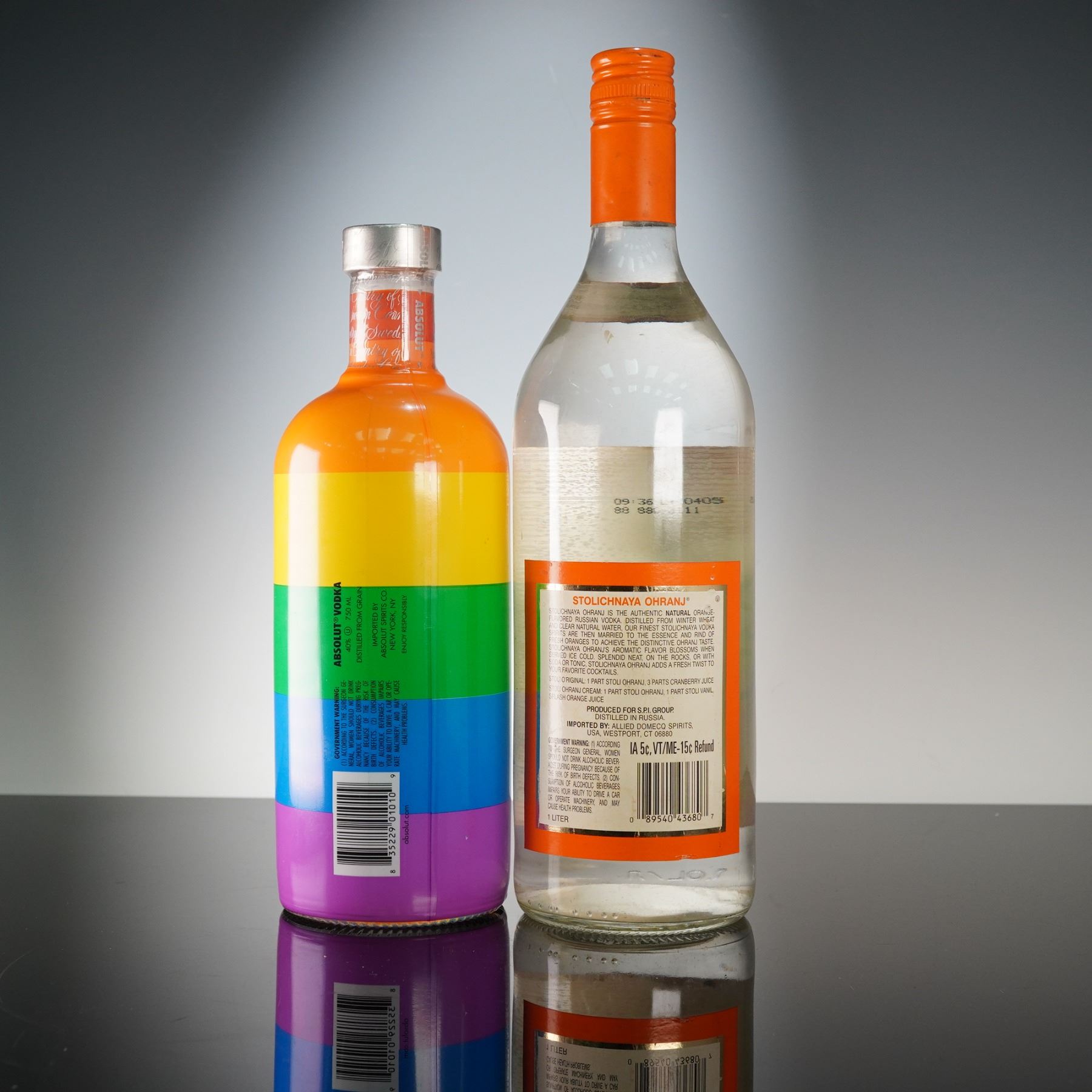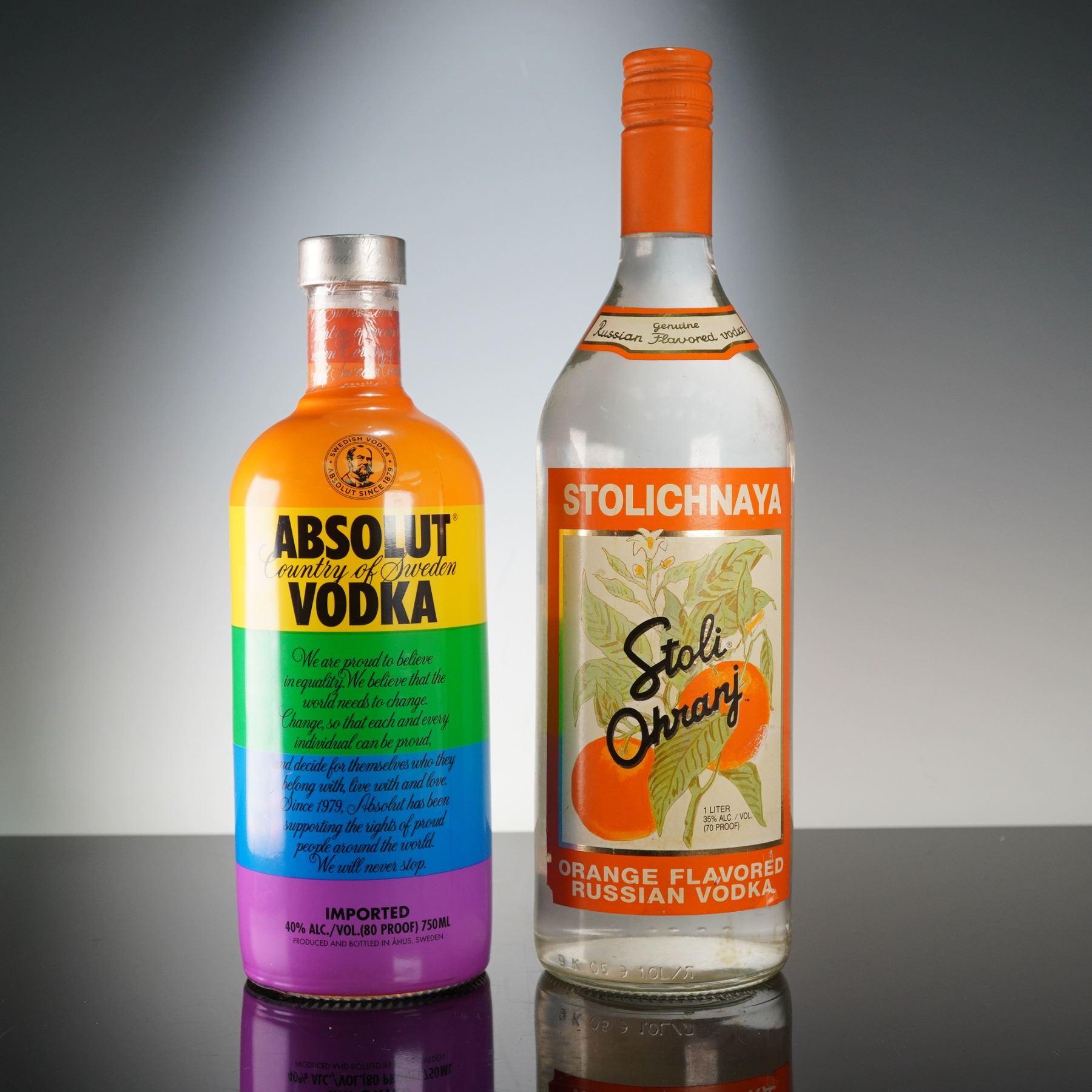 Two premium vodka bottles, each celebrated for its craftsmanship and cultural resonance. The Absolut Pride Edition, produced in Ahus, Sweden, features the brand's signature smooth Swedish vodka encased in a vibrant rainbow striped bottle symbolizing unity and equality. Accompanying it is the Stolichnaya Ohranj, a genuine orange-flavored vodka that harmonizes natural citrus essence with the refined grain base for a bright, aromatic finish. Absolut vodka contains 40% alcohol (80 proof) and Stolichnaya contains 35% alcohol (70 proof). In-house shipping is not available for this lot. Winning Bidders will have to arrange to pick up their purchases at the Lion and Unicorn Auction Studios at 200 Oakwood Ln. Suite 200 Hollywood, Florida 33020, or make arrangements with their own third-party shipper. A local third-party shipper that can be contacted directly for a domestic shipping quote is: First Class Shipping Center 7826 NW 44th Street Sunrise, FL 33351 Tel: 754-800-7674 Fax : 954-999-5166 Email: 1shippingcenter@gmail.com URL: https://www.1shippingcenter.com