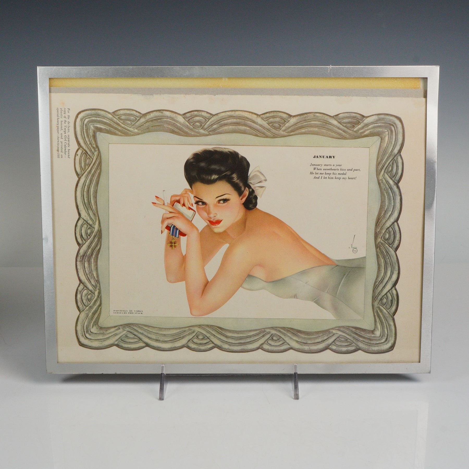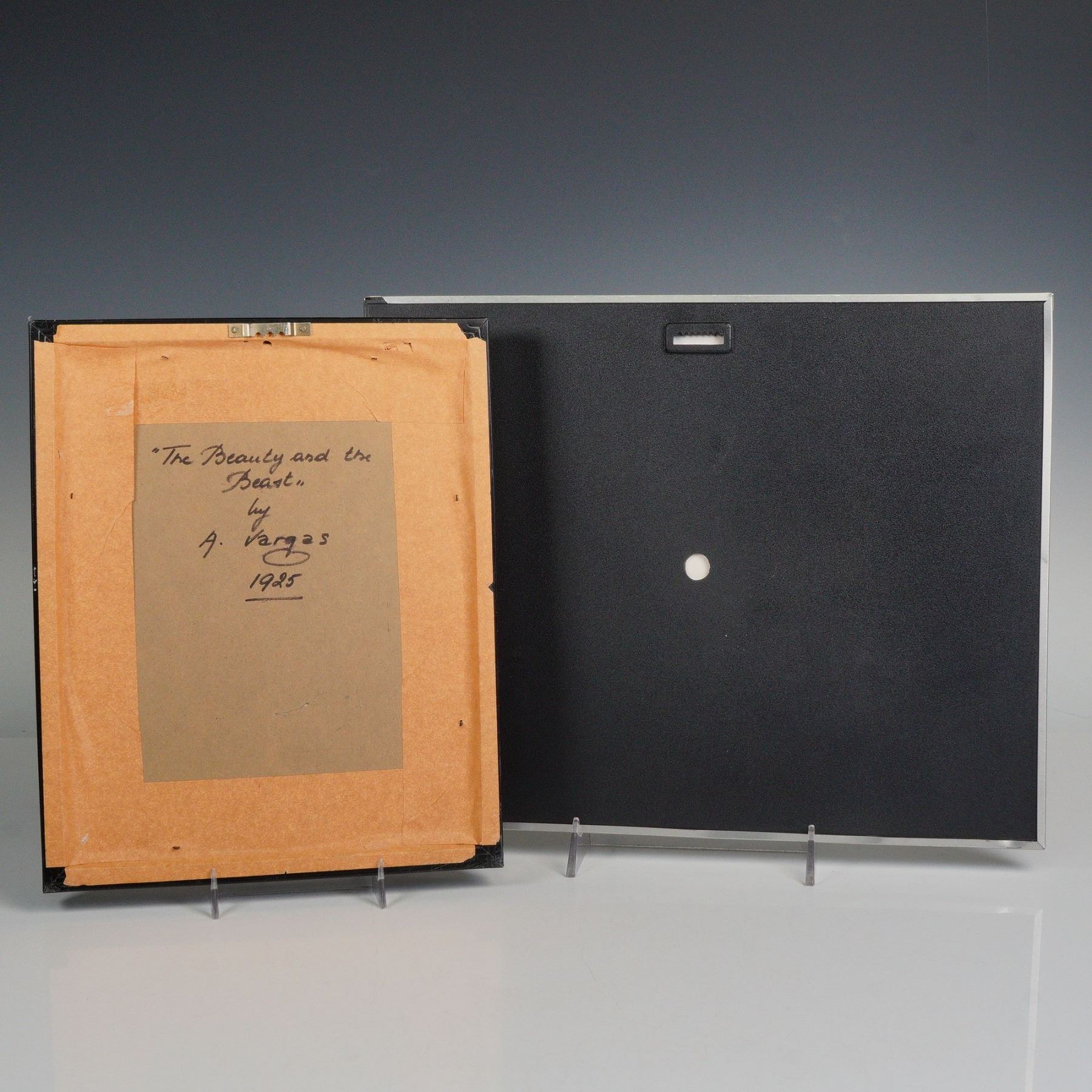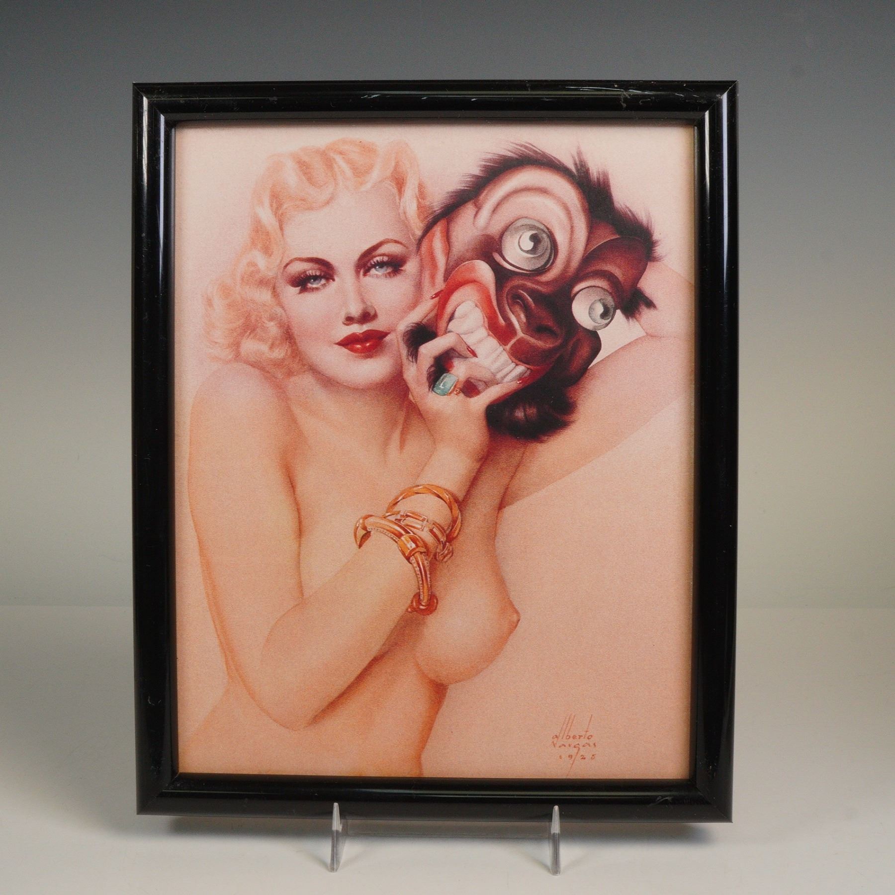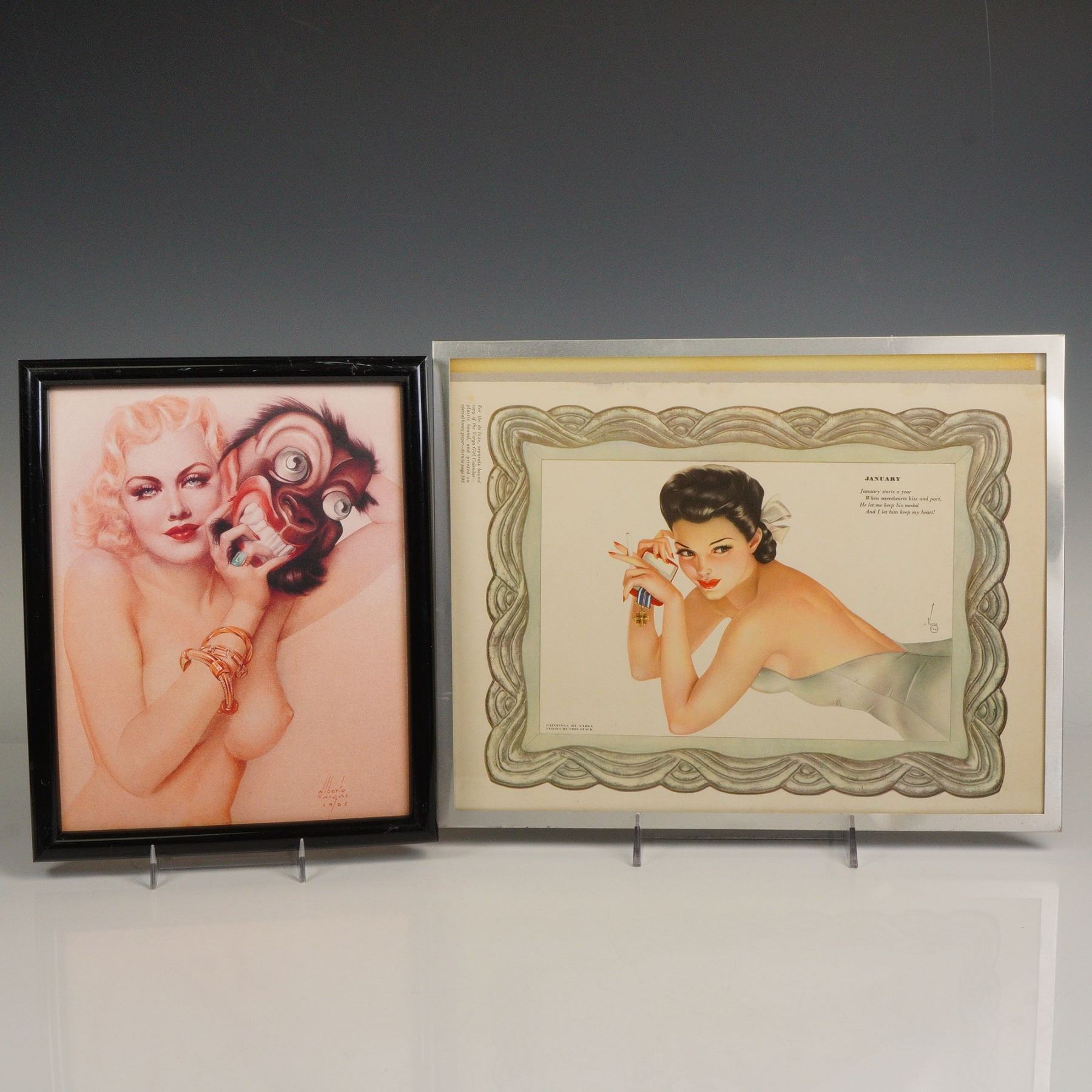 Pair of framed artworks attributed to famed pin-up artist Alberto Vargas. The first, titled Beauty and the Beast (dated 1925 on verso), depicts a glamorous blonde holding a caricature mask - a classic Vargas image showcasing his refined airbrush technique and sensuous Art Deco style. The second is a Varga Girl calendar page for January, featuring a brunette beauty in a sheer wrap, originally published as part of an Esquire or calendar series print. Together, these pieces capture the elegance and allure that defined Vargas's celebrated pin-up imagery and mid-century American glamour.