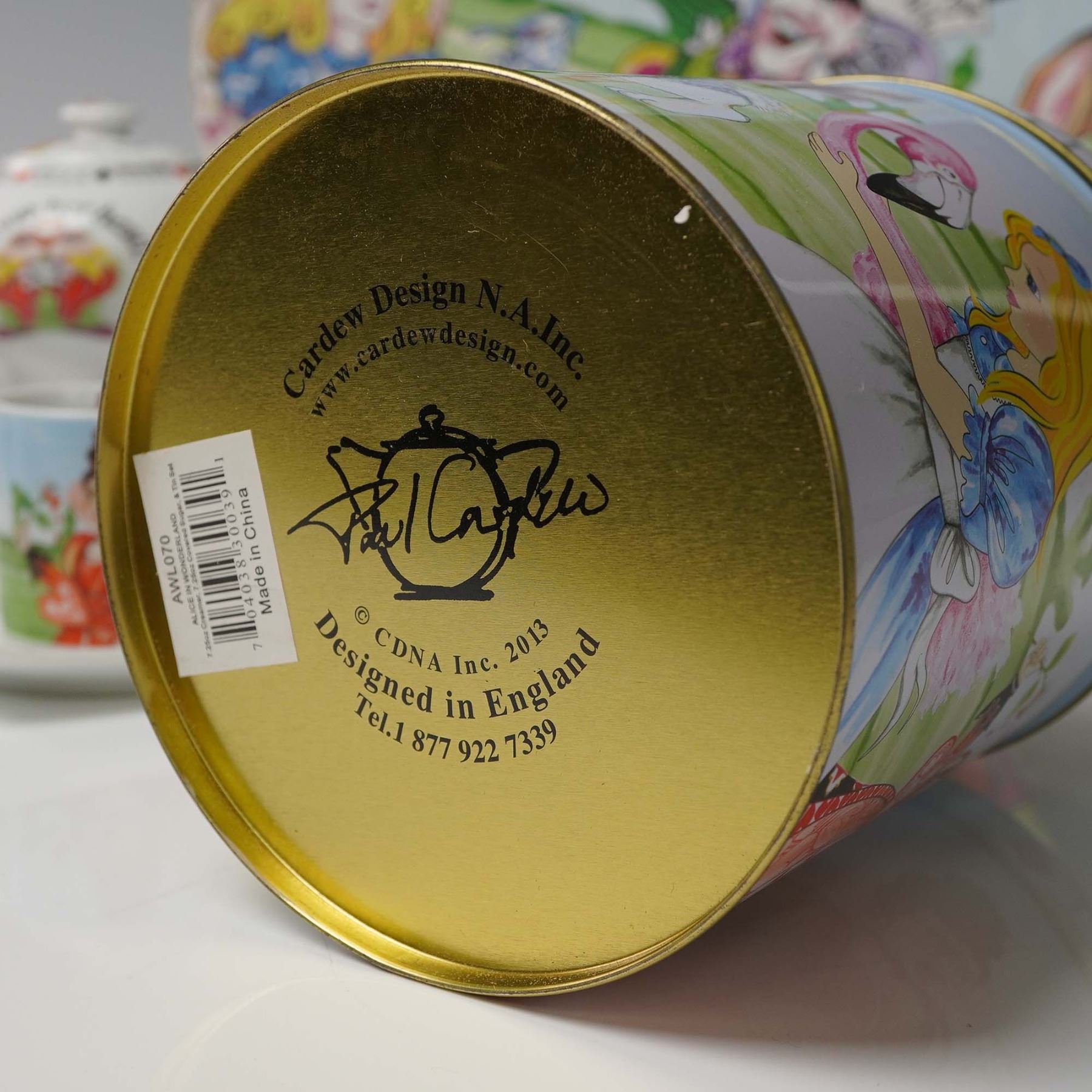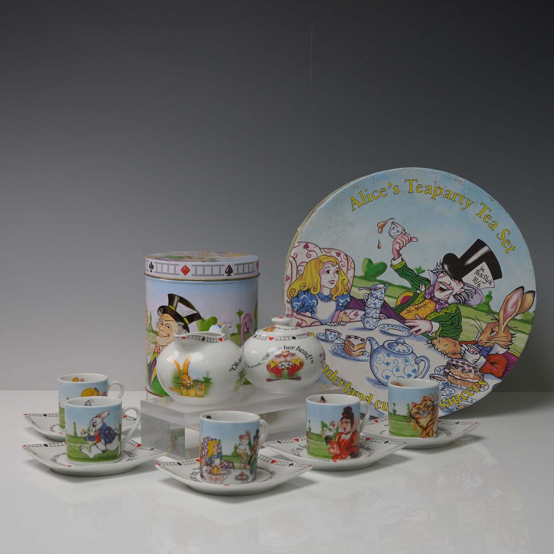 This whimsical 12-piece tea set by Paul Cardew Design commemorates the 150th anniversary of Alice in Wonderland. Titled Alice's Tea Party, the set includes four demitasse cups and saucers, a teapot, sugar bowl, creamer, and a decorative storage tin - all illustrated with colorful scenes from the classic tale. Each porcelain piece is adorned with beloved characters including Alice, the Mad Hatter, Cheshire Cat, and Queen of Hearts, paired with iconic quotes from the story. The original round tin and canister, printed with matching artwork, are also included. Designed in England and marked with Cardew Design N.A. Inc. backstamp. Largest piece 3"H x 11" dia.