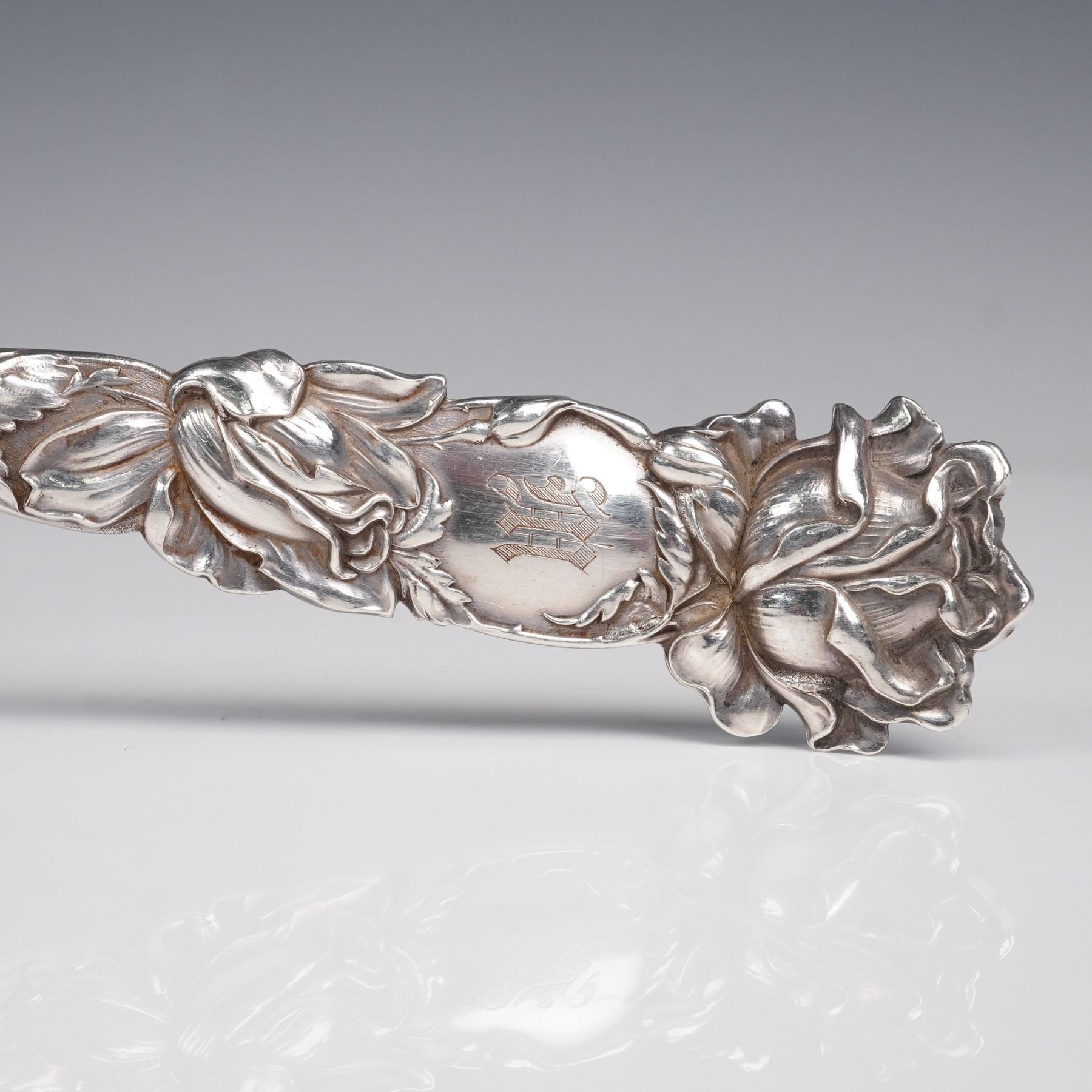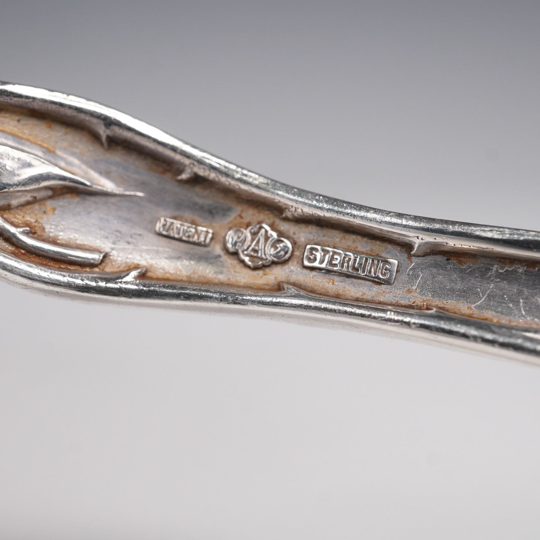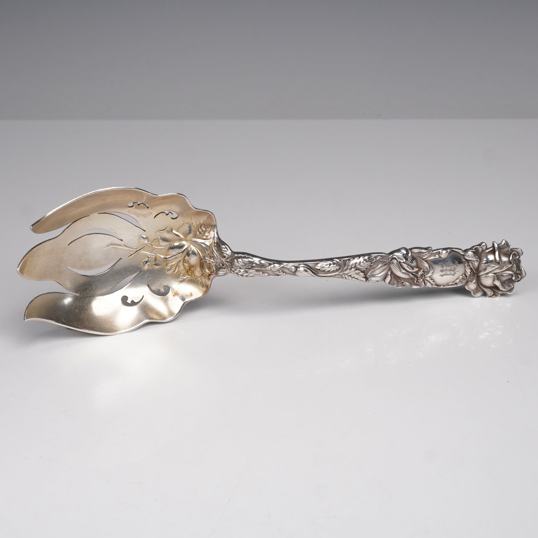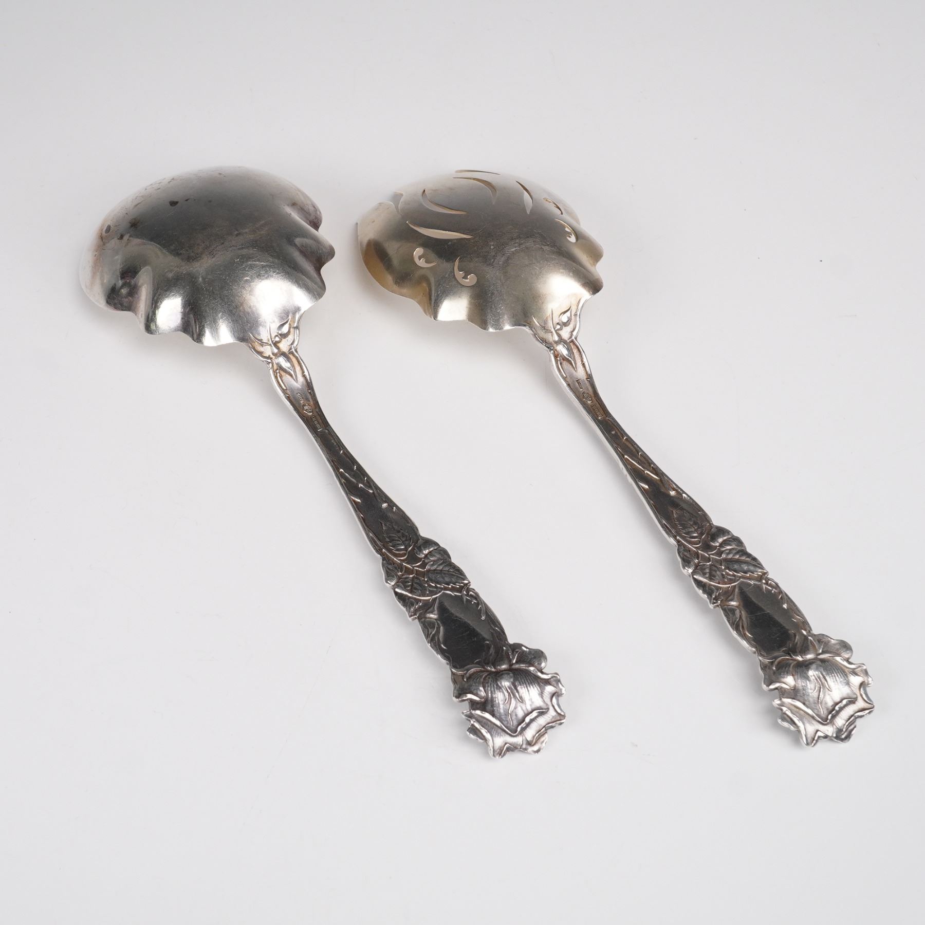 A 2-piece Alvin sterling silver salad and berry serving set in the Bridal Rose pattern, comprising a serving spoon and pierced serving fork. Introduced in 1903, this celebrated Art Nouveau design features raised roses, flowing leaves, and scrolling floral details. Each piece is stamped with the Alvin hallmark, the letter A, Sterling, and Pat, and both handles are monogrammed with an ornate script letter. Combined net silver weight is approximately 7.79 troy oz.