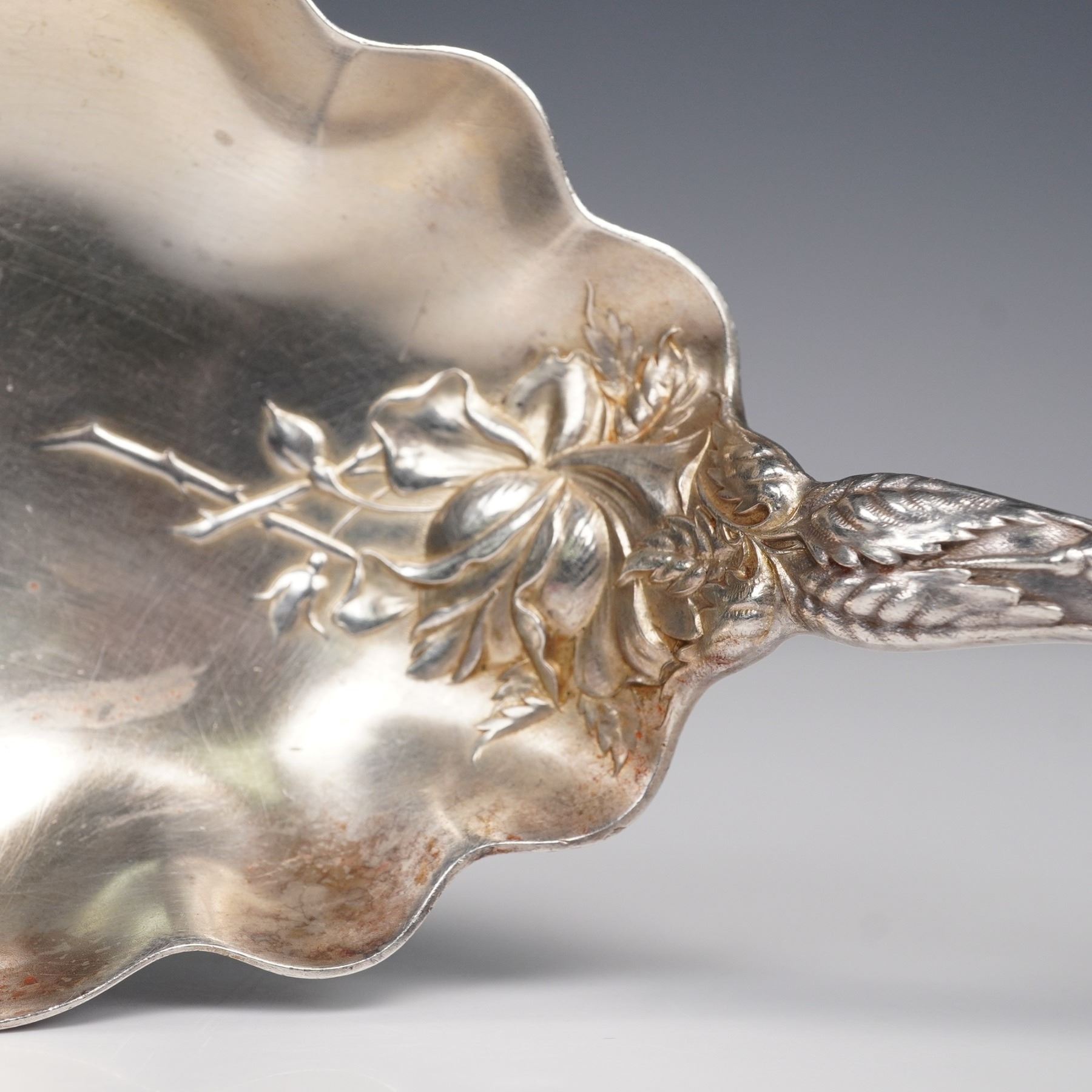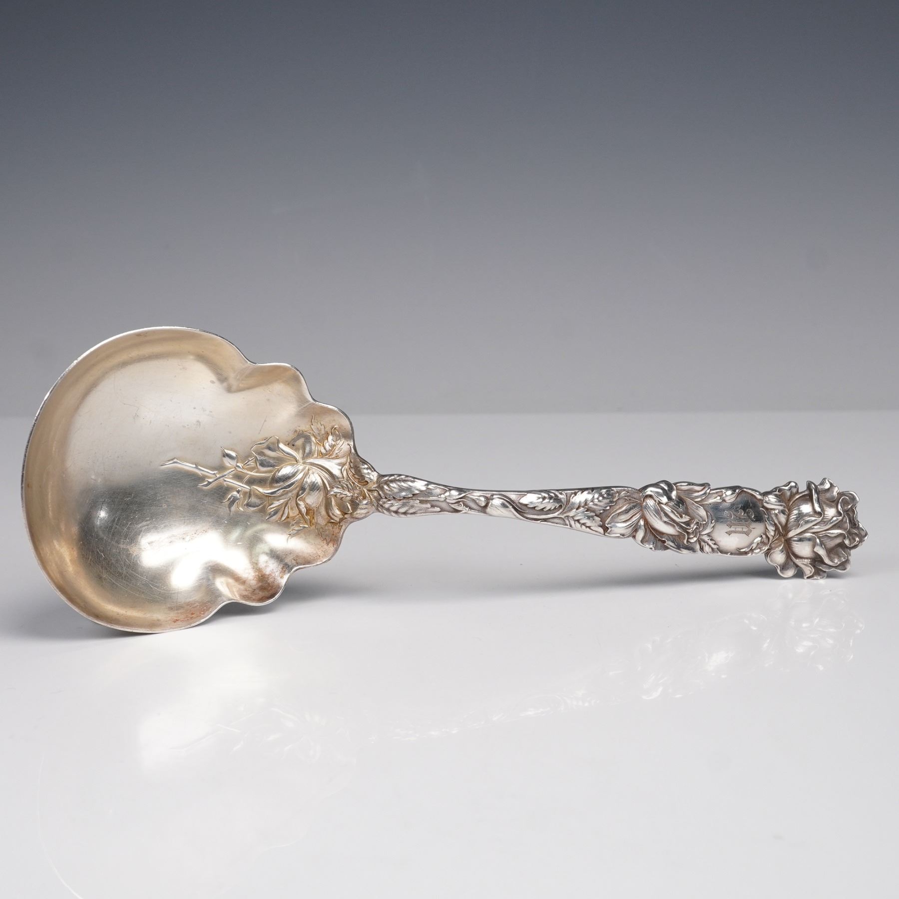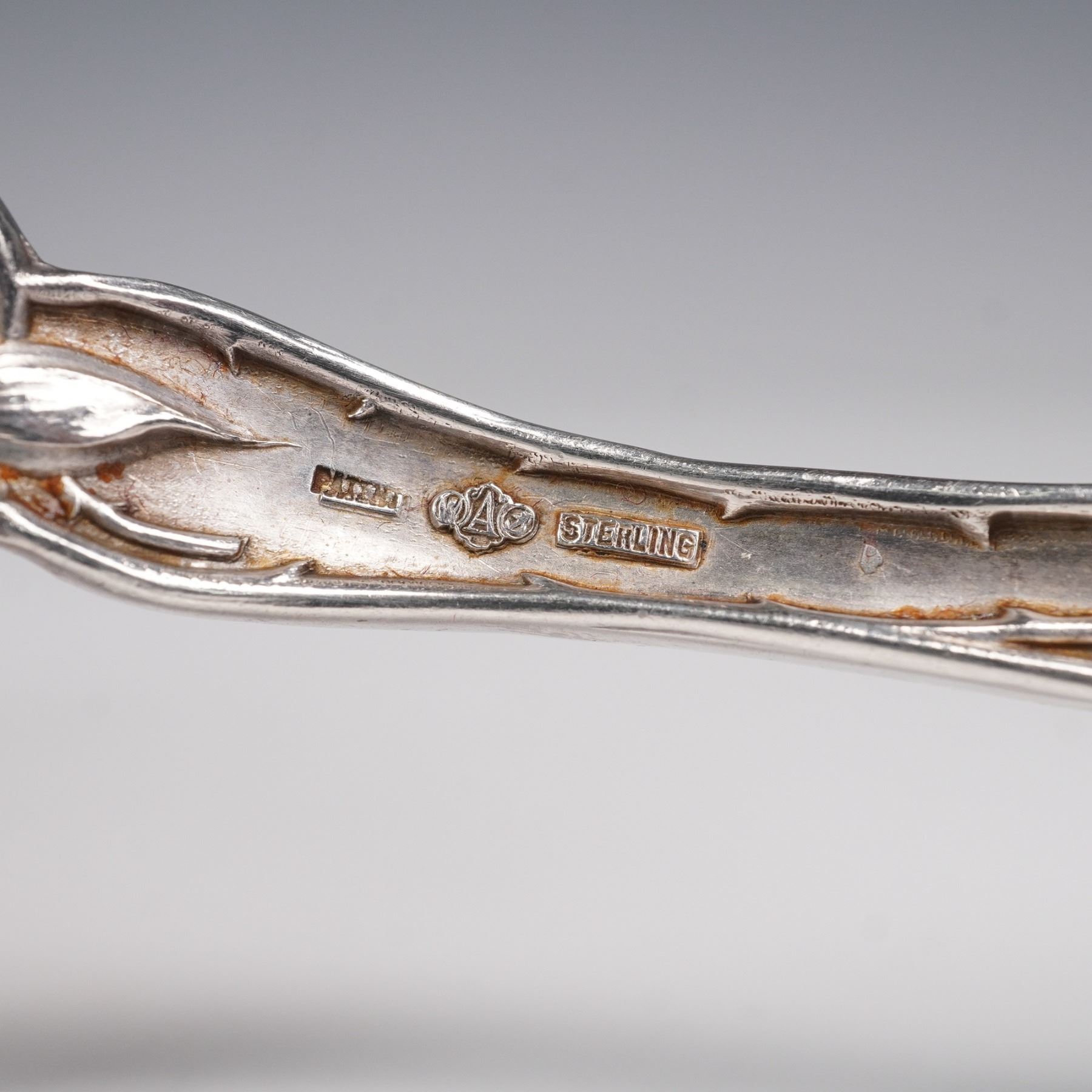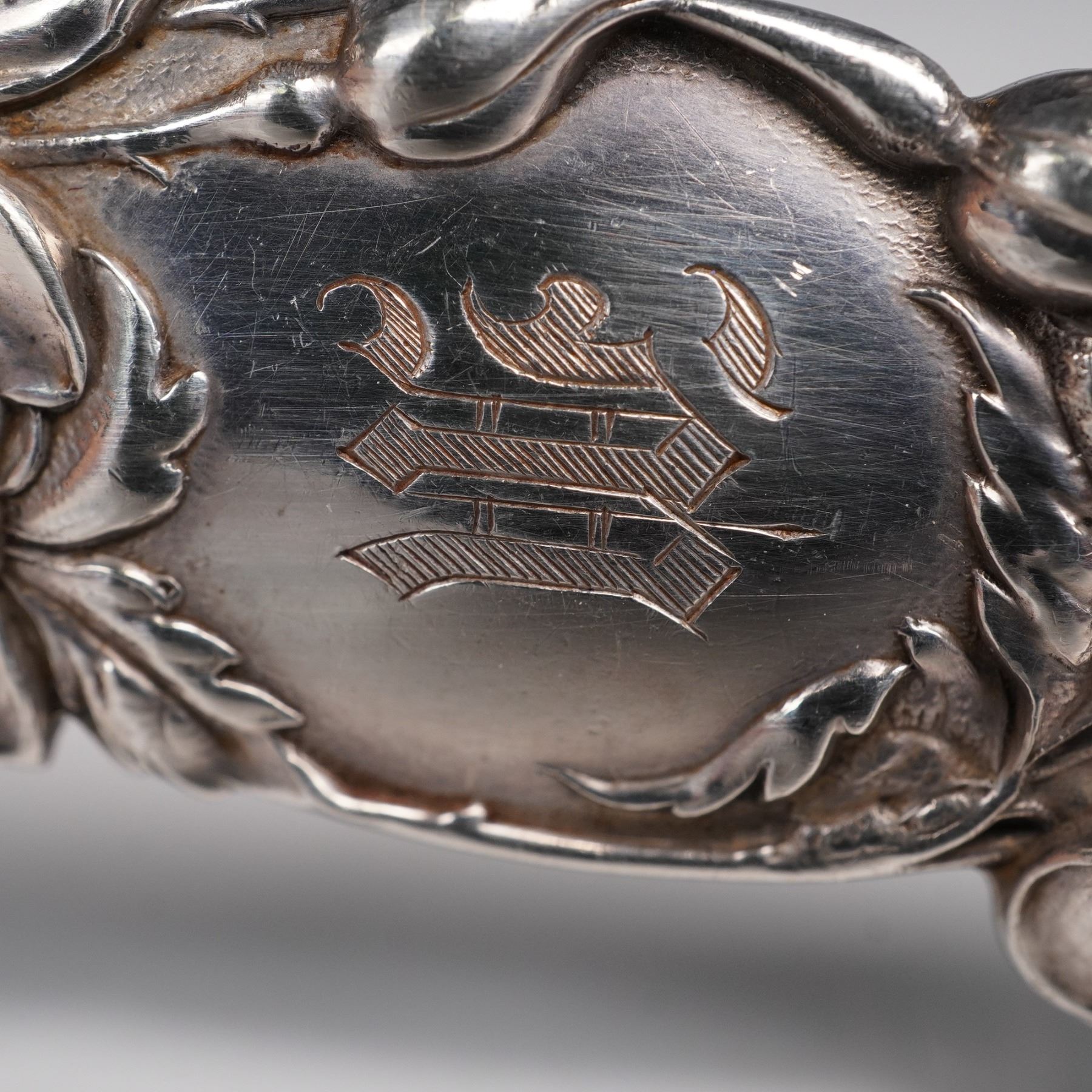 A 2-piece Alvin sterling silver salad and berry serving set in the Bridal Rose pattern, comprising a serving spoon and pierced serving fork. Introduced in 1903, this celebrated Art Nouveau design features raised roses, flowing leaves, and scrolling floral details. Each piece is stamped with the Alvin hallmark, the letter A, Sterling, and Pat, and both handles are monogrammed with an ornate script letter. Combined net silver weight is approximately 7.79 troy oz.