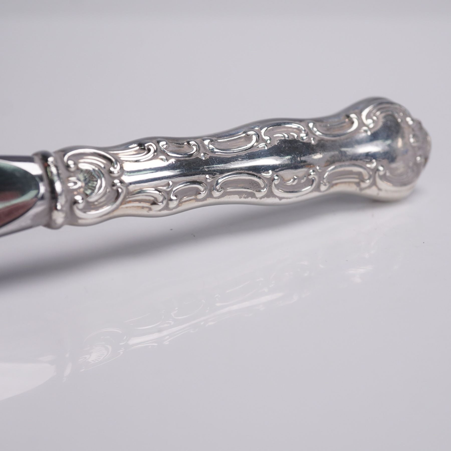 Pair of Alvin sterling silver handled dinner knives in the elegant French Scroll pattern, each with a stainless steel blade marked Stainless. The ornate handles feature raised scrollwork and floral motifs, showcasing the refined craftsmanship associated with Alvin silverware. Each knife measures 9"L. Gross weight 5.2 oz, including stainless steel blades.