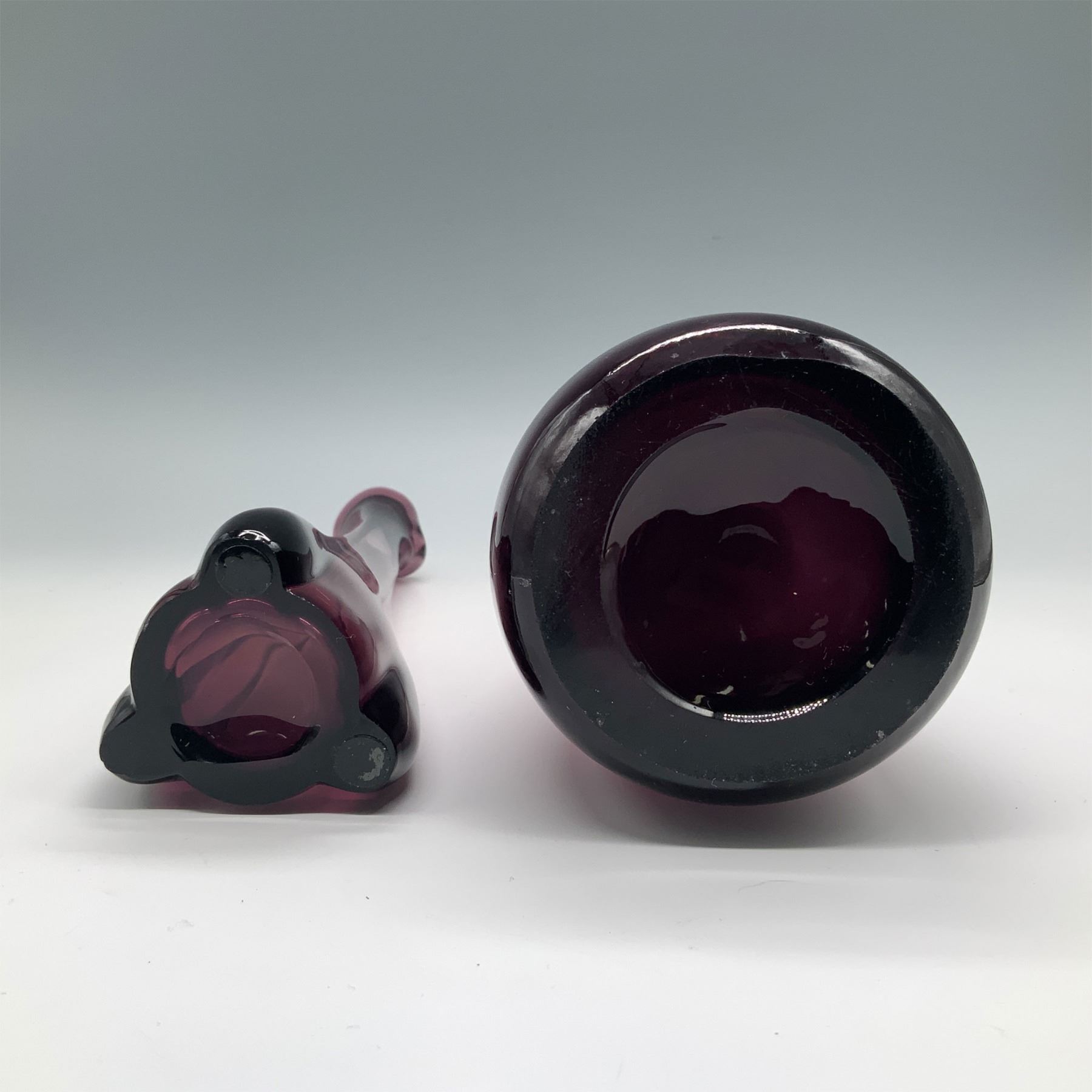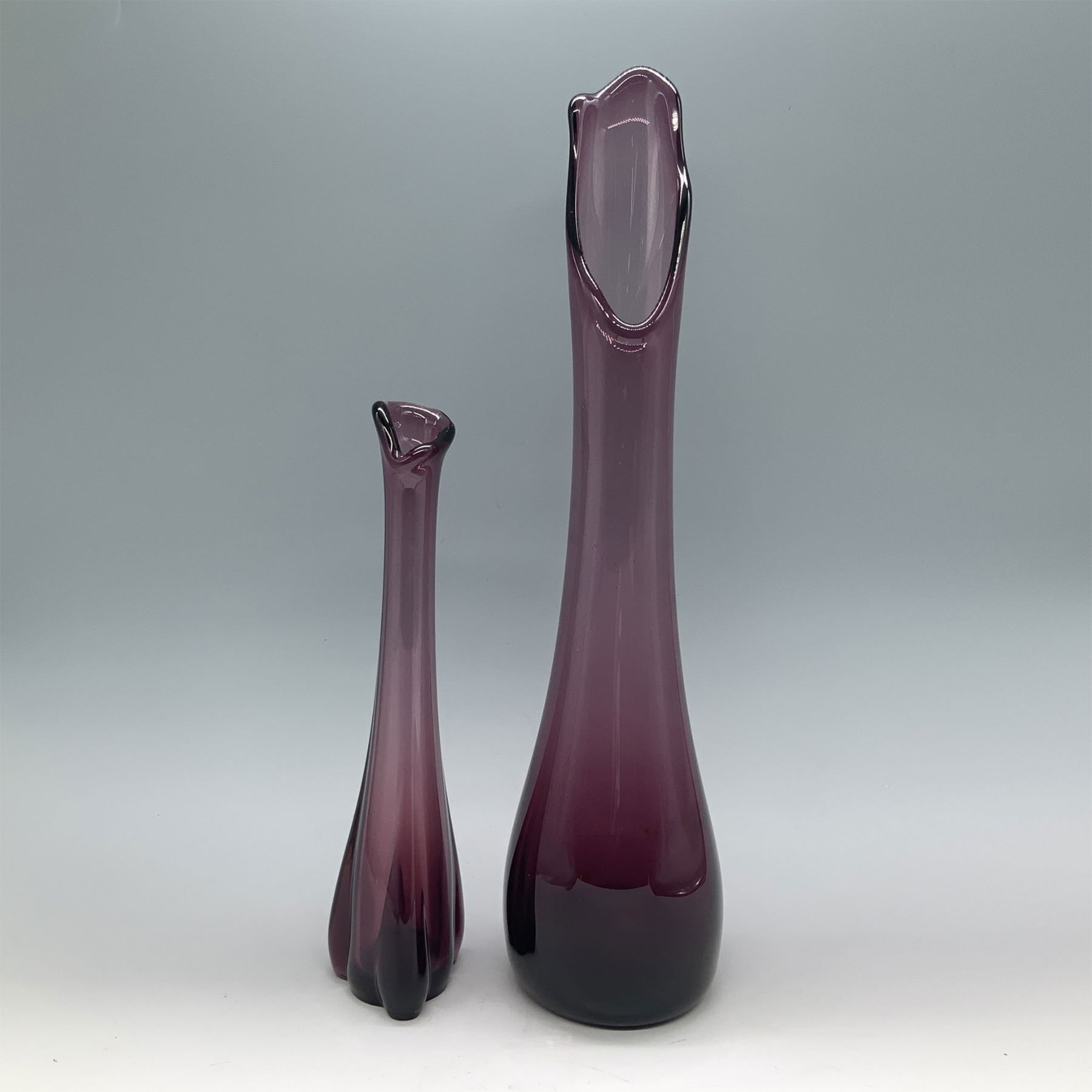 This exquisite 2-piece set features handblown glass vases in a captivating dark amethyst color. The larger vase has a gracefully elongated shape, while the smaller vase presents a stylish flared opening. Both pieces display the artistry of handblown glass, with smooth, fluid lines and a striking color gradient from deep amethyst at the base to a lighter tone near the top. Largest vase: 15.25"H