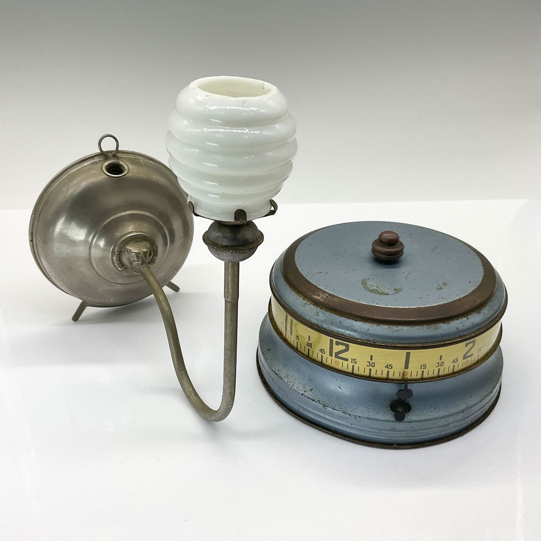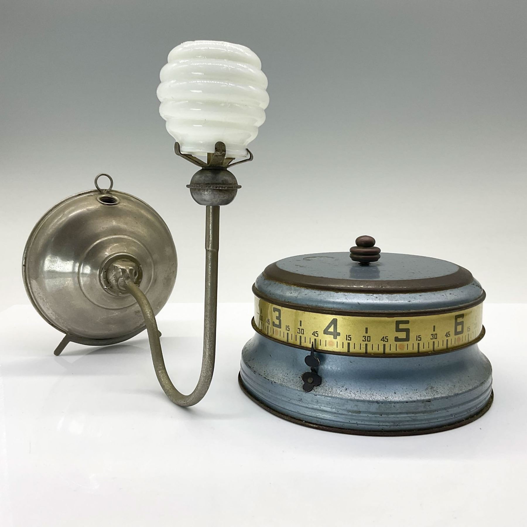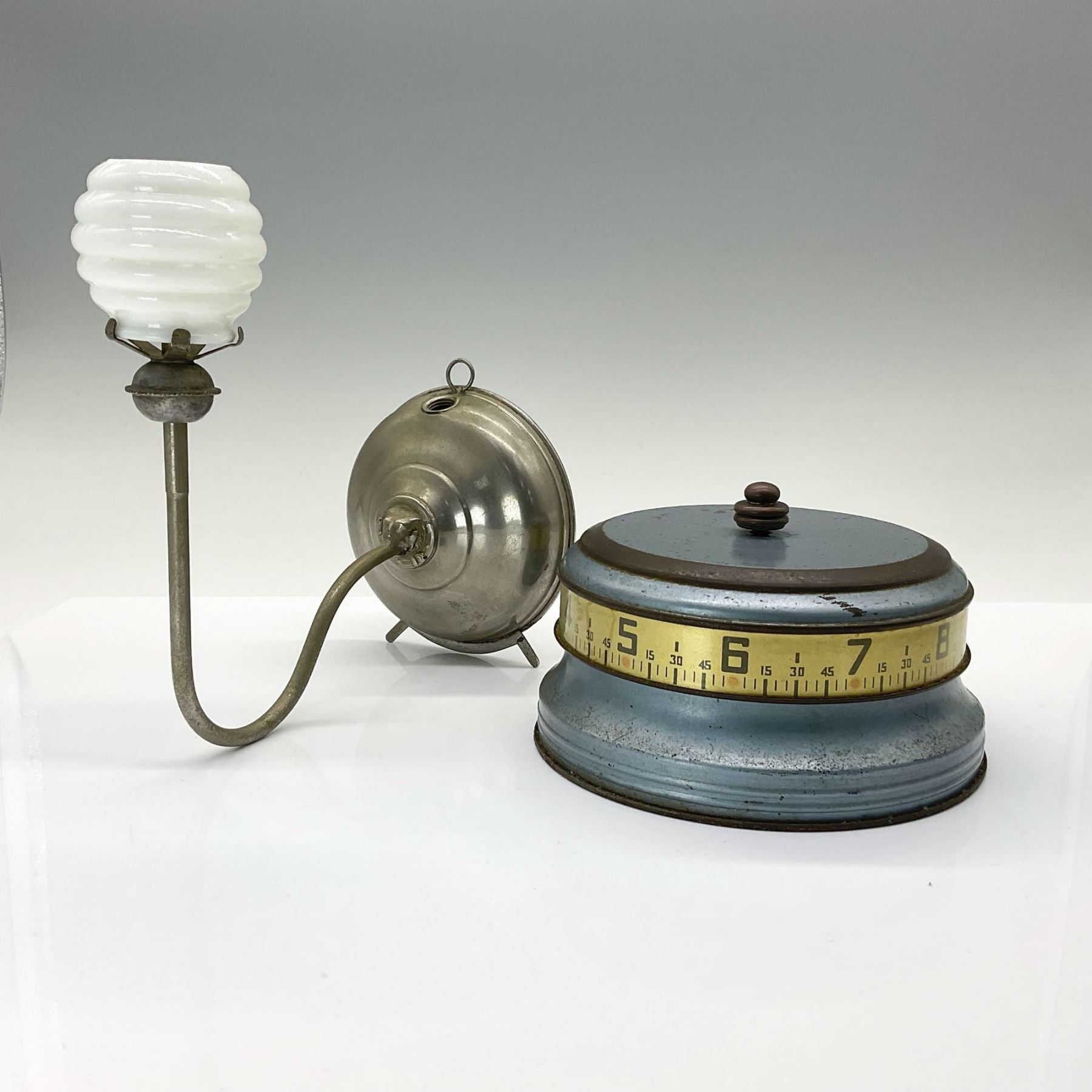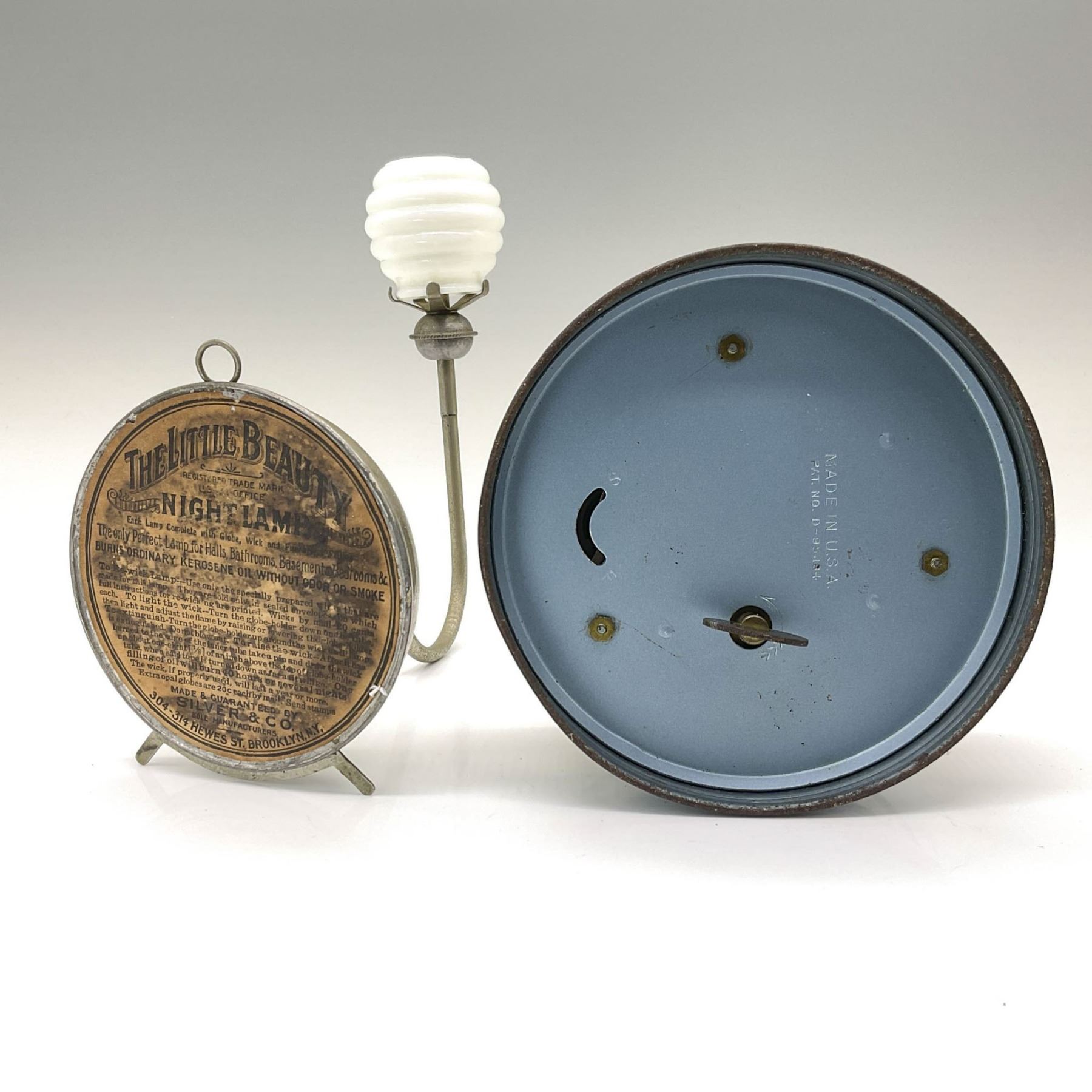 This pair of rare collectibles includes The Little Beauty night lamp, featuring a charming white beehive globe and silvertone hardware. This versatile piece is designed to sit on a desk or table or hang on the wall, measuring approximately 6.5"L x 4"W x 6.5"H. Also included is a Lux Wind-Up Rotary Drum Mystery Tape Measure Desk Clock, exuding the elegance and precision of the 1930s. Clock measures 3"H x 5.25" dia.