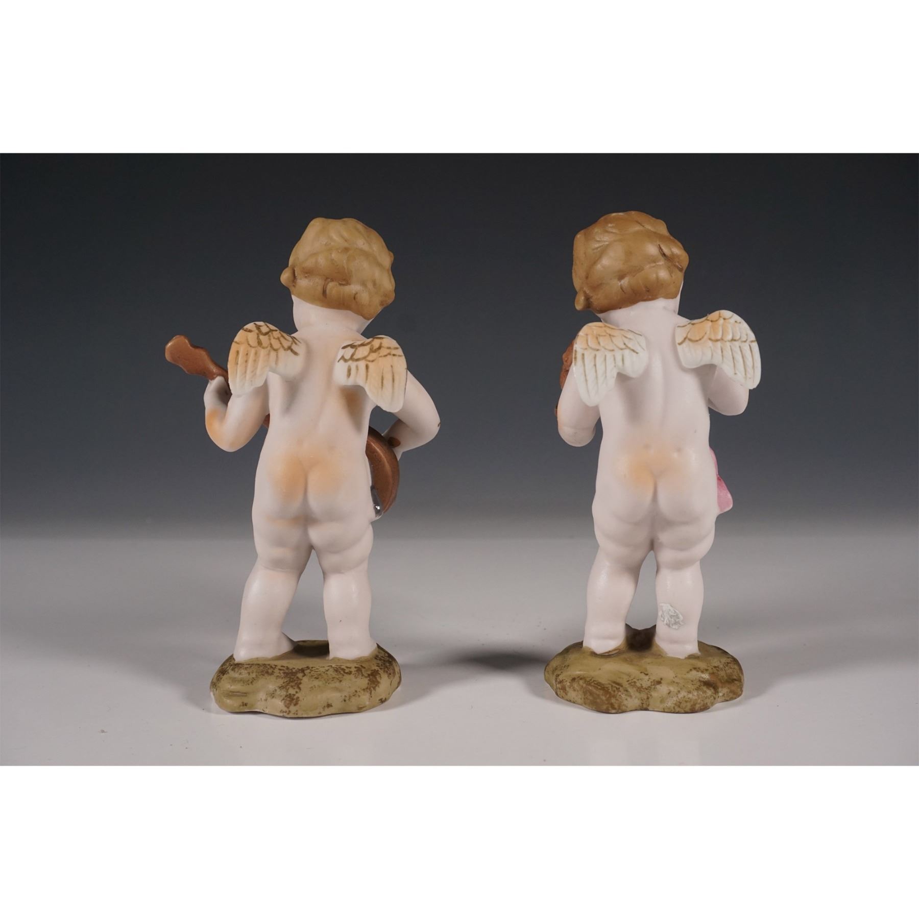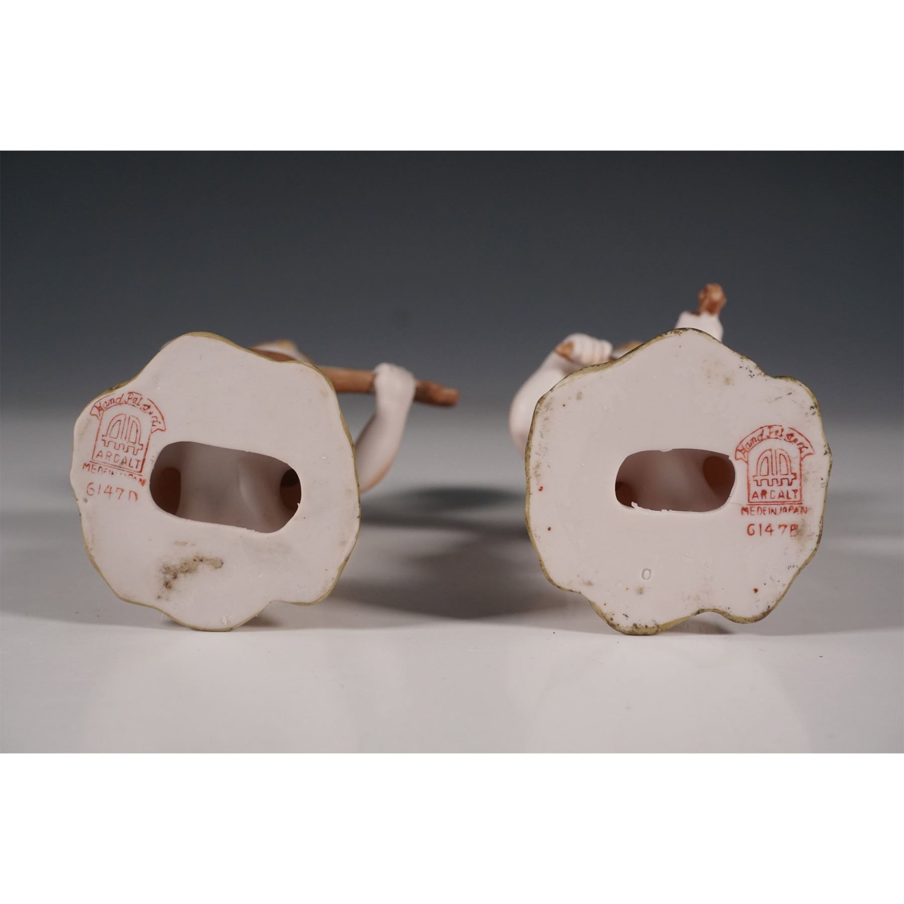 A charming pair of hand-painted Ardalt porcelain angel figurines, each depicted as a playful child musician. One angel is playing a banjo, while the other holds a violin. Both figures are delicately detailed with wings and expressive faces. Each piece is marked with Hand Painted, Ardalt, Made in Japan, and the number 6147 on the base. These figurines stand on small rocky bases, enhancing their delicate aesthetic. A delightful example of fine Japanese porcelain craftsmanship.