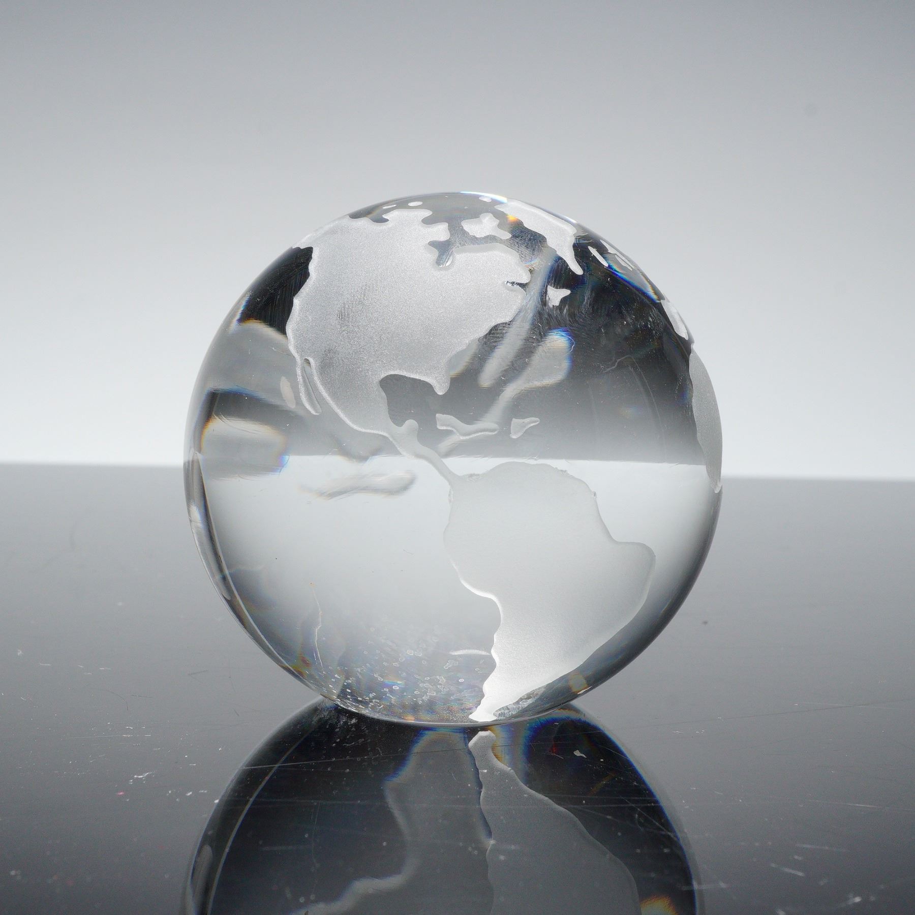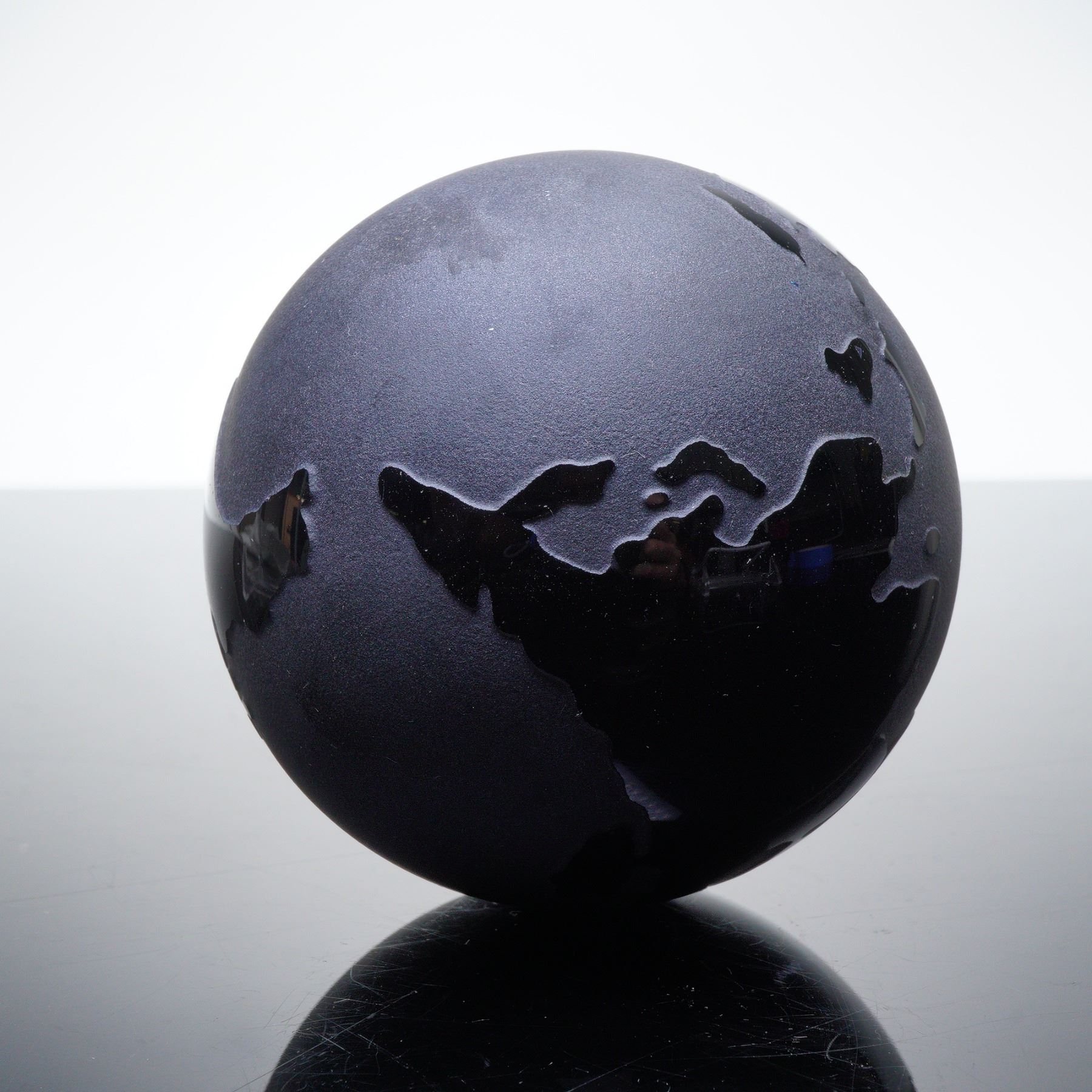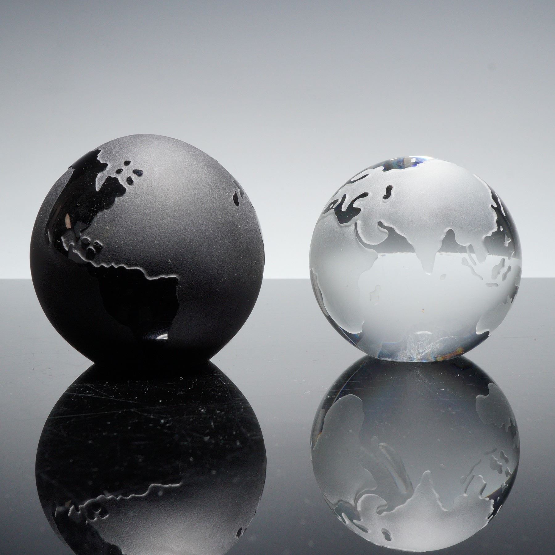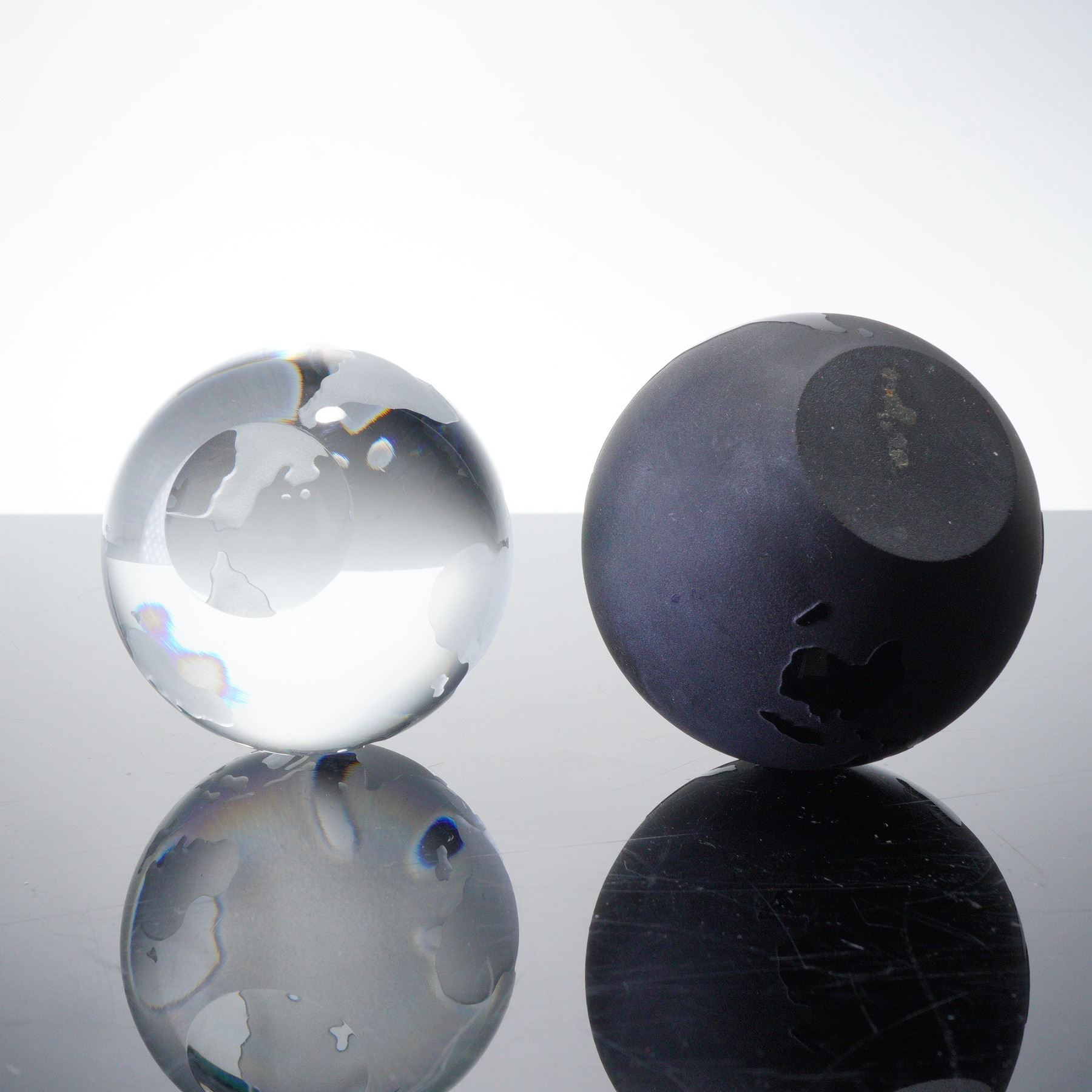 Two spherical glass paperweights, each depicting a stylized world map in contrasting finishes. One rendered in frosted black glass with polished continents, the other in clear glass with frosted landmasses.