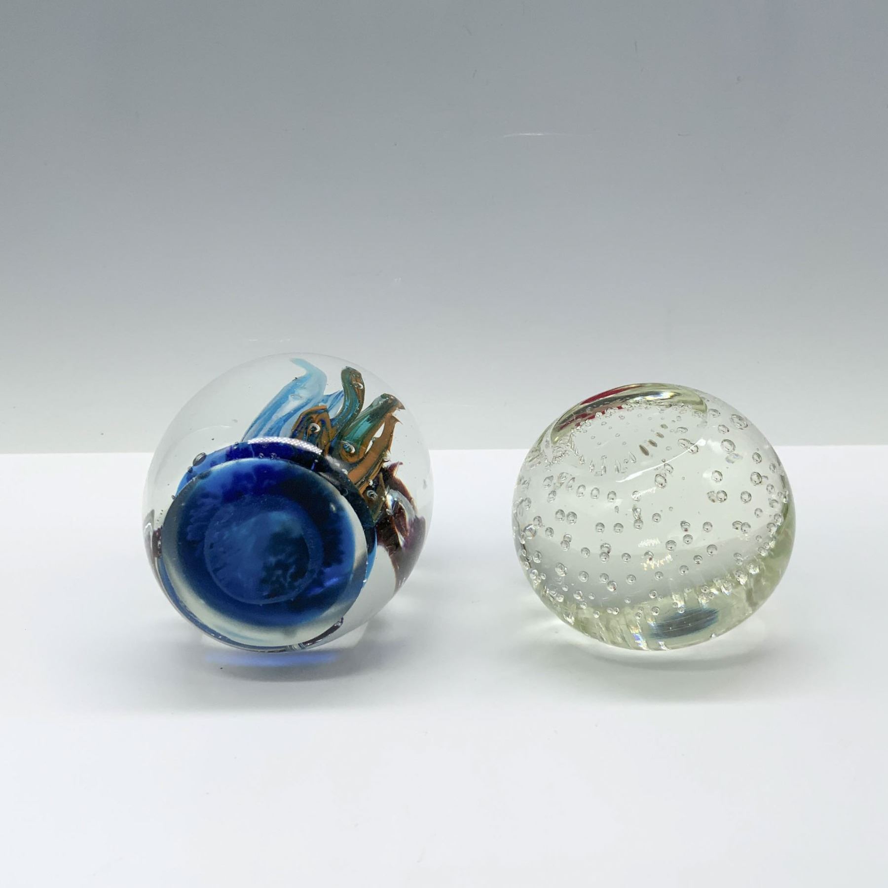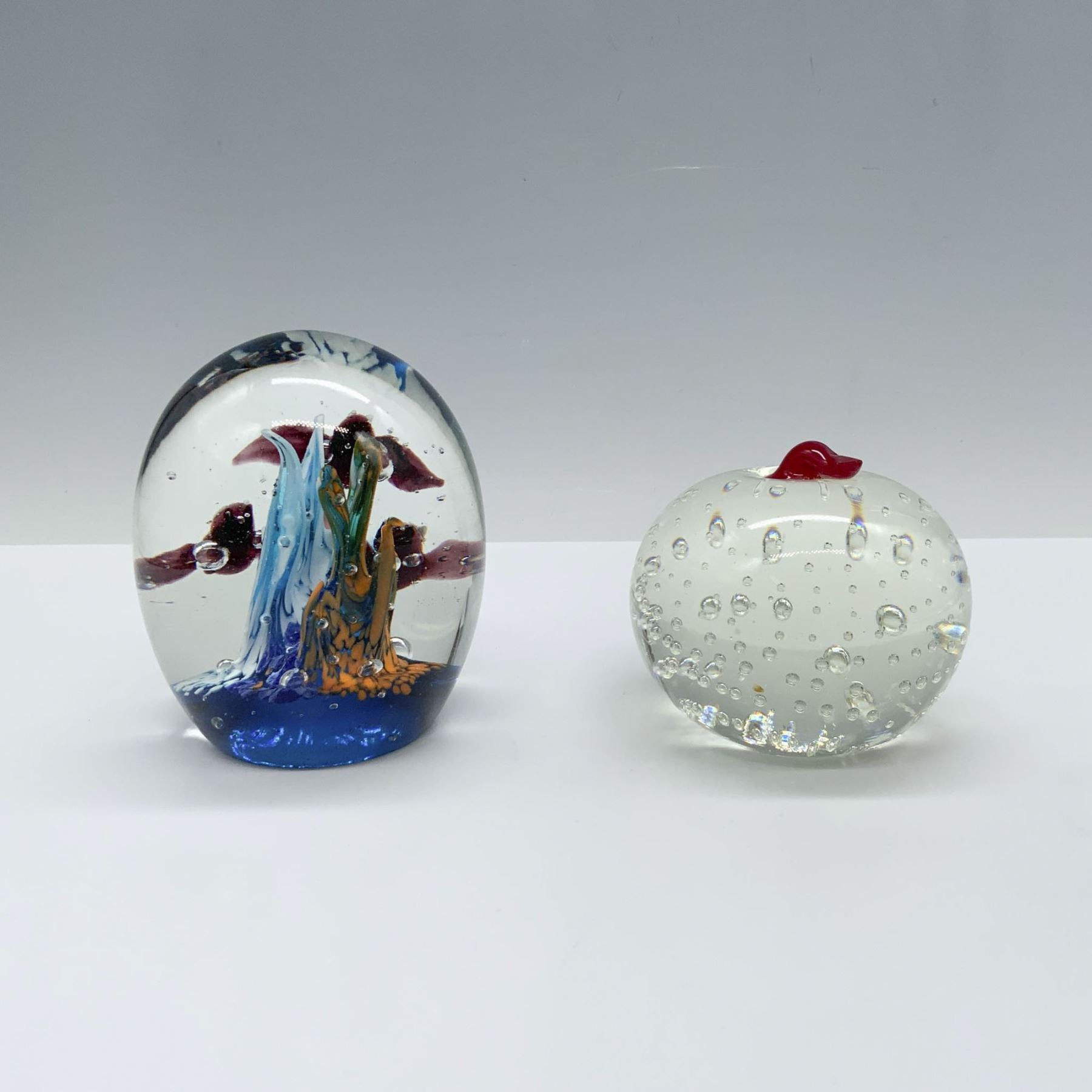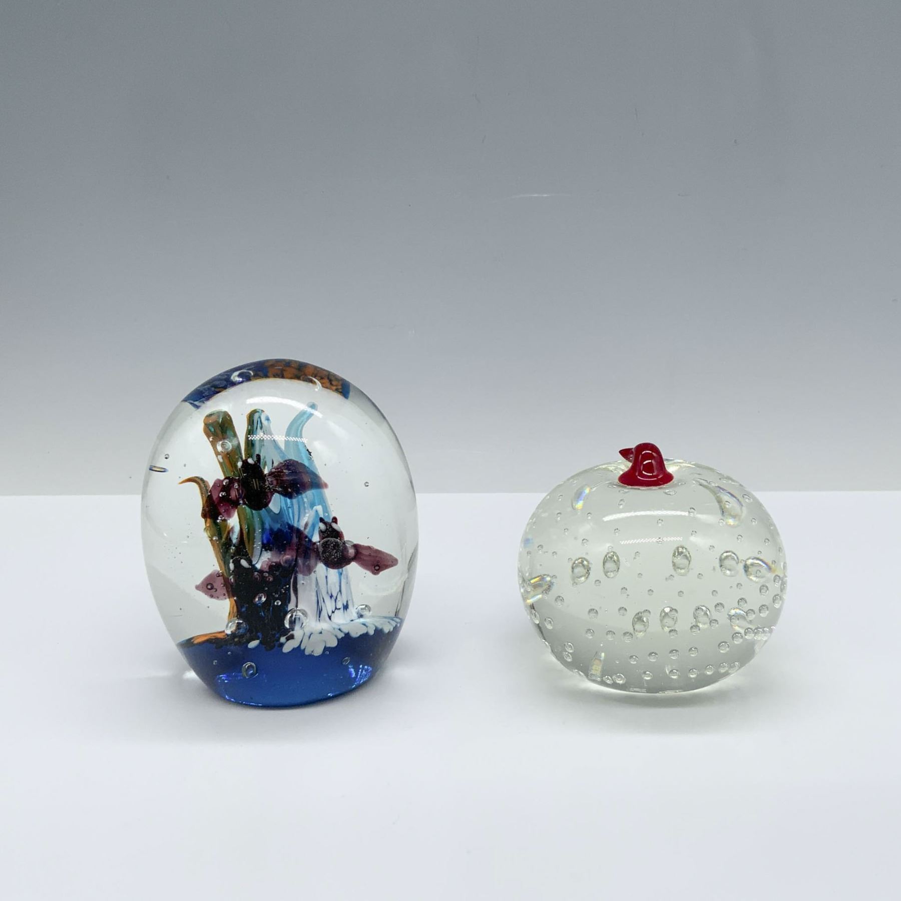 Gorgeous duo of paperweights that includes an orange and blue cave scene with adorable flying bats, and a clear apple with bubble designs and a red stem. Largest item measures 3.5"H x 3" dia.