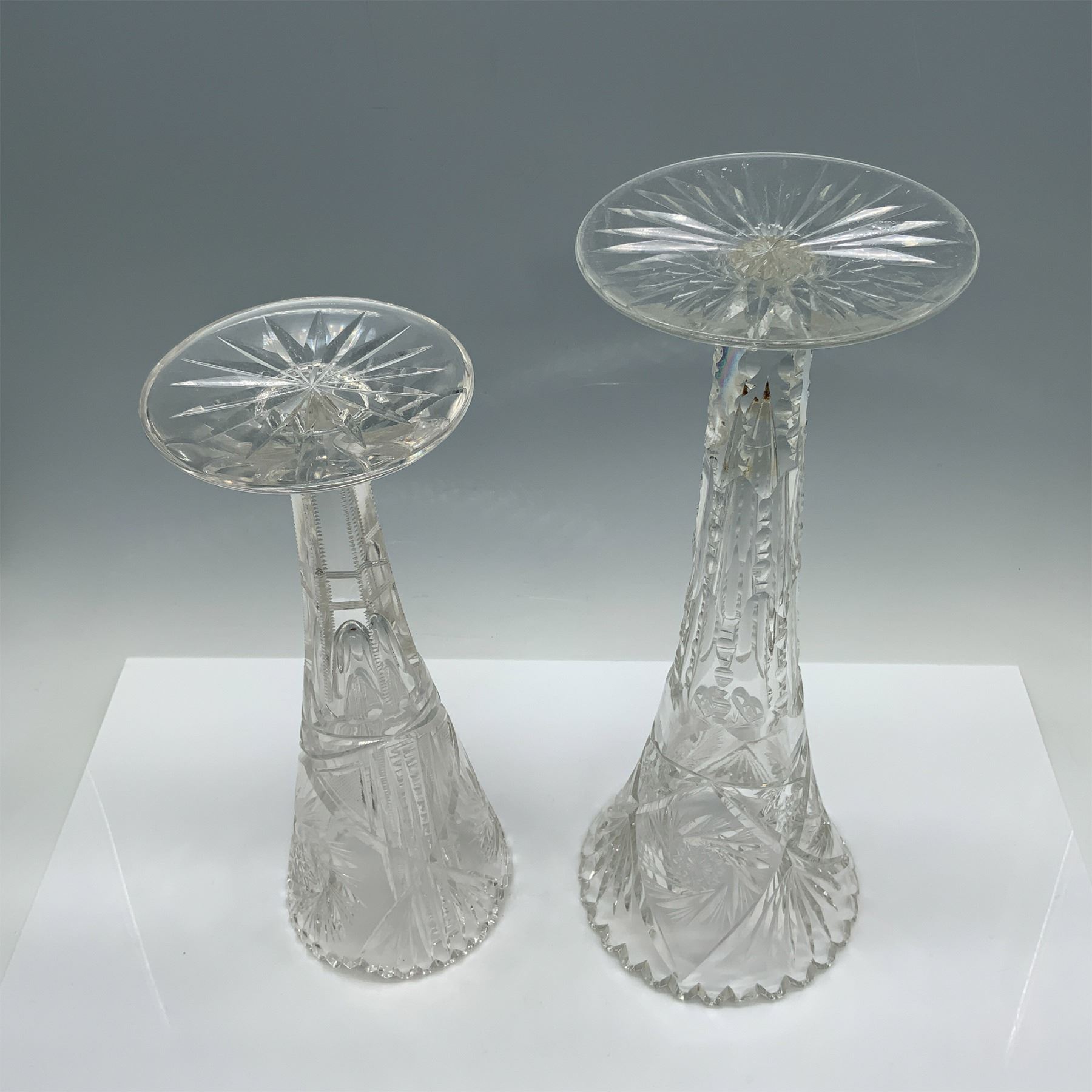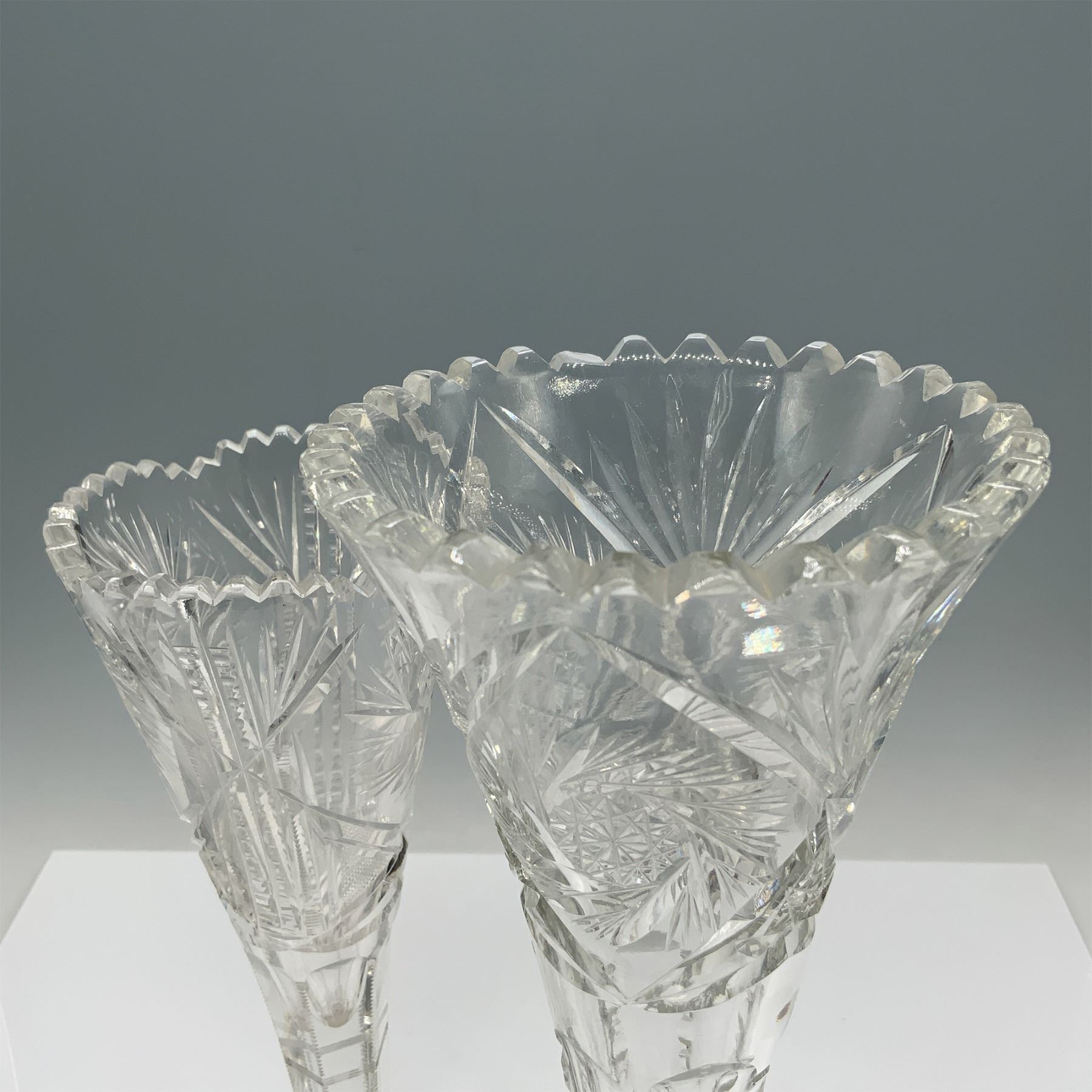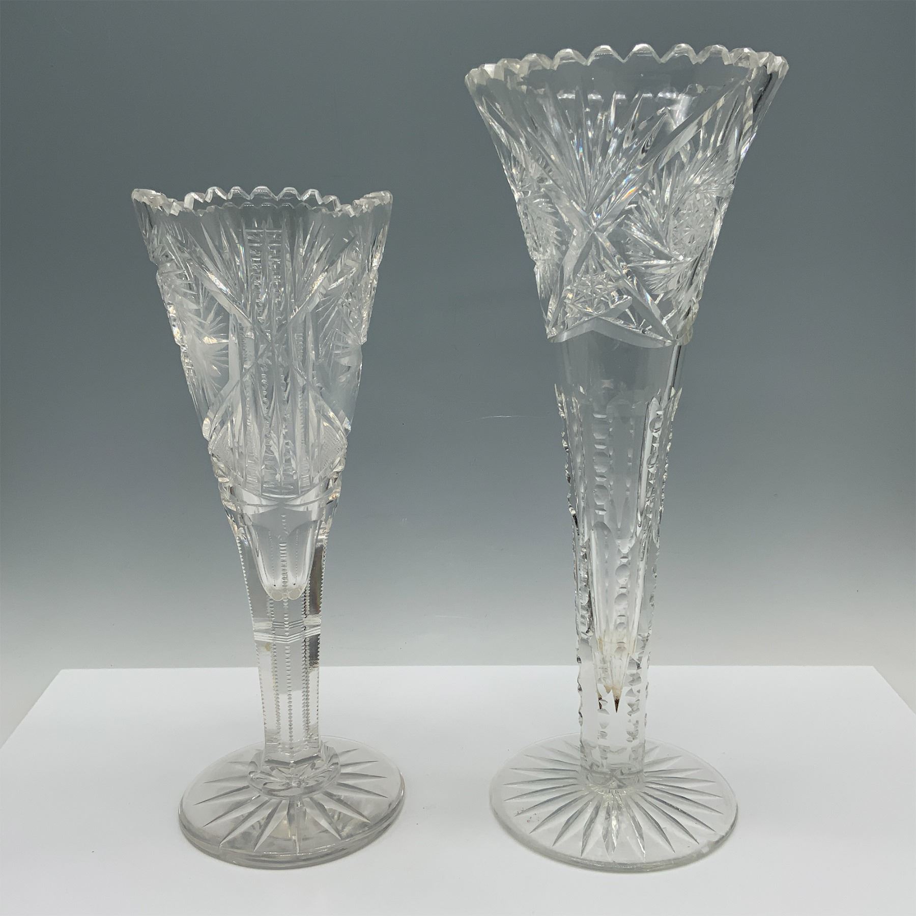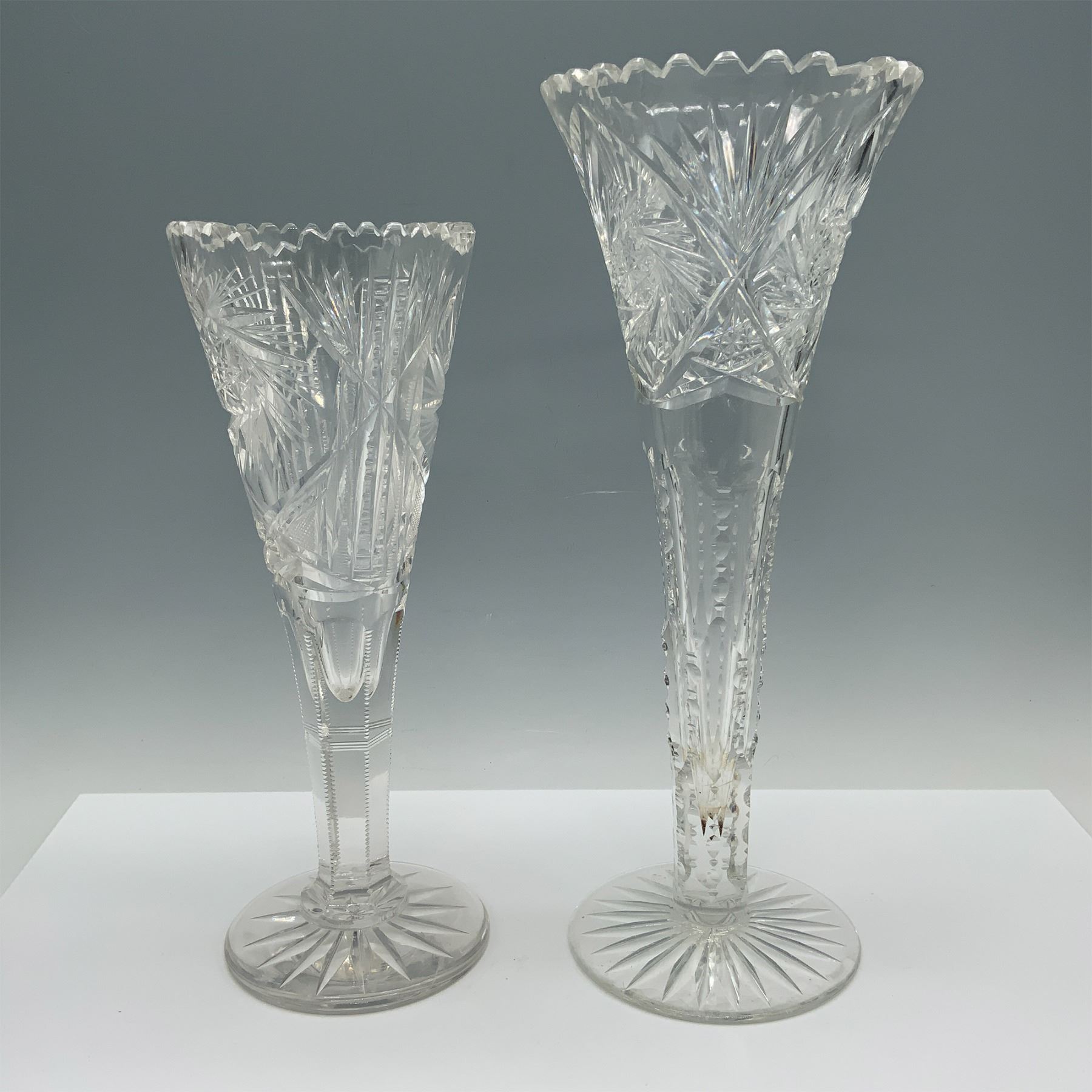 Fabulous duo of vases with etched designs that includes pinwheel patterns and scalloped rims. Largest item measures 12"H x 4.75" dia.