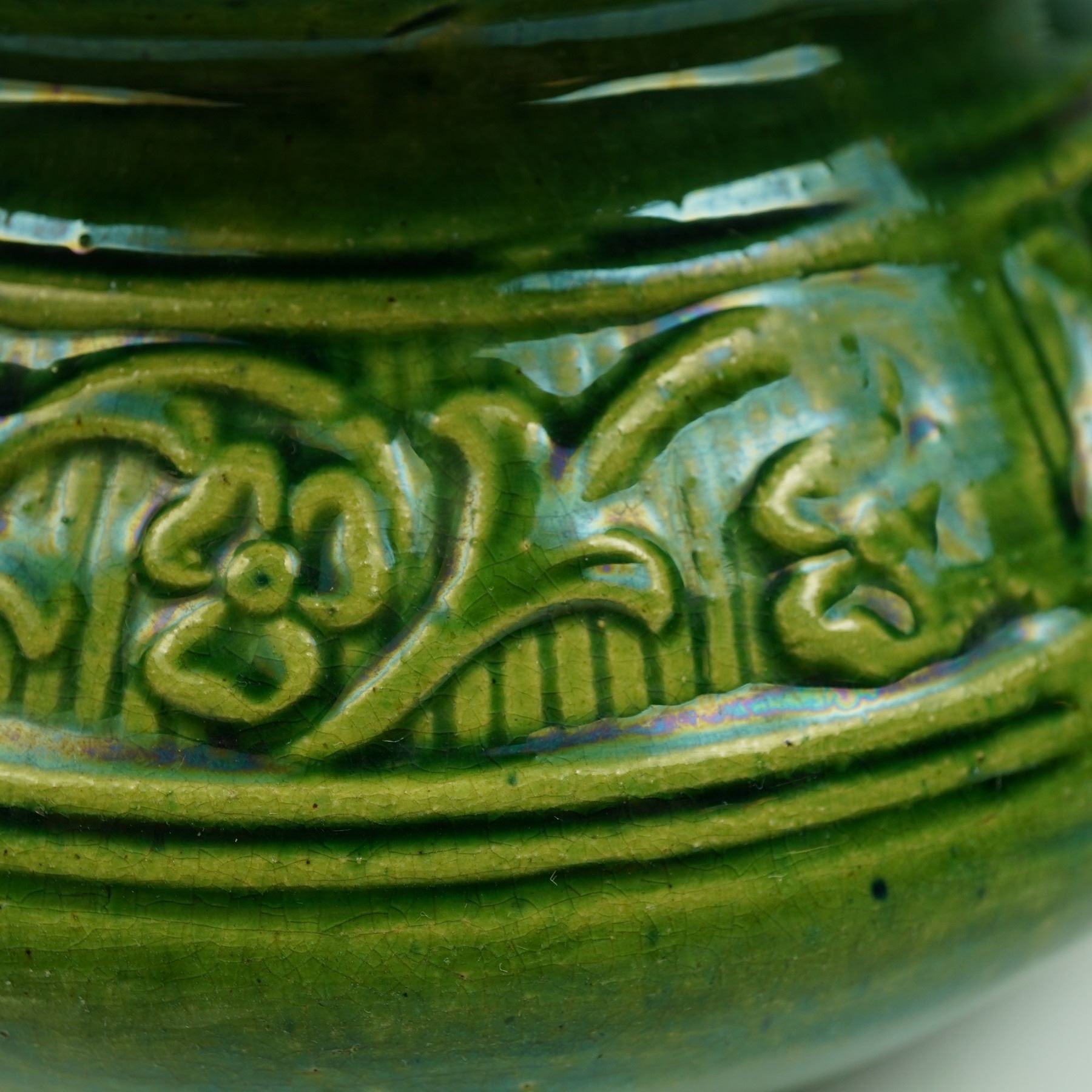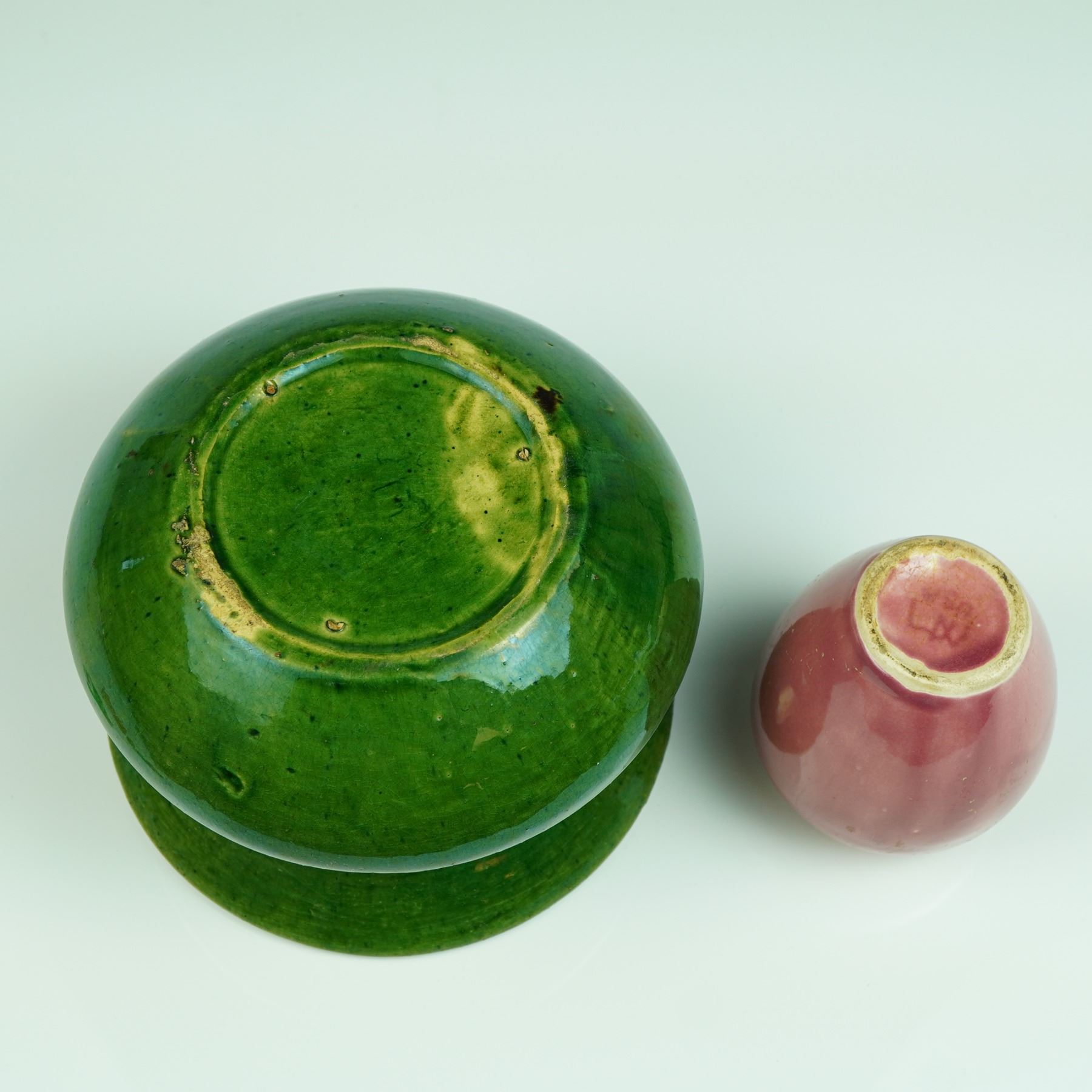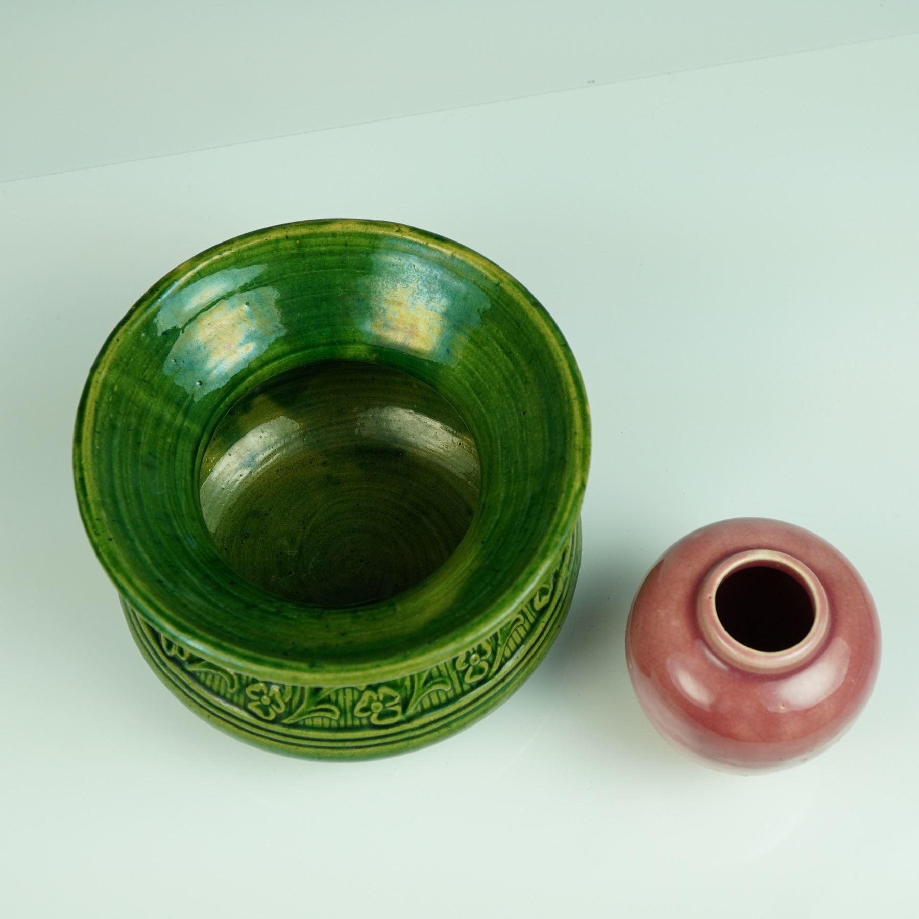 A charming pairing of two art pottery forms: the first, a richly glazed green earthenware bowl featuring a wide flaring rim and encircling band of stylized floral relief motifs, all highlighted in a luscious green glaze with iridescent pooling in the recessed decoration; the second, a diminutive rose-colored vase with a subtly flared lip and faintly crackled glaze, bearing a faint impressed mark to the base. The duo presents a striking juxtaposition in color and form, both demonstrating fine craftsmanship and appealing surface texture. A delightful decorative lot for collectors of early 20th-century studio ceramics or eclectic interior displays.