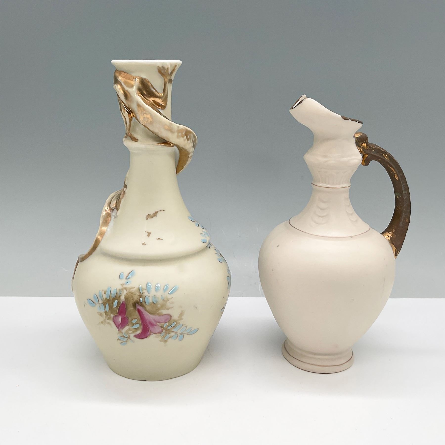 A pair of hand-painted Austrian porcelain ewers, each featuring intricate floral motifs and ornate gilt accents. The first ewer (8"H), marked with a blue Victoria Carlsbad Austria backstamp, is adorned with vibrant purple, pink, and gold flowers, raised enamel detailing, and an elaborate gilded handle resembling a twisting branch. The second ewer (7"H), marked Austria in red, showcases delicate pink and autumnal-toned floral decorations with a gracefully curved handle accented in gold. Both pieces exemplify the elegance of 19th-century Austrian porcelain craftsmanship.