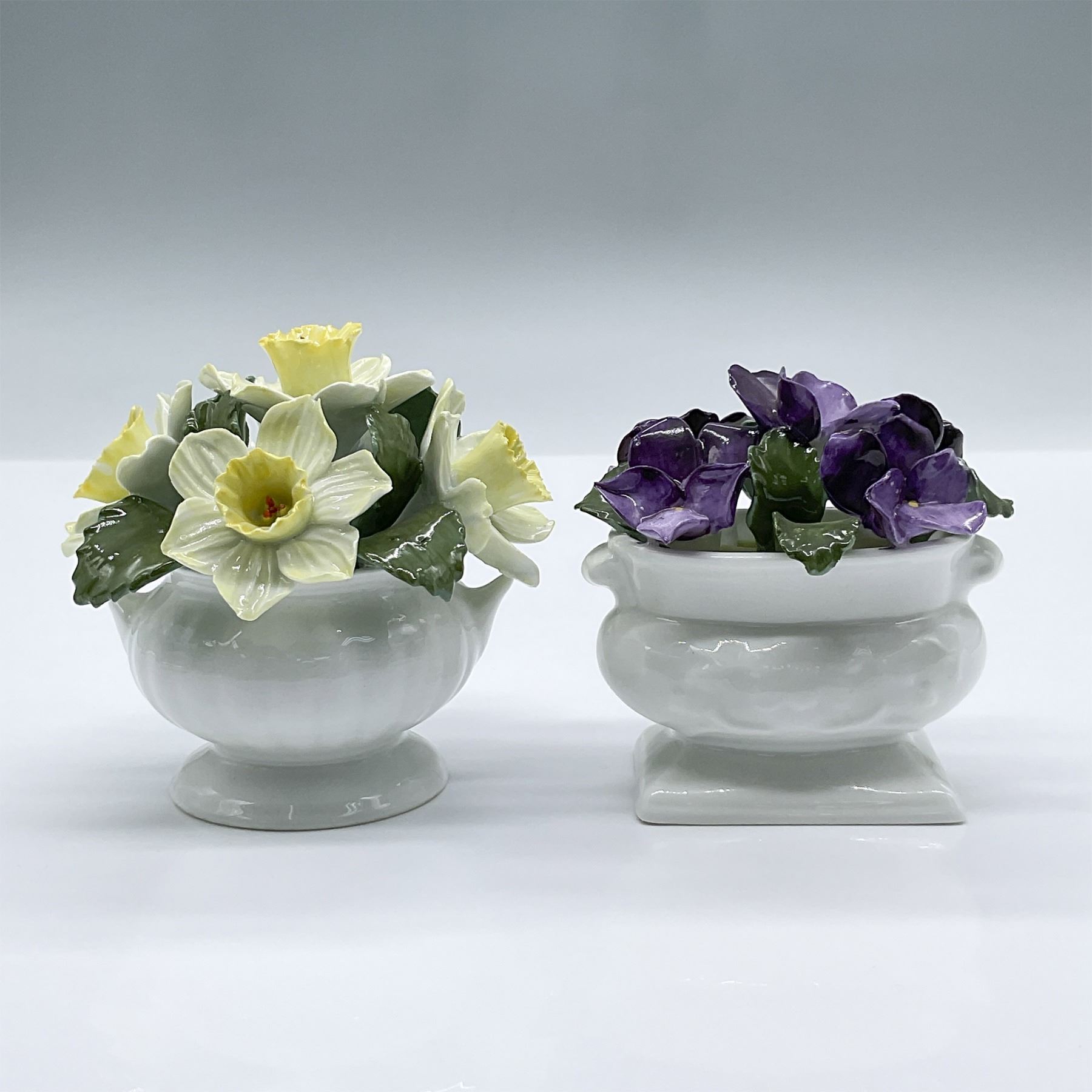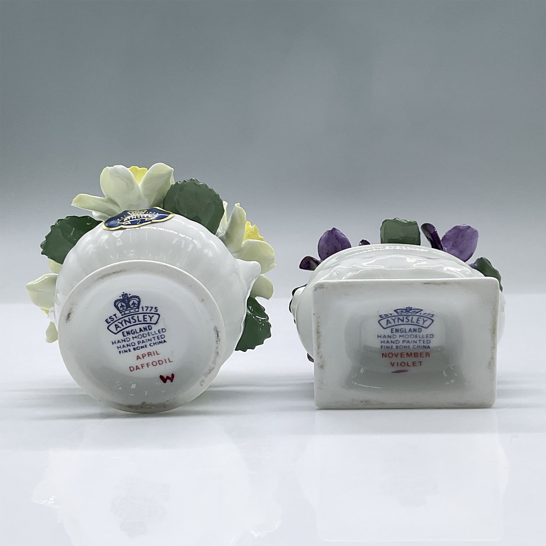 Features two glossy fine bone china flower arrangement figurines, one with yellow daffodils and the other with violets. Largest measures 3.5"L x 3"W x 3.25"H. Aynsley stickers and backstamp.