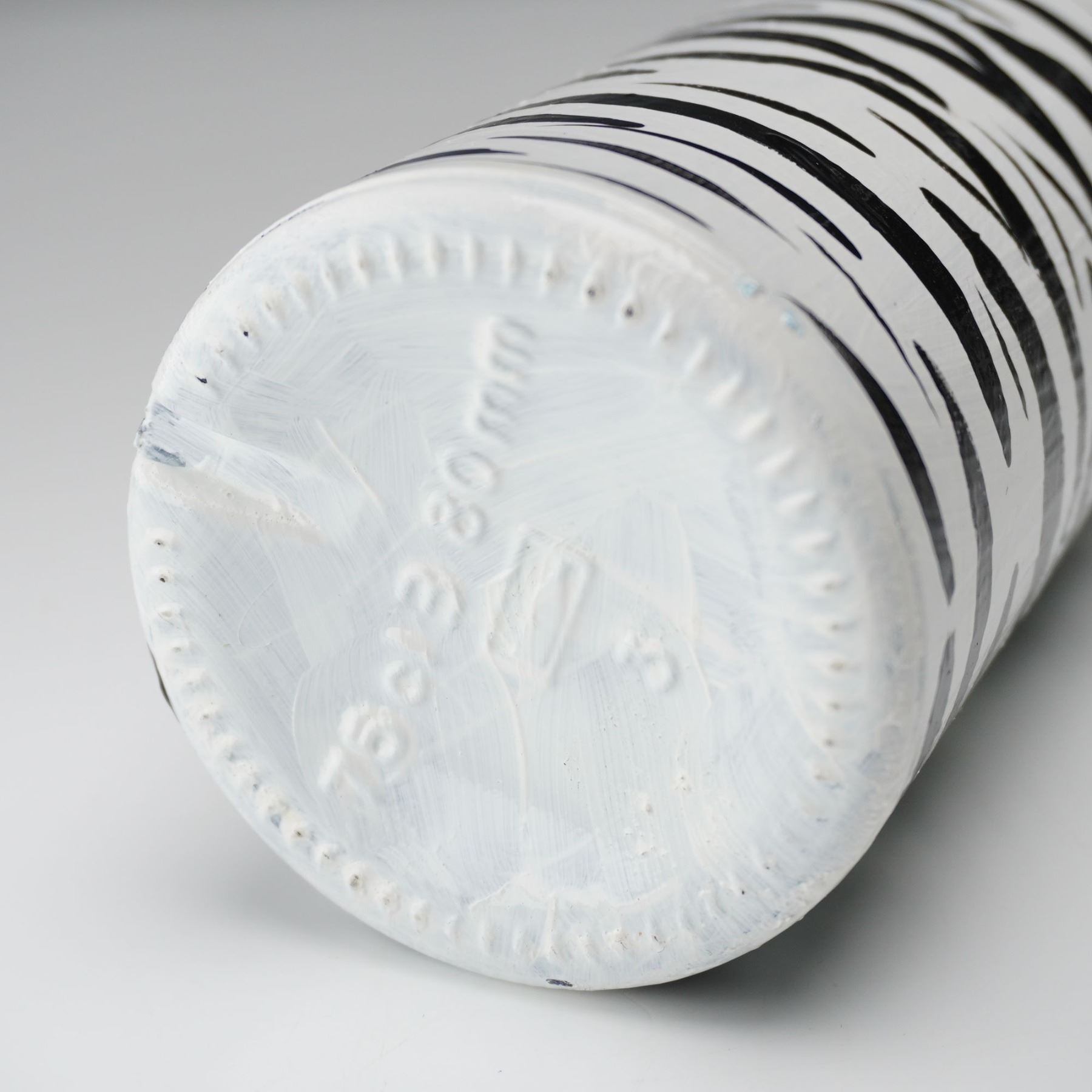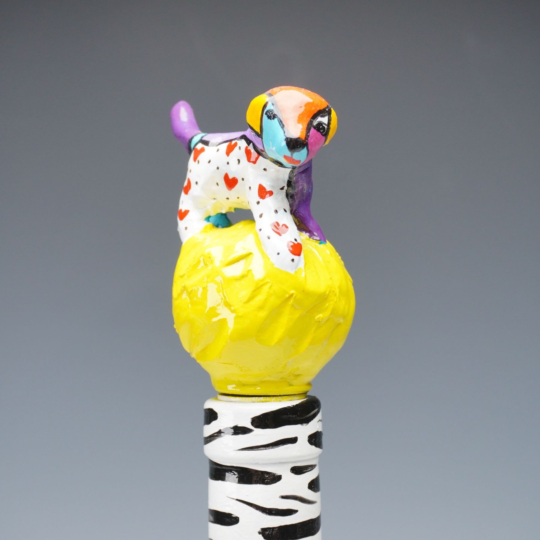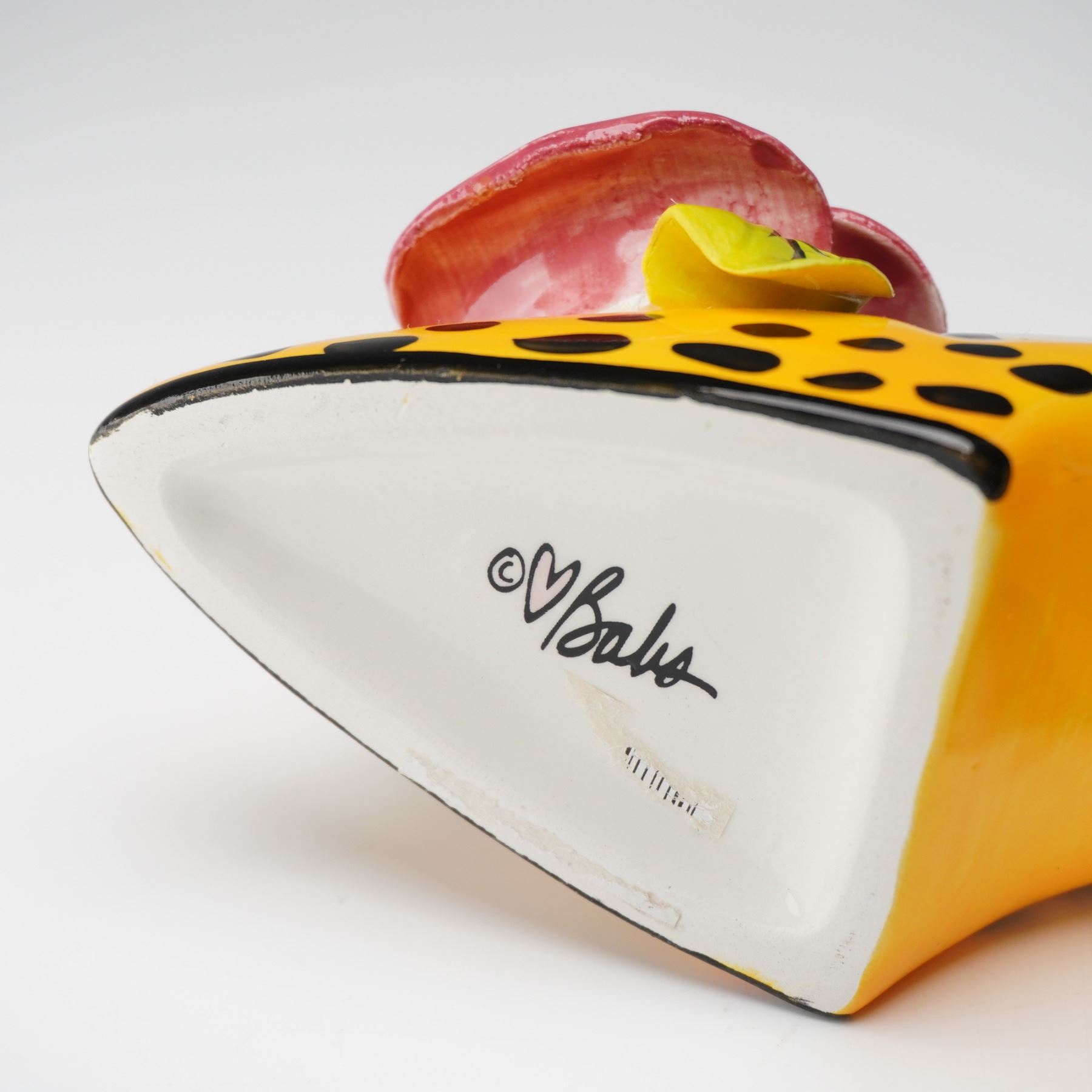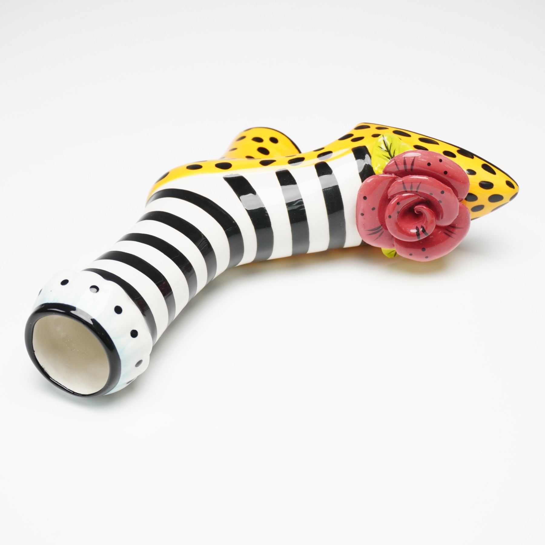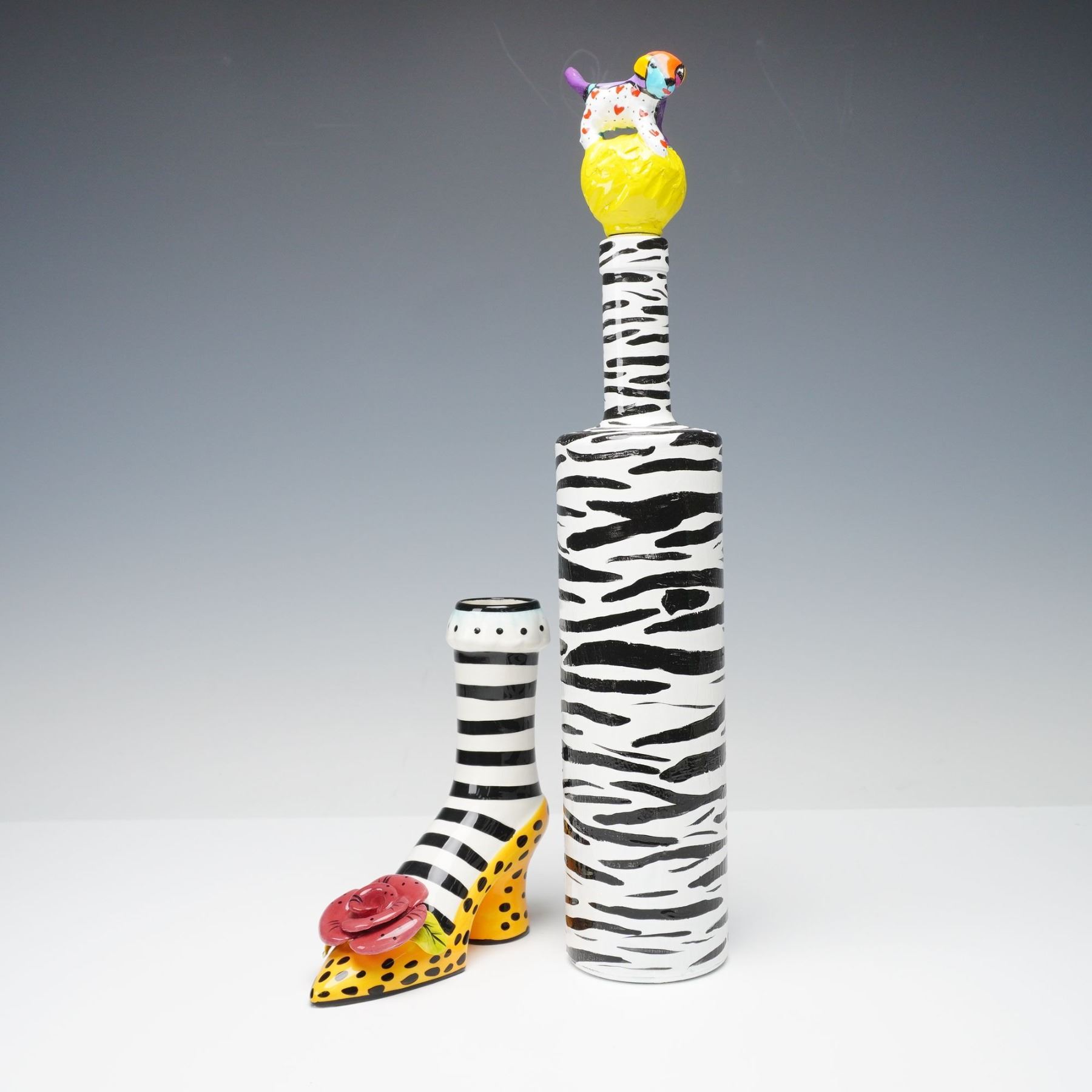 Playful and imaginative duo of contemporary art ceramics including a signed Babs porcelain shoe-form vase and a zebra-striped bottle with whimsical dog stopper. The Babs piece is vividly hand-painted with black and white stripes, a yellow polka-dotted base, and a sculpted red rose accent with green leaves. Signed Babs beneath the base, this vase showcases the artist's bold, humorous pop-art sensibility. The companion bottle, marked ZIV09 on the side, features a zebra pattern and an eye-catching stopper topped with a multicolor dog perched on a bright yellow sphere. Together, these pieces form a striking and eccentric display of modern decorative design, rich in color and personality.
