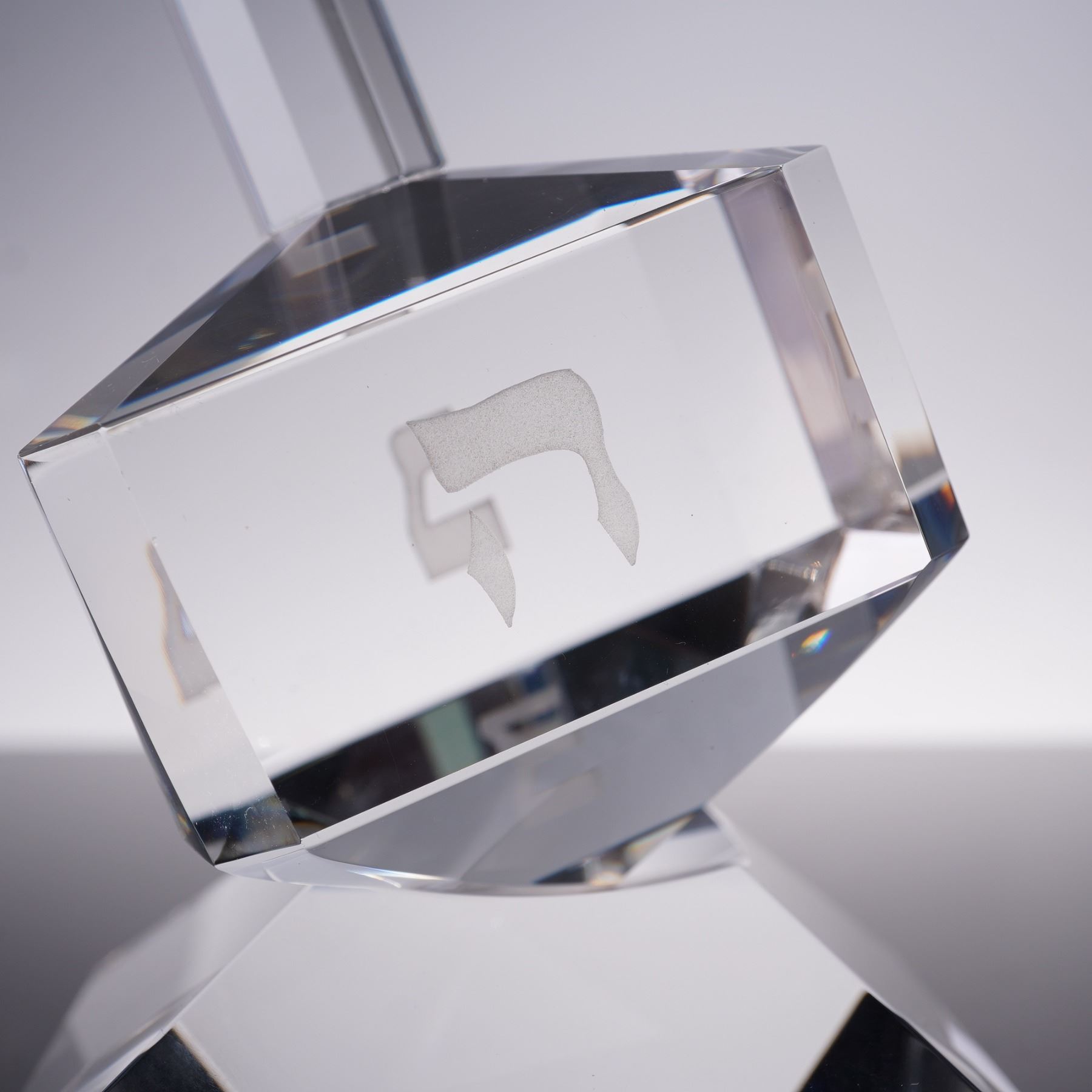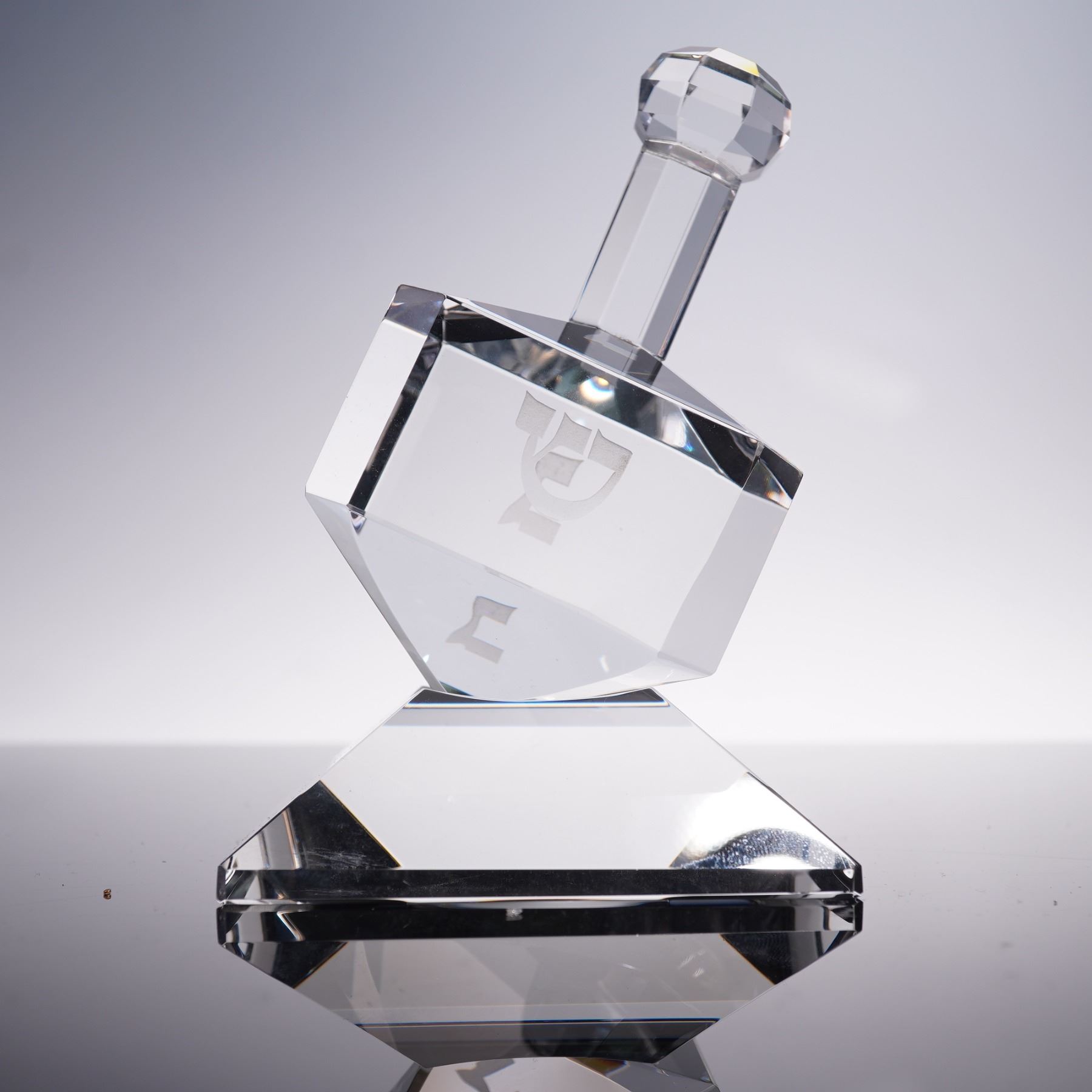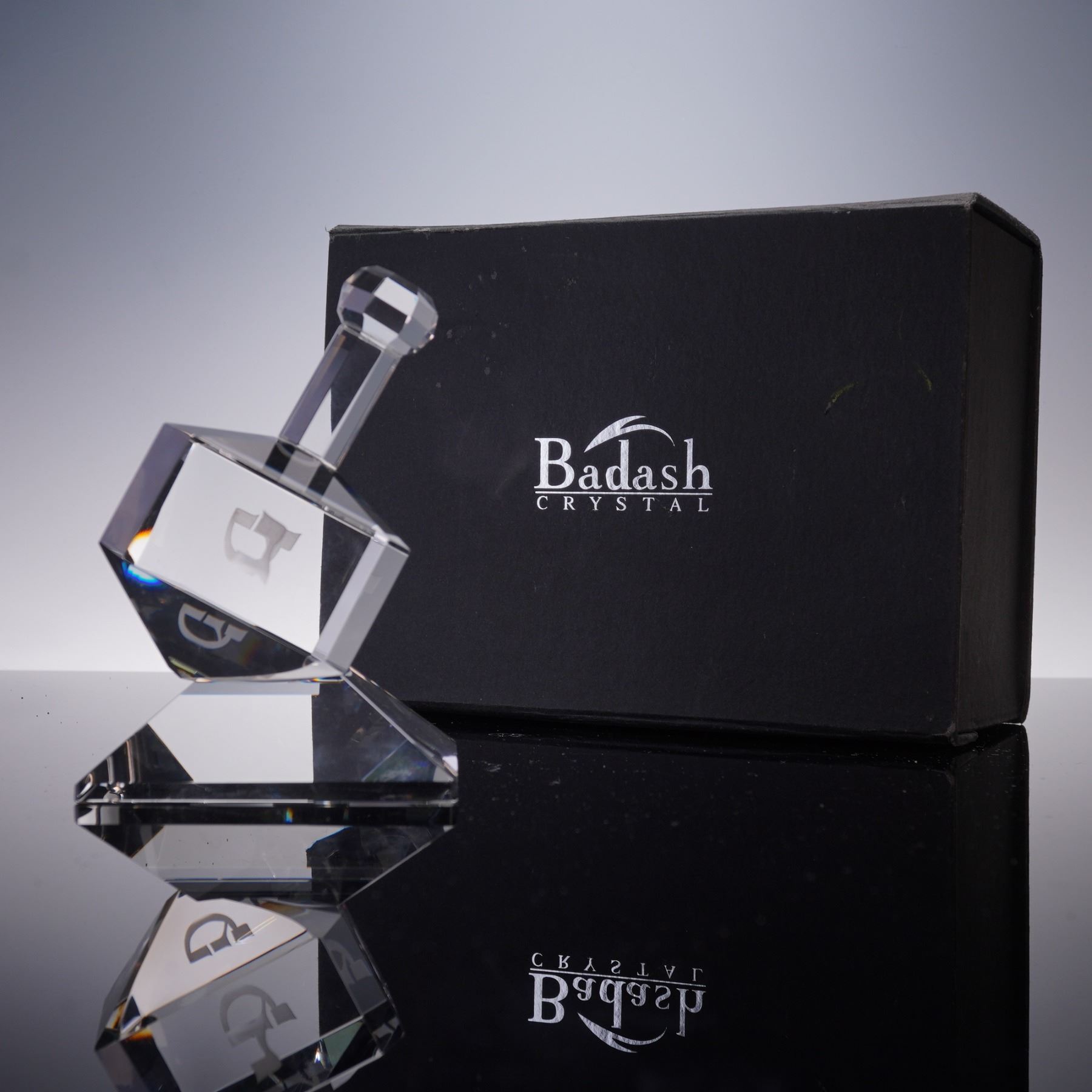 A finely crafted Badash Crystal dreidel accompanied by a matching crystal base. The dreidel features etched Hebrew letters on each side, with faceted edges that beautifully catch the light. The piece sits on a solid crystal stand, making it both a functional dreidel and a striking display piece. This item has its original box. Marked Badash on manufacturing box. Box measures: 7.75"L x 5.75"W x 3.25"H. Largest item measures: 2.5"L x 2.5"W x 4.5"H.