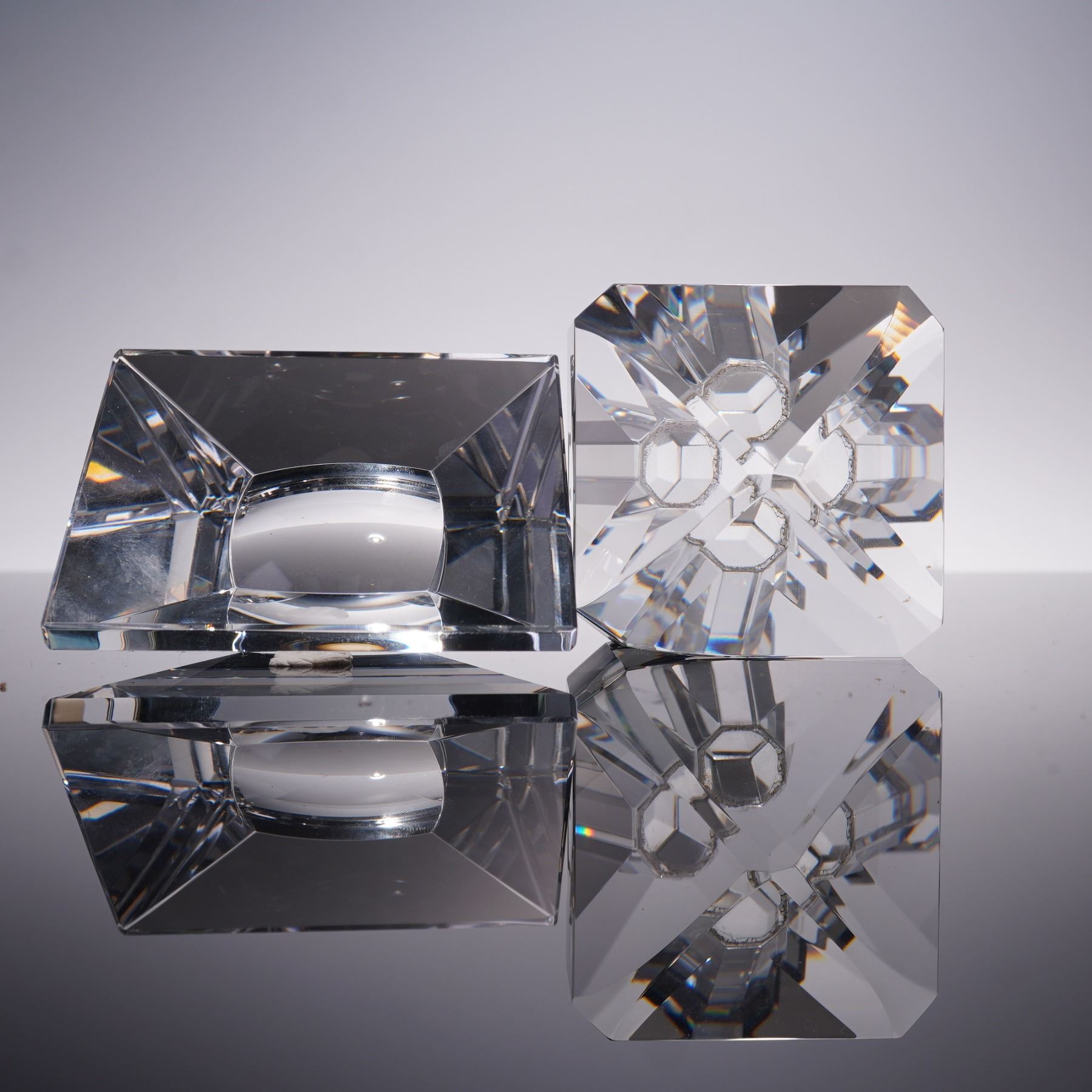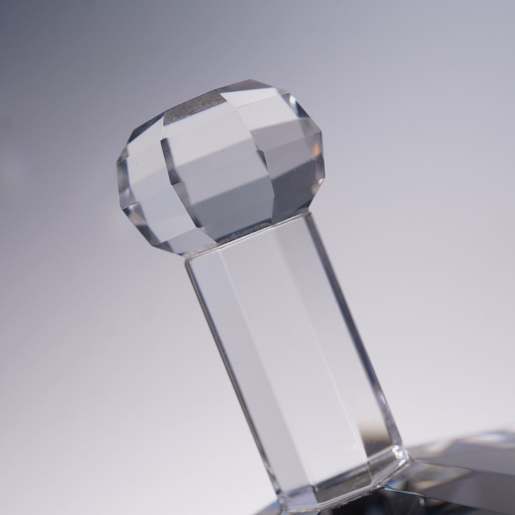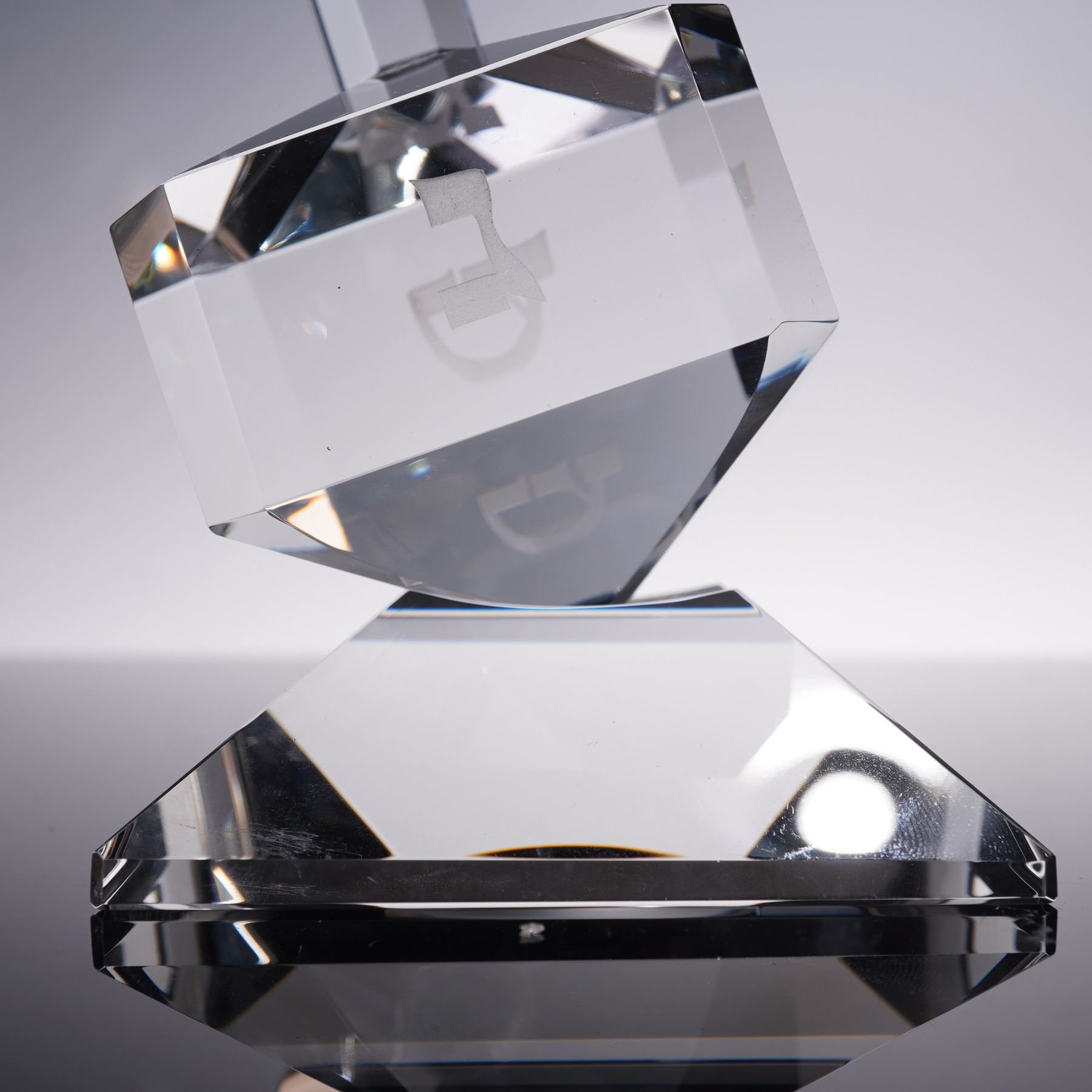 A finely crafted Badash Crystal dreidel accompanied by a matching crystal base. The dreidel features etched Hebrew letters on each side, with faceted edges that beautifully catch the light. The piece sits on a solid crystal stand, making it both a functional dreidel and a striking display piece. This item has its original box. Marked Badash on manufacturing box. Box measures: 7.75"L x 5.75"W x 3.25"H. Largest item measures: 2.5"L x 2.5"W x 4.5"H.