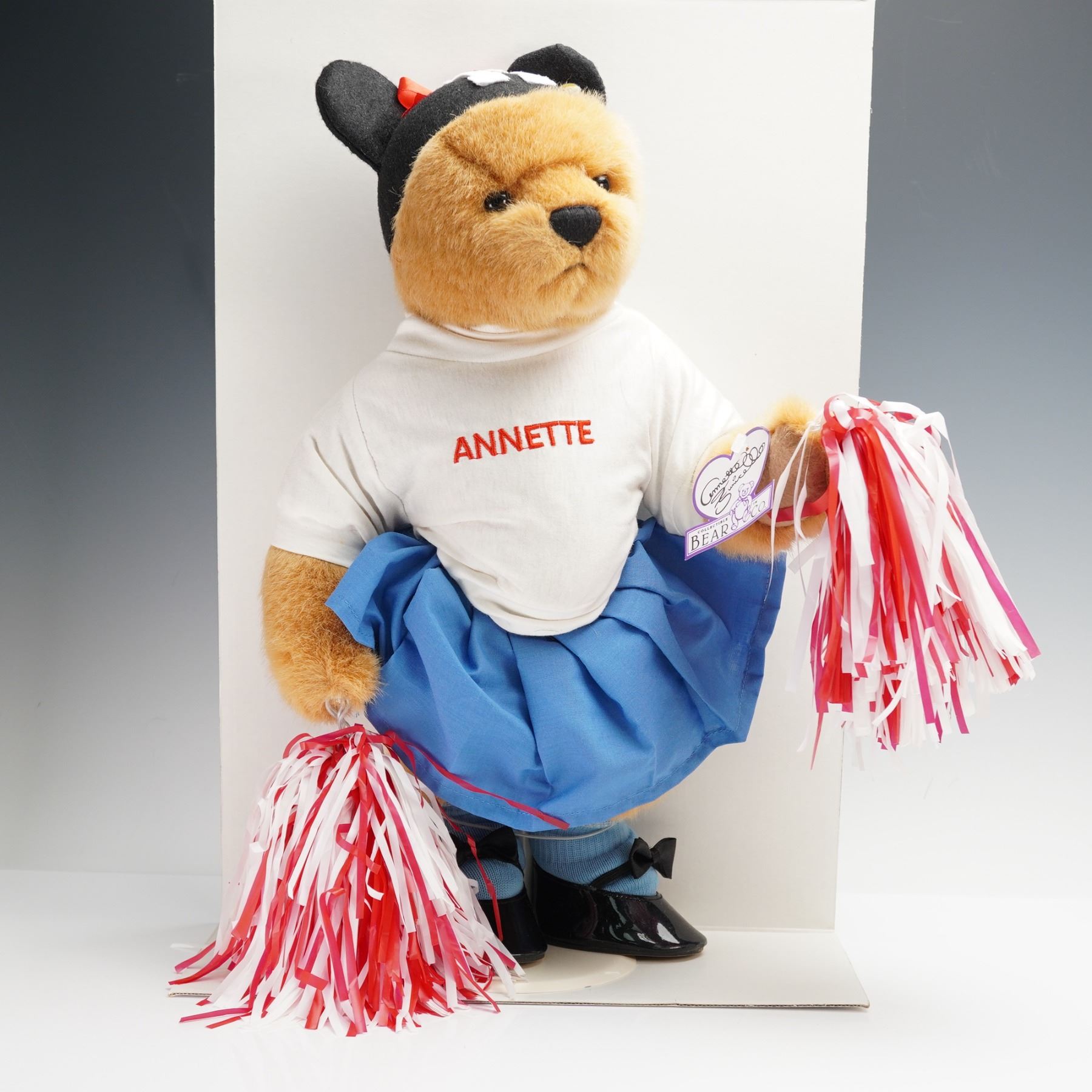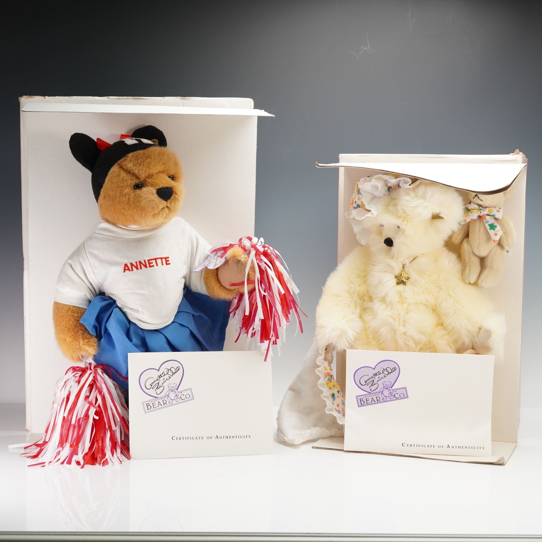 This 2-piece bear set by Annette Funicello Collectible Bear Company features two plush bears. The first bear is dressed in a pink outfit with a bonnet, and the second bear is modeled after Annette Funicello's character from the Mickey Mouse Club, dressed in a cheerleader uniform with a white top, blue skirt, and pom-poms. This item has its original box. Certificate of Authenticity included.