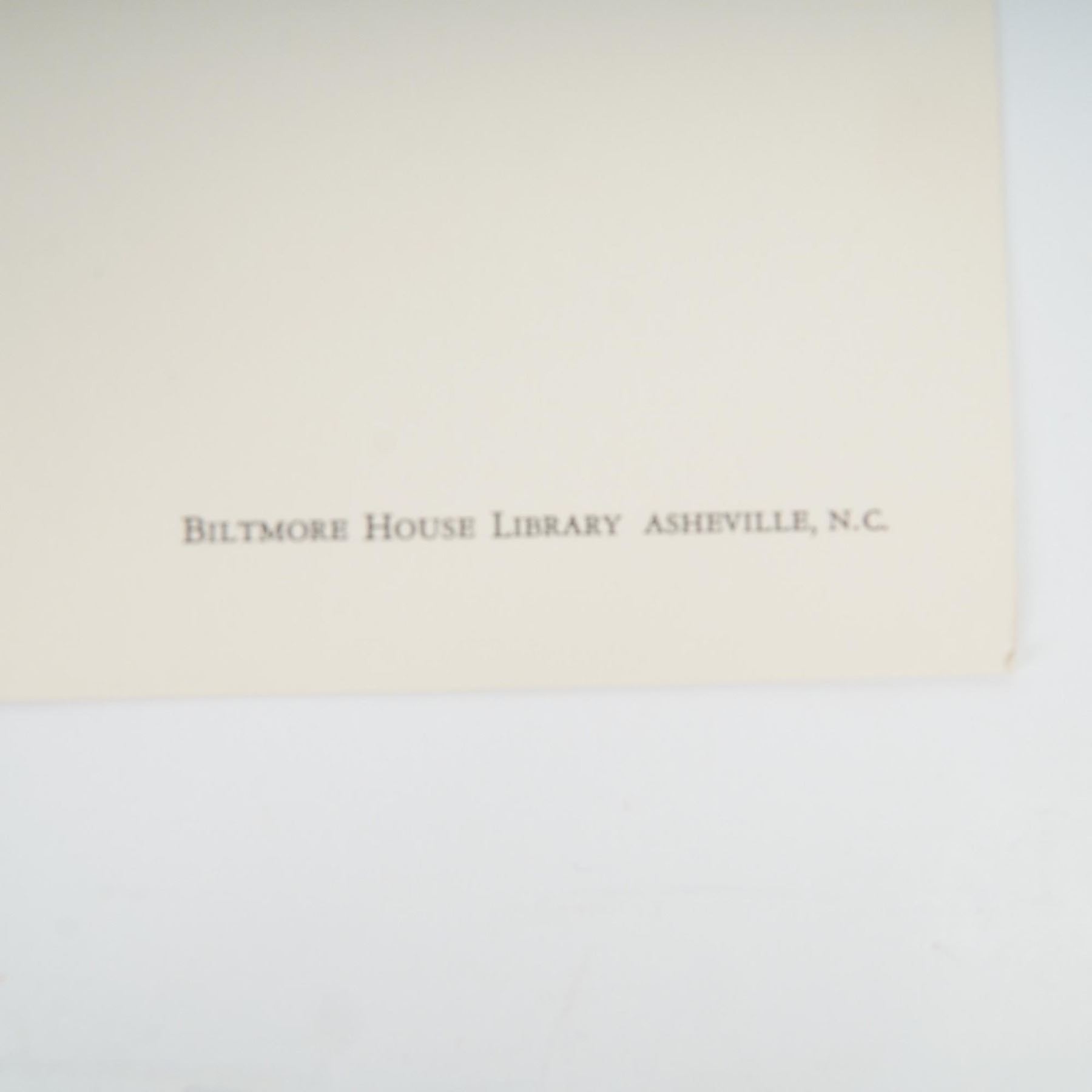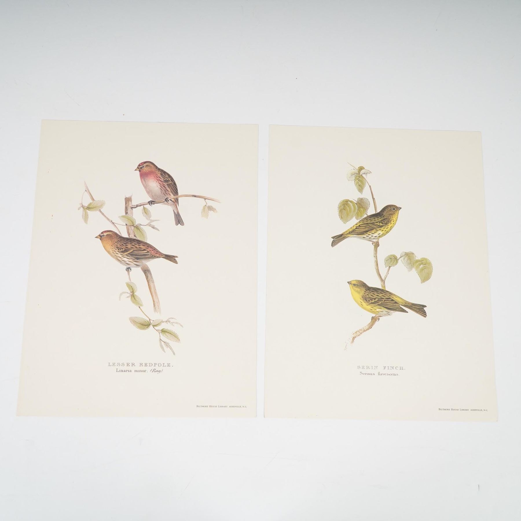 Pair of ornithological color lithographs featuring Serin Finch (Serinus flavescens) and Lesser Redpole (Linaria minor), both delicately illustrated on creamy stock with Latin classifications and printed notations from the Biltmore House Library, Asheville, North Carolina. Each print showcases two birds perched on flowering or leafy branches, rendered in soft, naturalistic tones. These plates reflect the elegant scientific illustration style popular in the late 19th and early 20th centuries, ideal for collectors of natural history art. Each sheet measures approximately 12"L x 16"H.