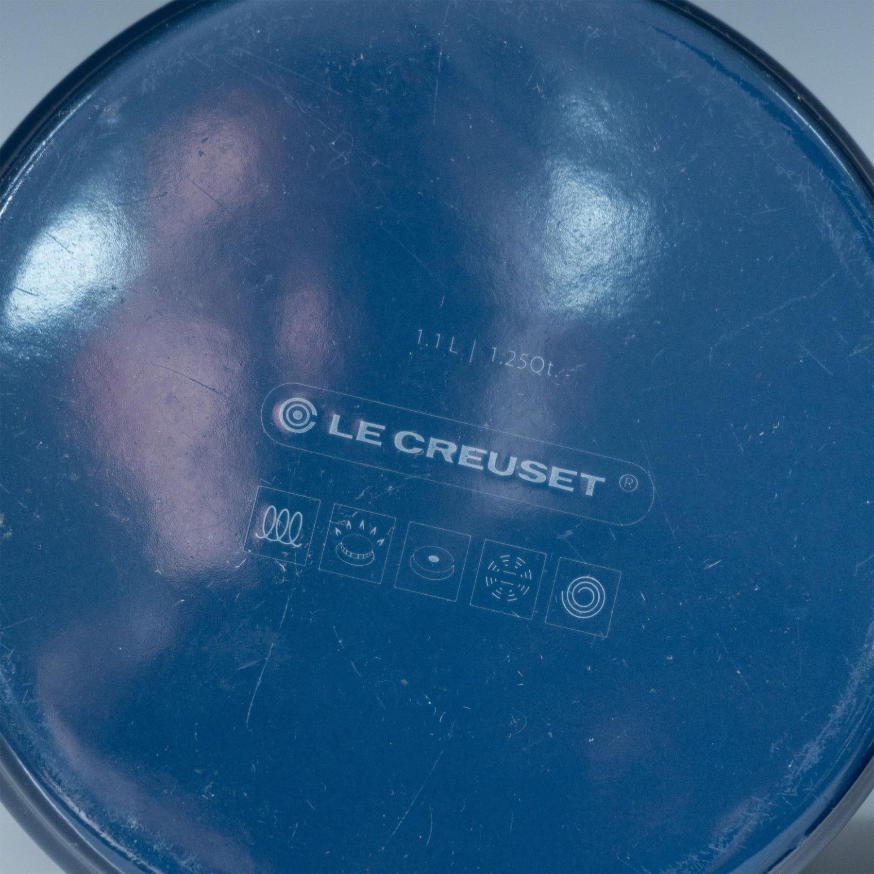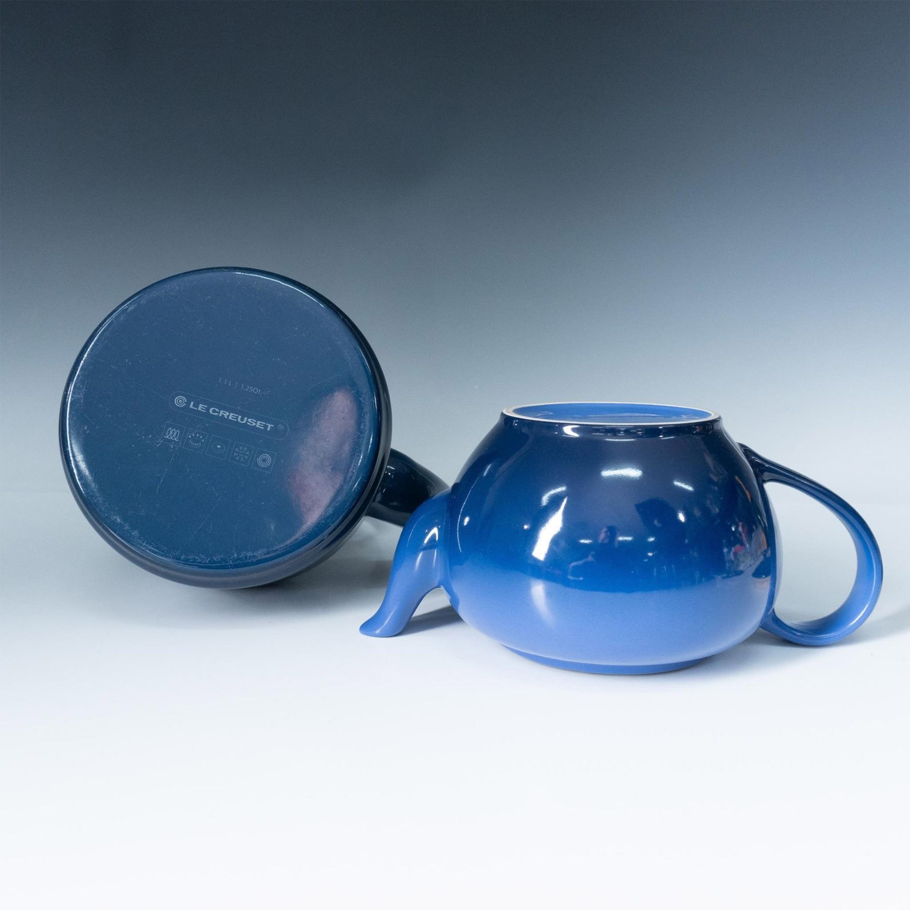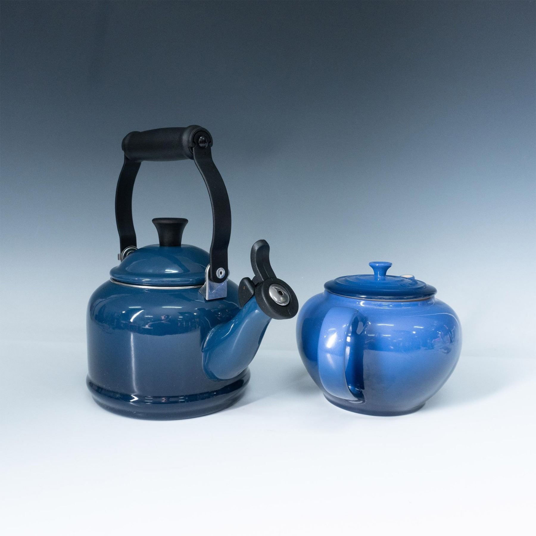 This delightful set includes an enamel-on-steel demi tea kettle and a classic stoneware teapot, both in stunning shades of blue. Le Creuset marking. Largest: 9.5"L x 6.25"W x 10"H.