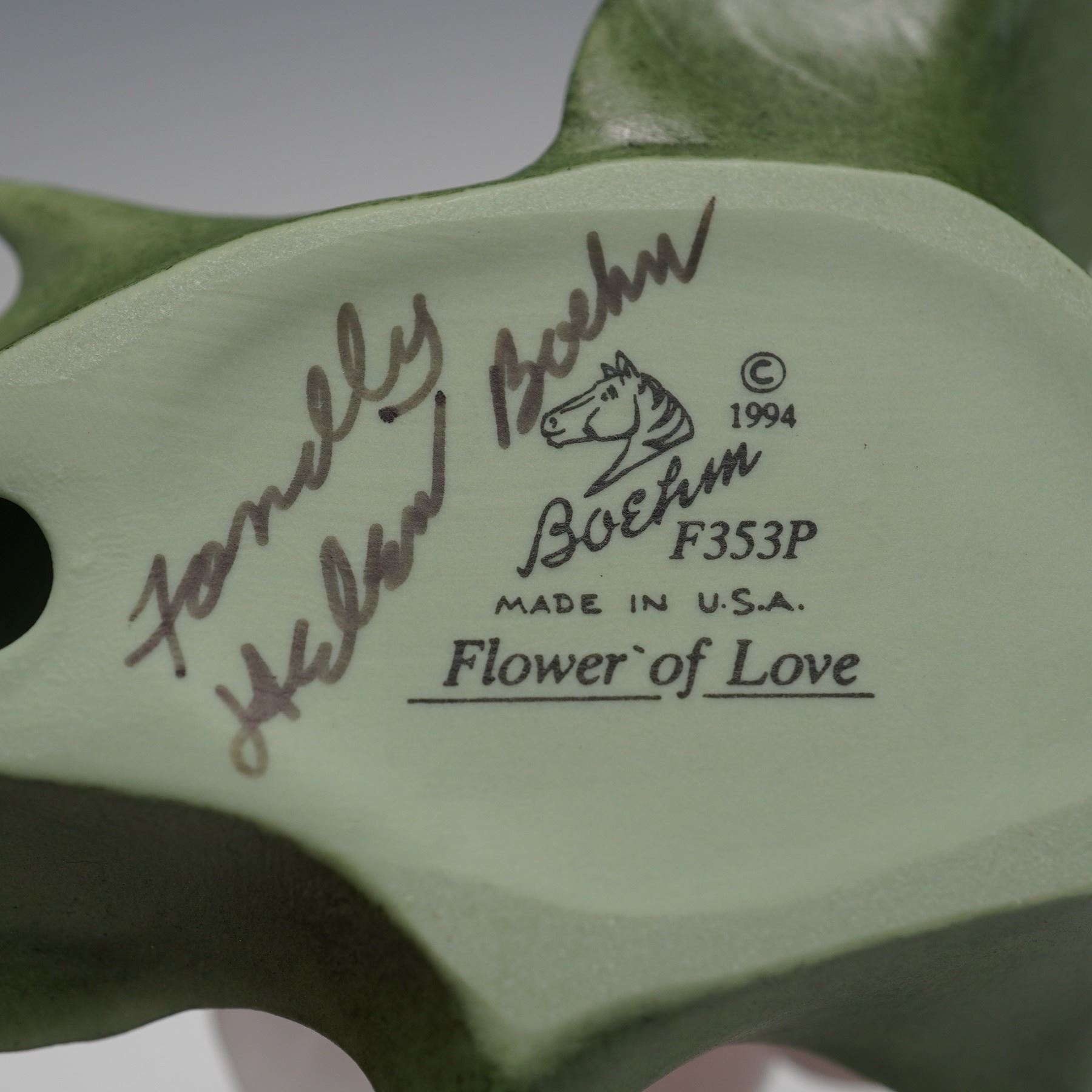 Hand crafted rose figurines , each rendered with remarkable delicacy and lifelike precision. The blossoms, in soft blush and peach tones, rest upon verdant leaves with naturalistic shading and form. Includes Flower of Love F353P and Barbara Bush rose F303. Flower of Love signed by Helen Boehm to the underside. Boehm Made in U.S.A. backstamp.