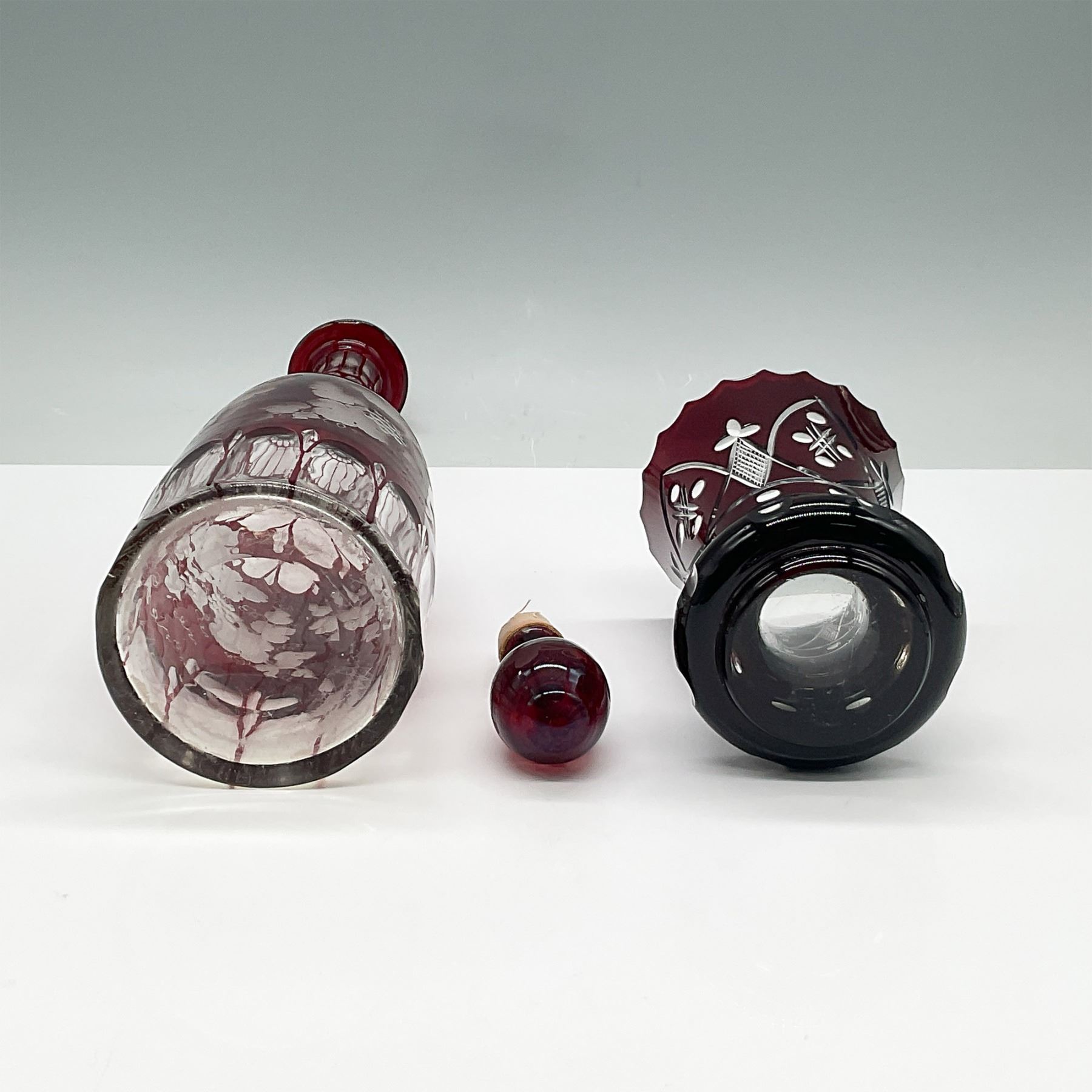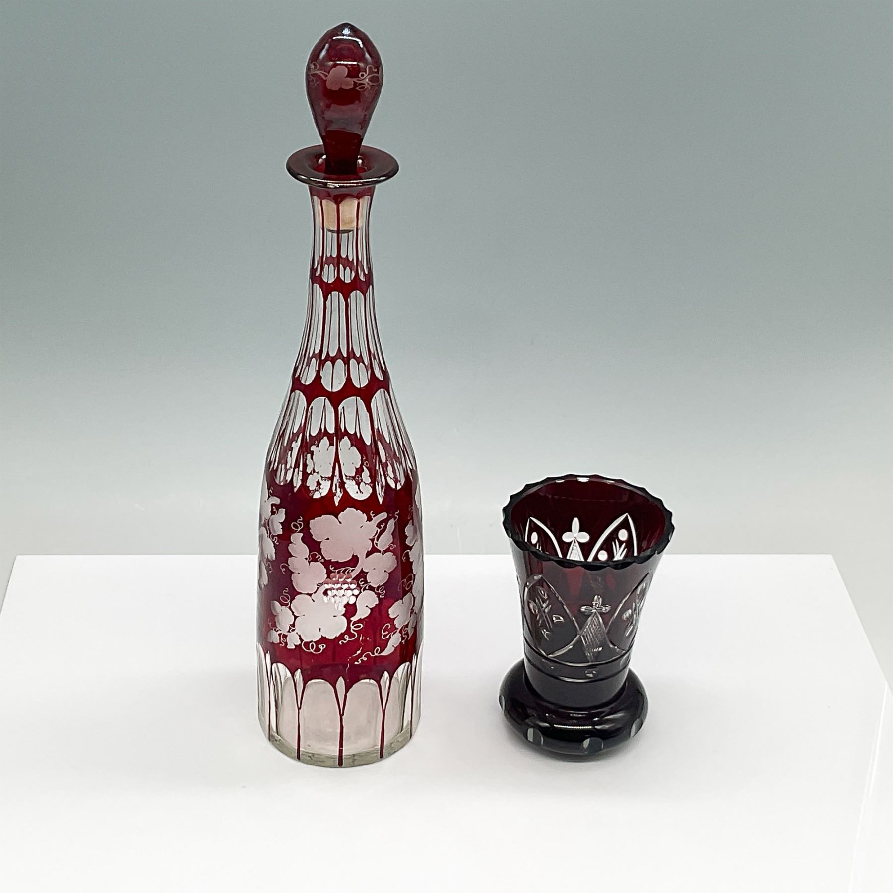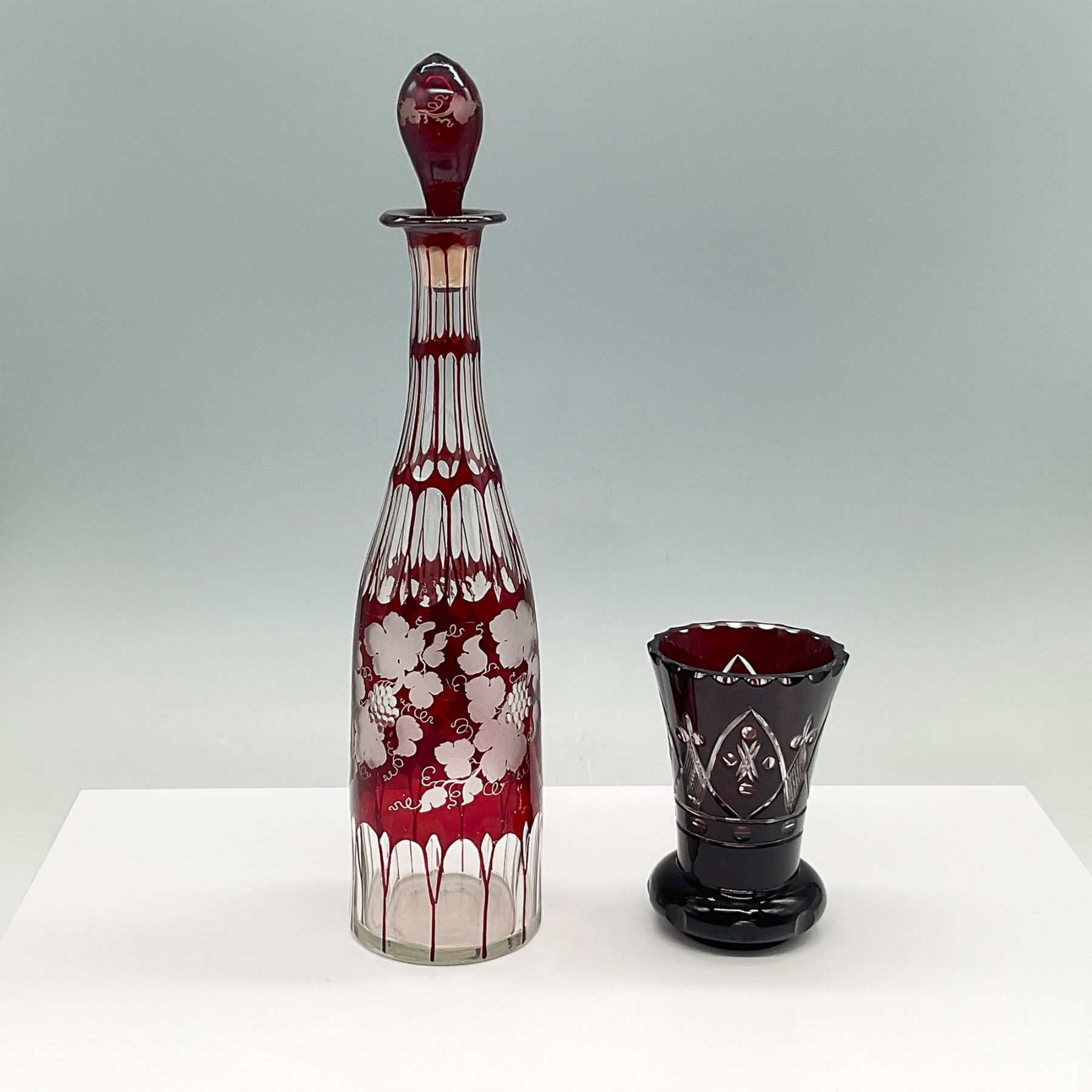 This lot features a stunning Bohemian ruby cut to clear glass decanter and matching goblet. The decanter showcases intricate floral and grapevine motifs with an elongated neck and its original faceted stopper, exhibiting expert craftsmanship. The accompanying goblet is decorated with etched floral designs and geometric patterns. Both pieces display exceptional clarity and vibrant ruby coloration, characteristic of traditional Bohemian glassmaking. Largest item measures 13.75"H.