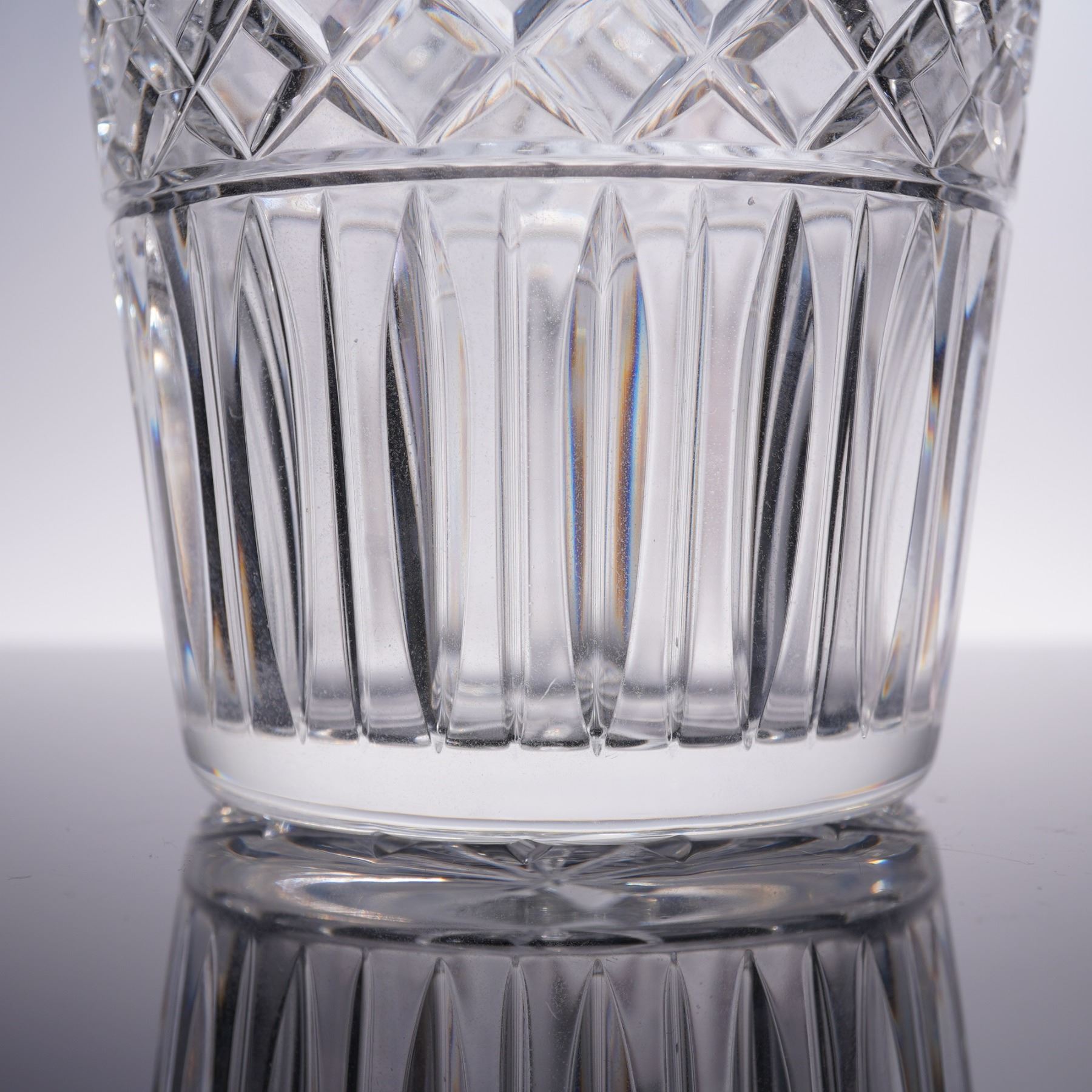 This elegant 2-piece cut crystal decanter and stopper set features deep vertical fluting accented with a bold crisscross pattern around the midsection. The heavy base is adorned with a large starburst cut, designed to catch and reflect light beautifully. Topping the piece is a unique faceted stopper with a honeycomb-style cut that adds texture and sparkle, perfectly complementing the decanter's timeless design. Ideal for serving or display, this piece combines classic craftsmanship with eye-catching detail.