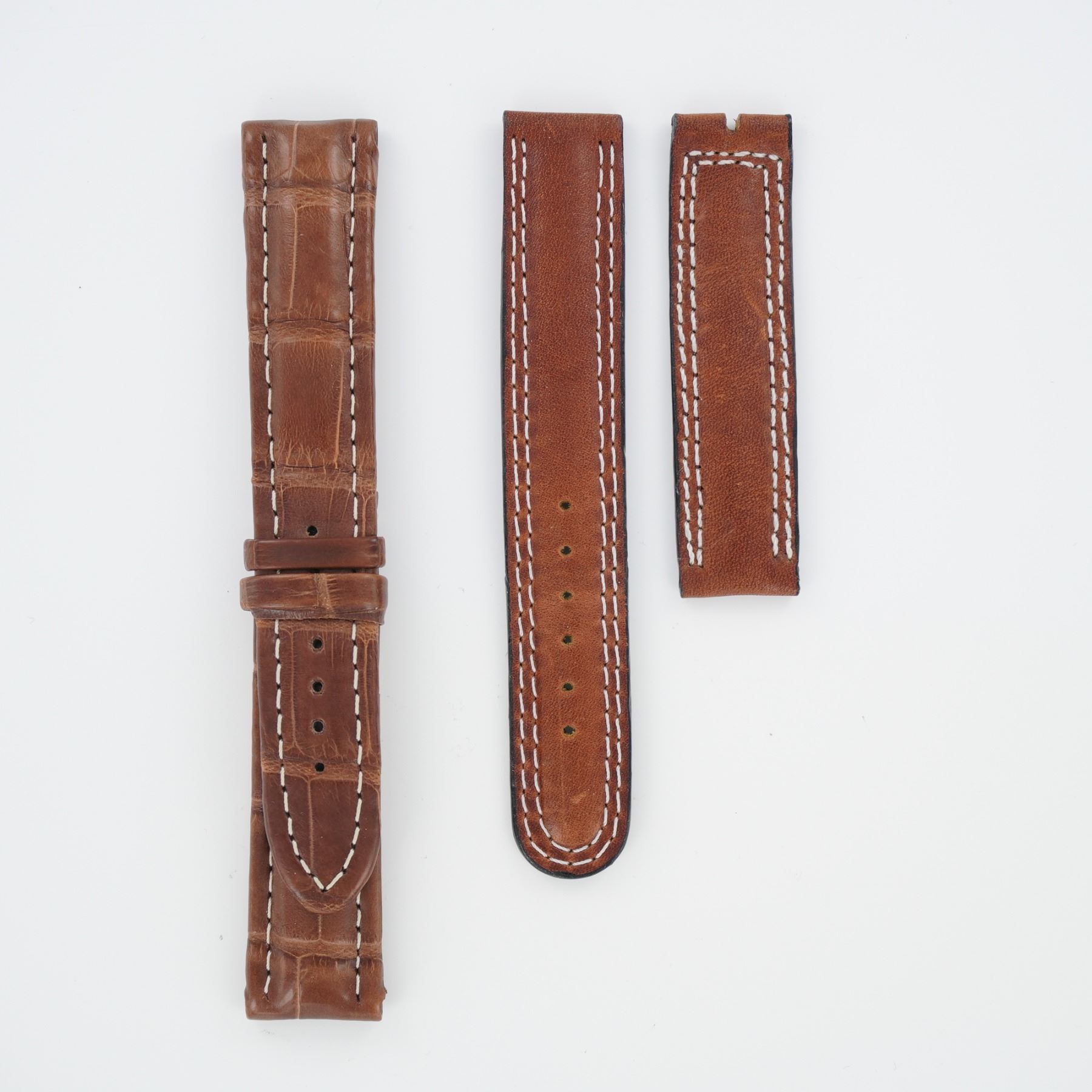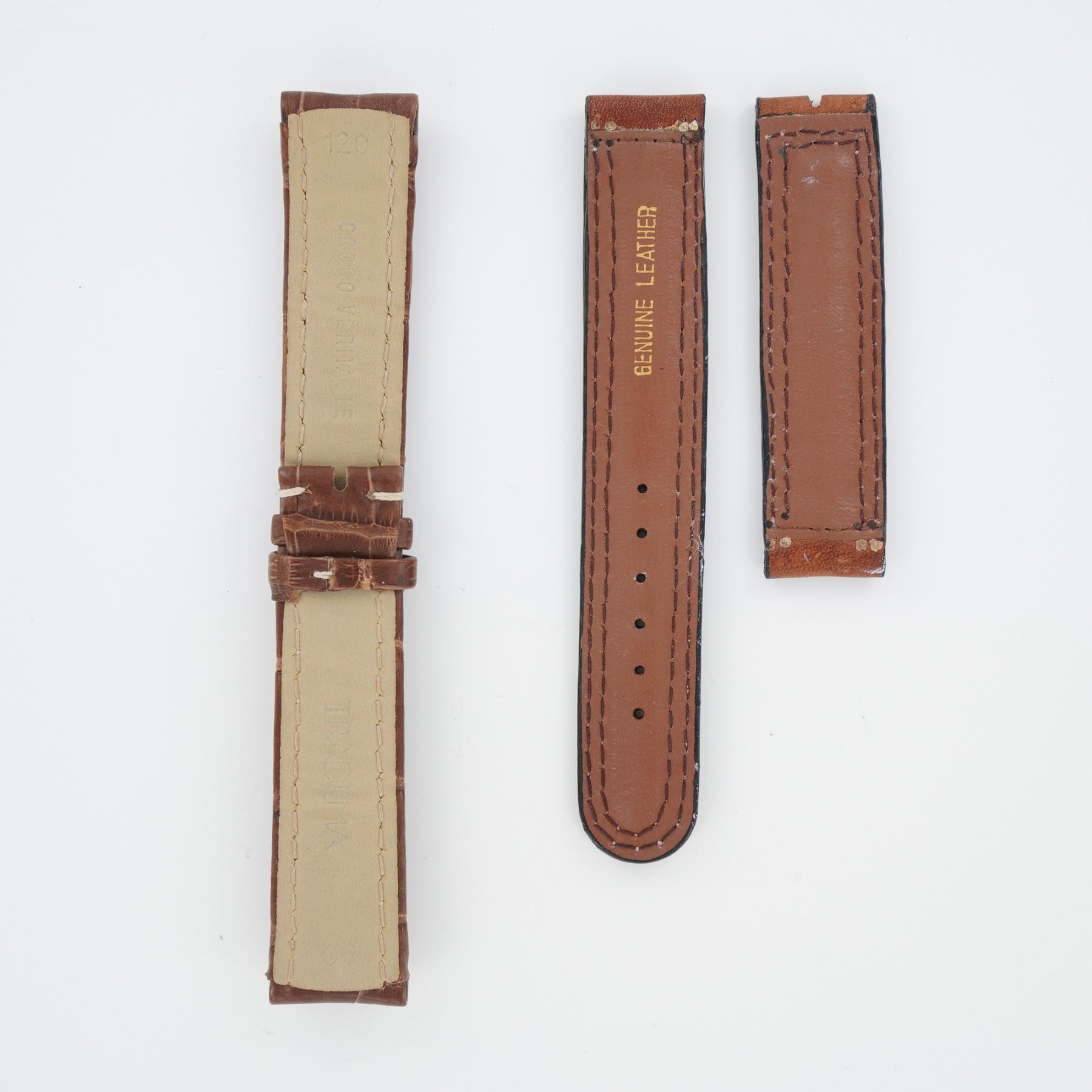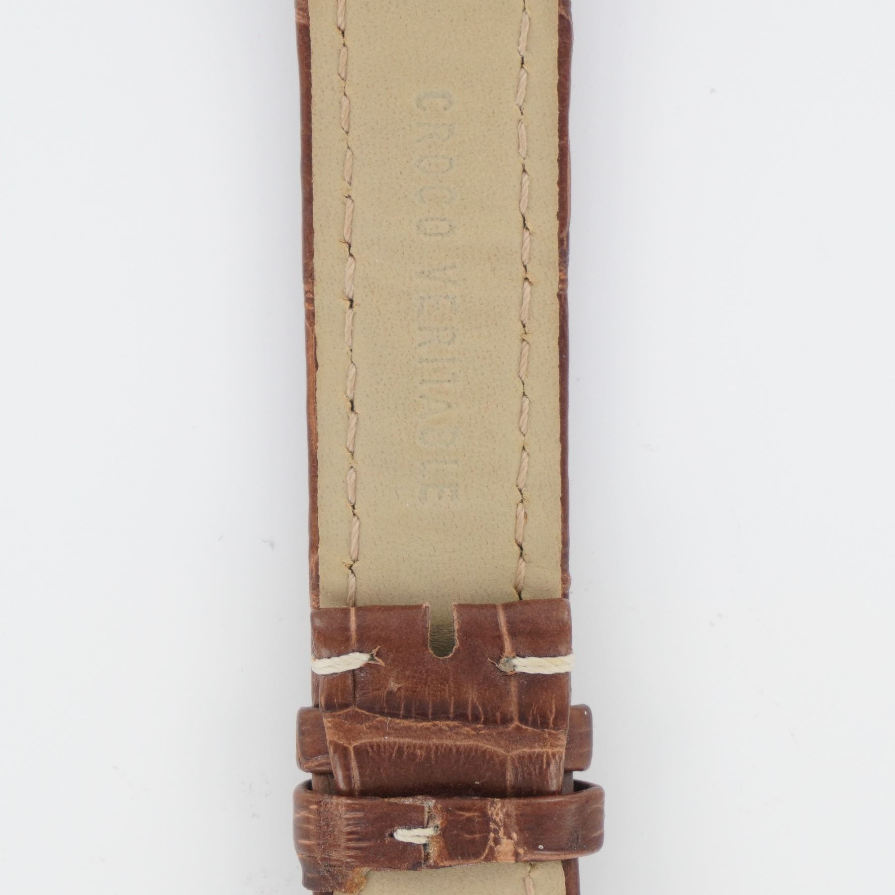 This lot includes two brown leather watch straps with contrast stitching. One marked Croco Veritable indicating genuine crocodile leather, and the other marked Genuine Leather. Both feature classic stitched edges and are suitable for traditional pin buckles.