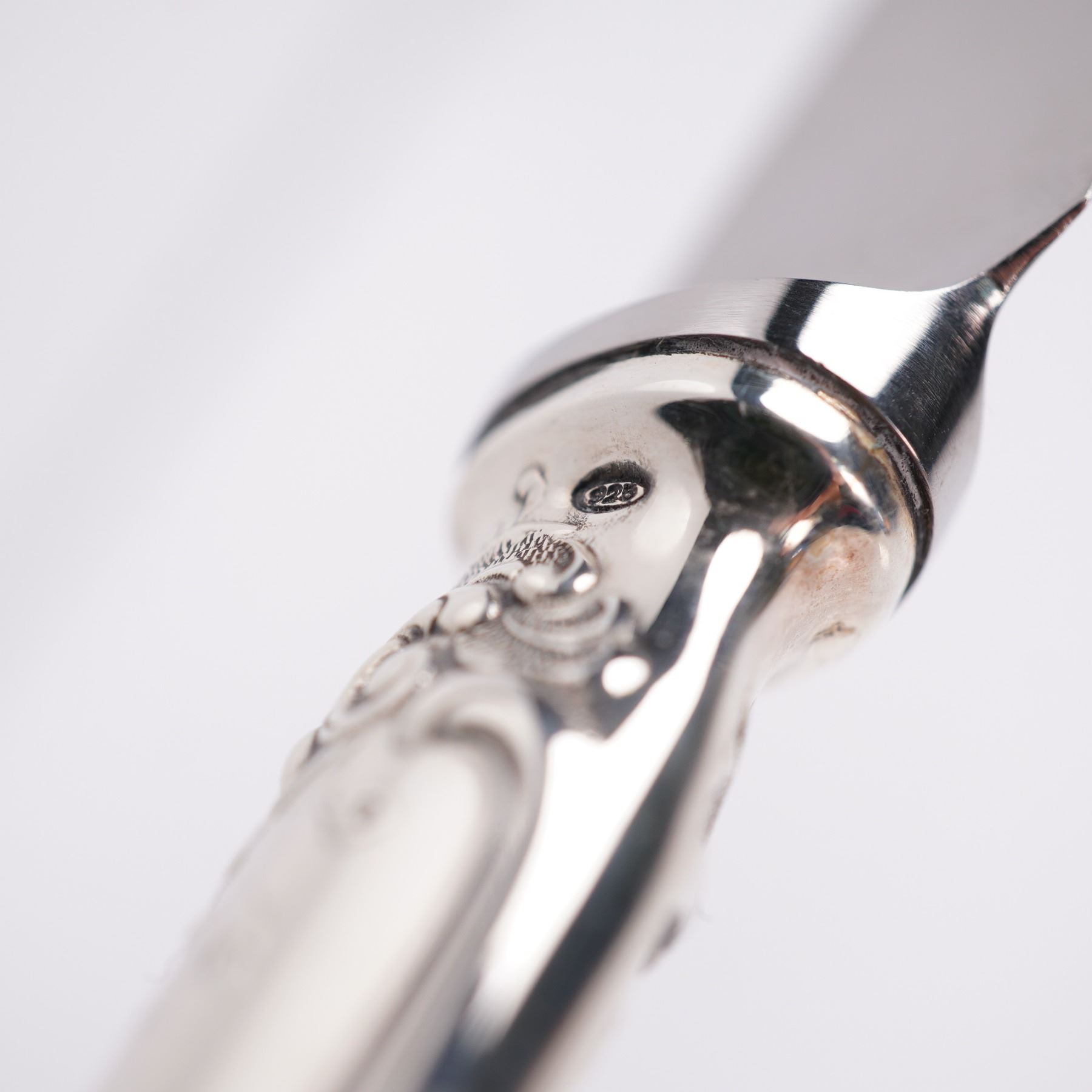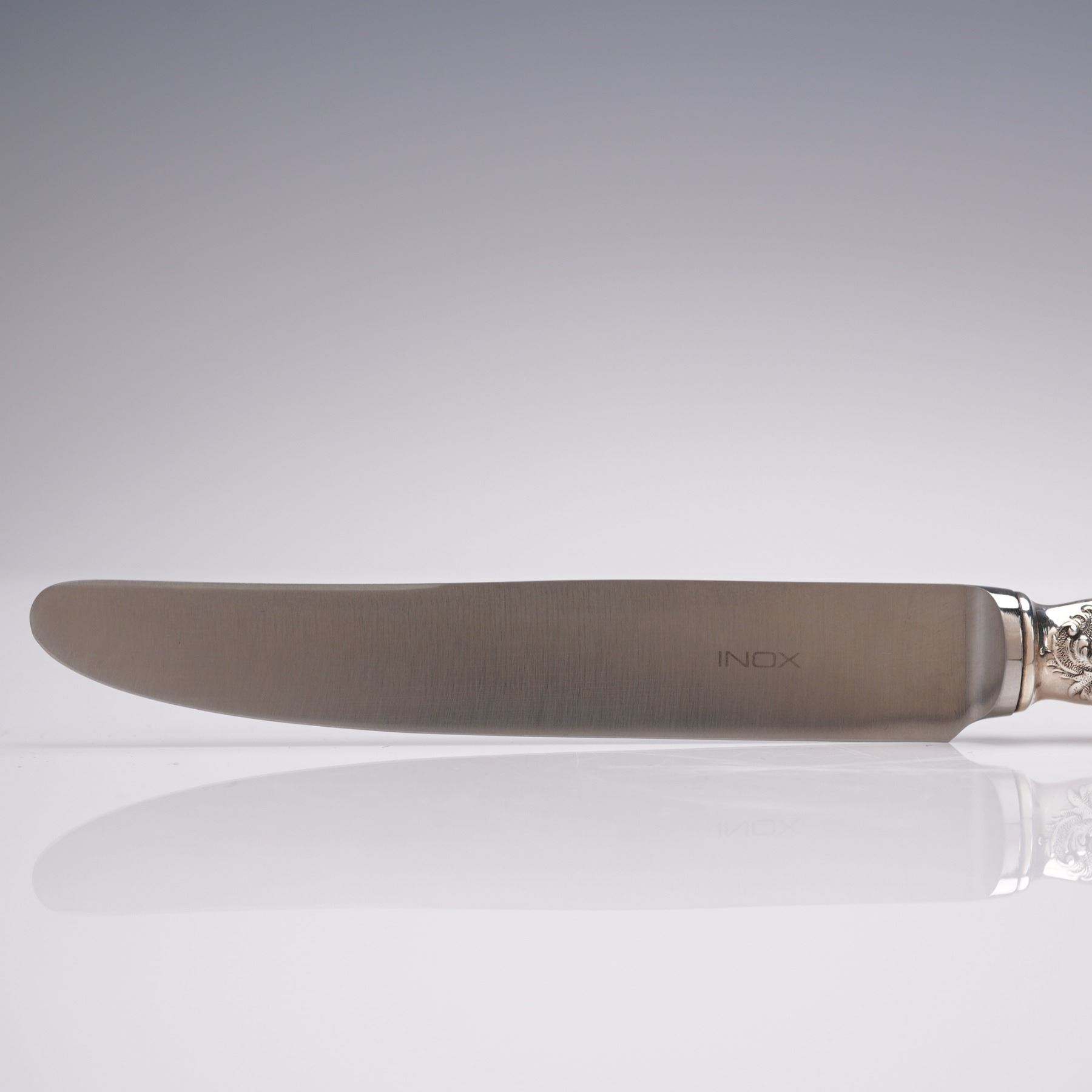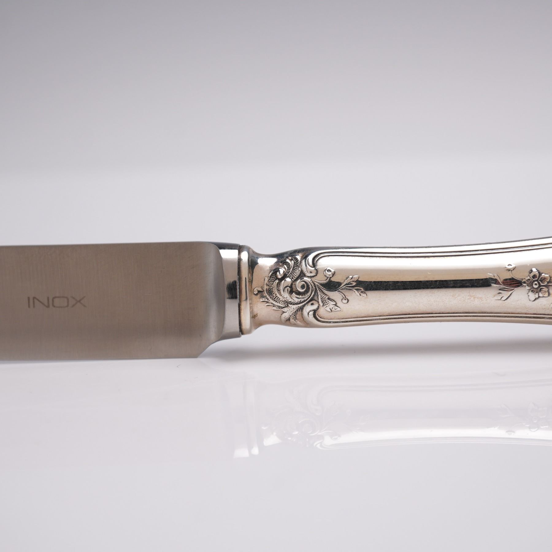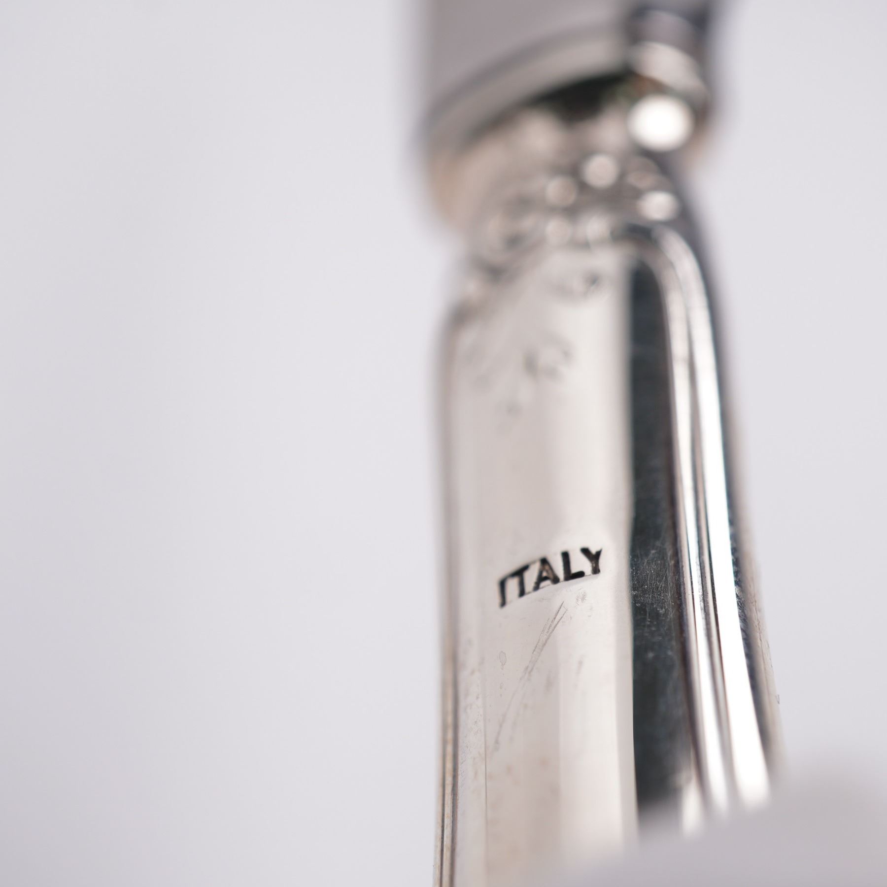 Pair of elegant sterling silver-handled fruit knives in the beautiful Monte Mario pattern by Buccellati, introduced in 1996. Each knife features a finely detailed floral and scroll motif with a smooth blank cartouche at the handle. The stainless steel blades are marked "INOX" and exhibit a gently rounded tip. The sterling handles are marked "Italy" and "925." Combined gross weight (including stainless steel blades): approximately 5.04 oz.