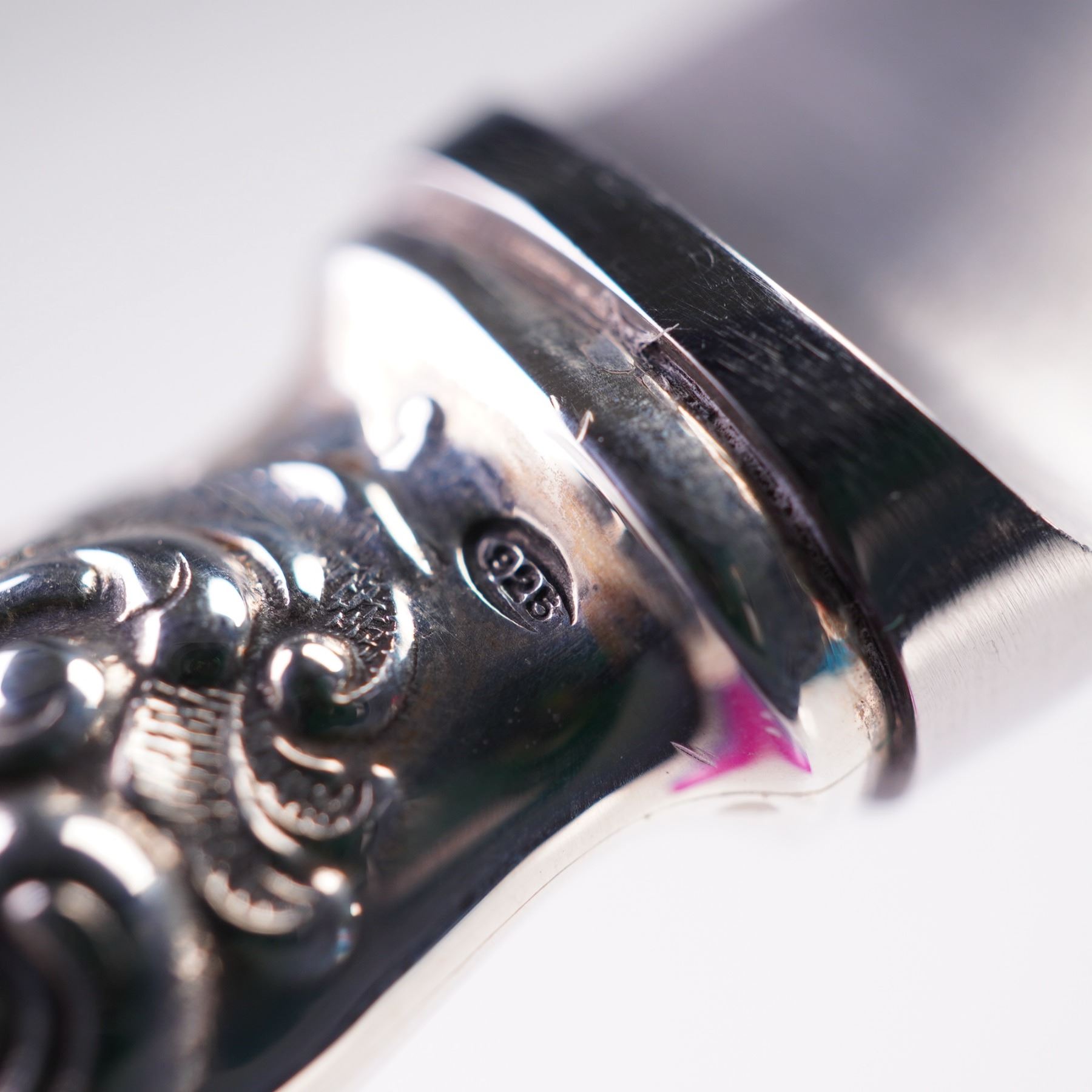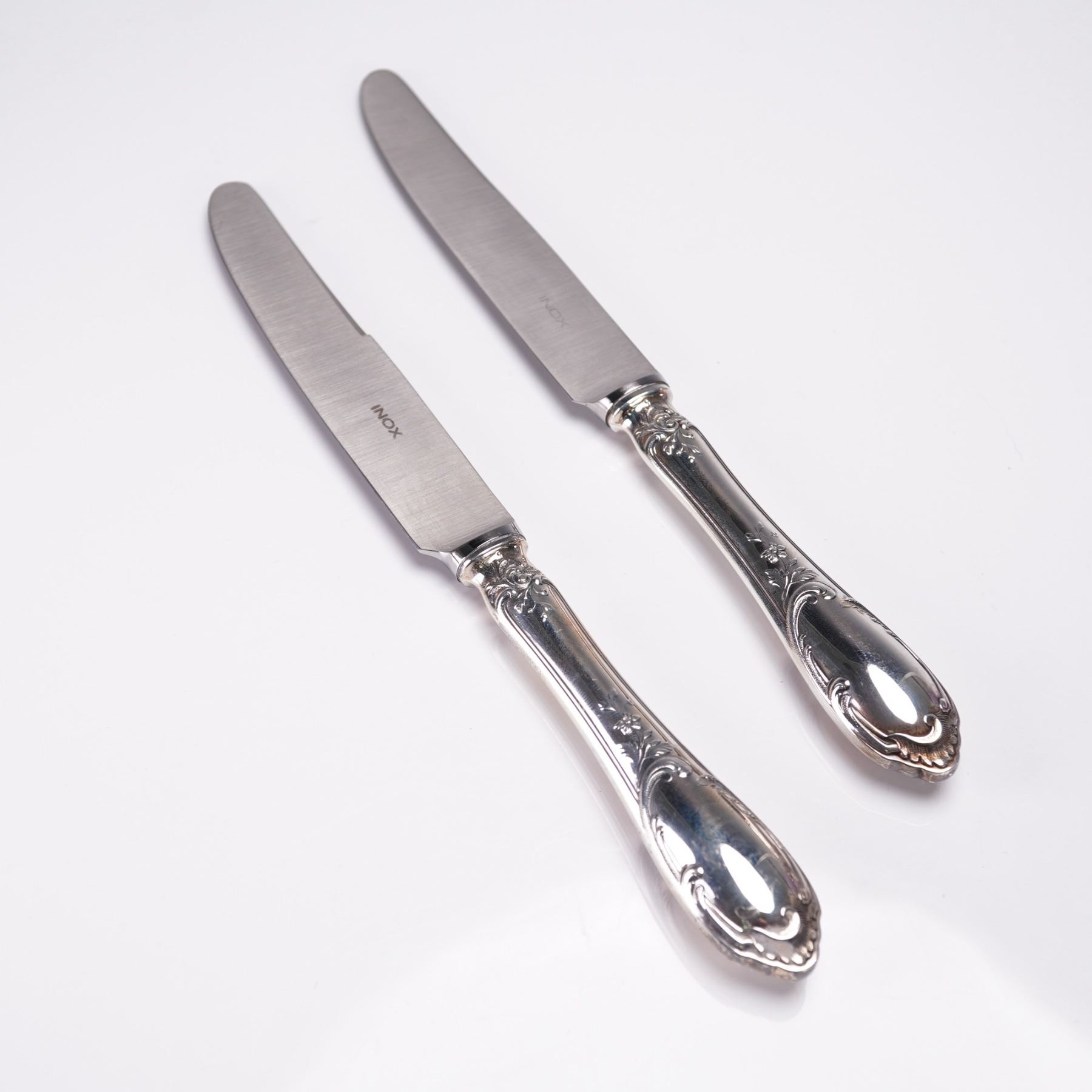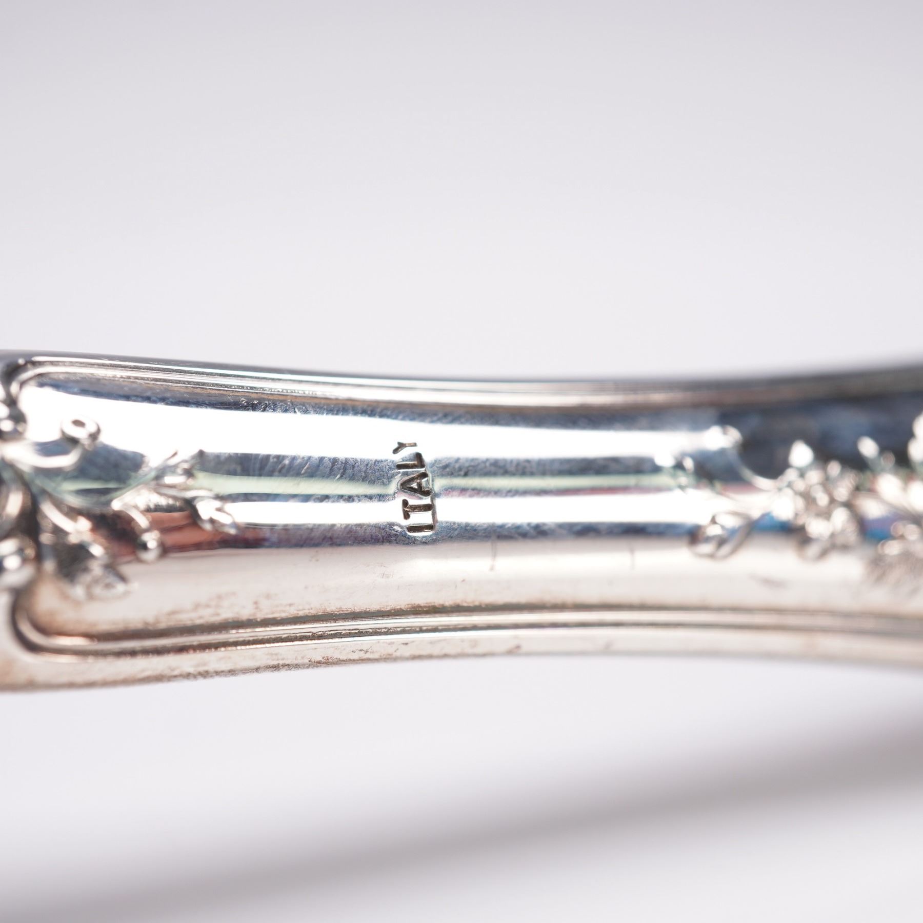 Pair of elegant sterling silver-handled fruit knives in the beautiful Monte Mario pattern by Buccellati, introduced in 1996. Each knife features a finely detailed floral and scroll motif with a smooth blank cartouche at the handle. The stainless steel blades are marked "INOX" and exhibit a gently rounded tip. The sterling handles are marked "Italy" and "925." Combined gross weight (including stainless steel blades): approximately 5.45 oz.