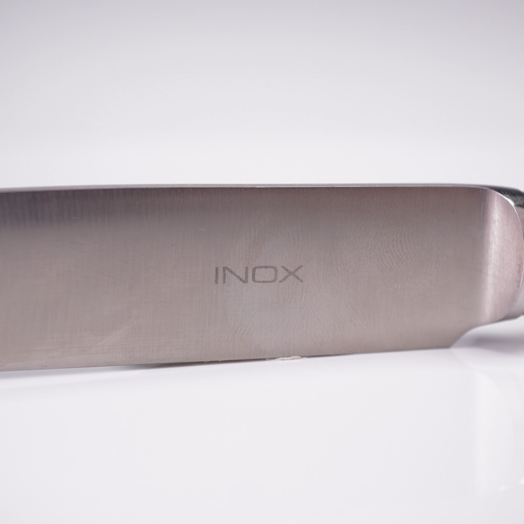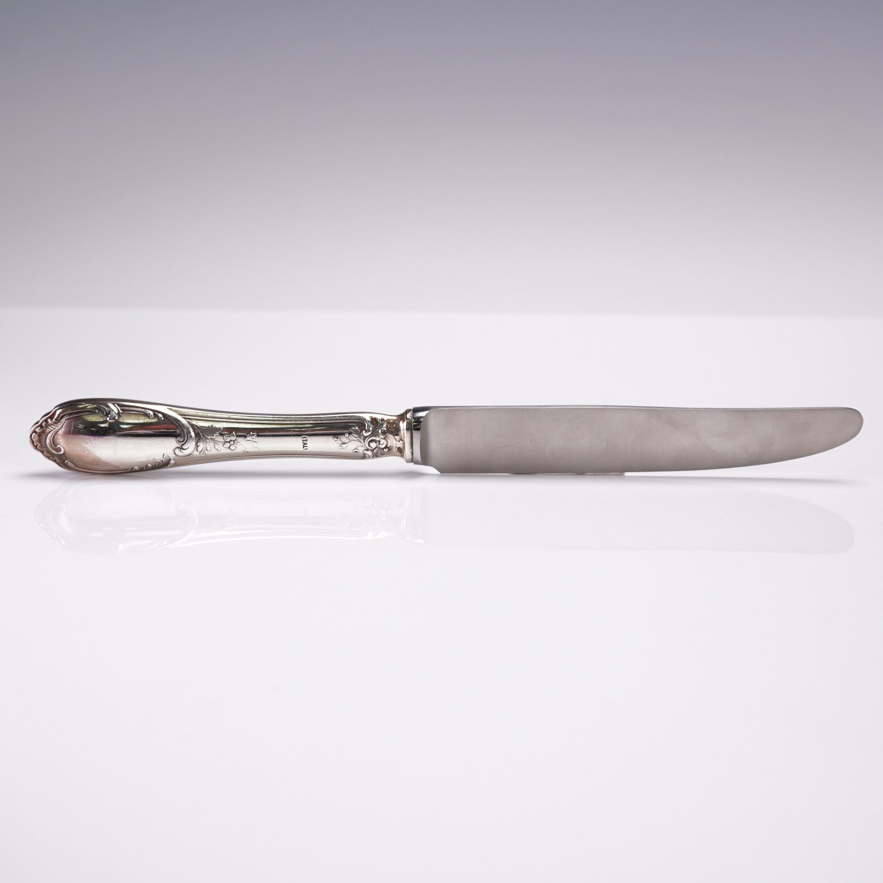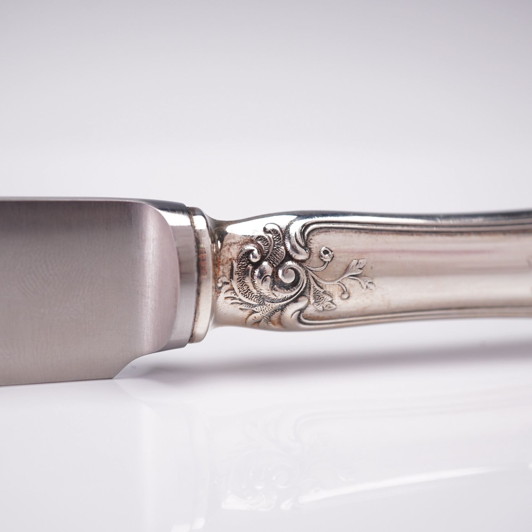 Pair of elegant sterling silver-handled fruit knives in the beautiful Monte Mario pattern by Buccellati, introduced in 1996. Each knife features a finely detailed floral and scroll motif with a smooth blank cartouche at the handle. The stainless steel blades are marked "INOX" and exhibit a gently rounded tip. The sterling handles are marked "Italy" and "925." Combined gross weight (including stainless steel blades): approximately 5.45 oz.