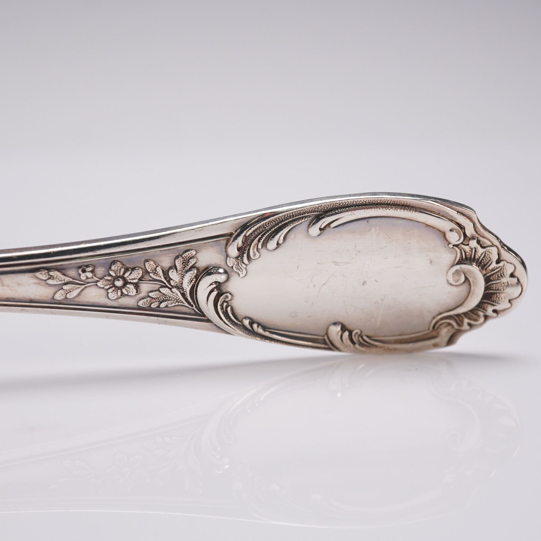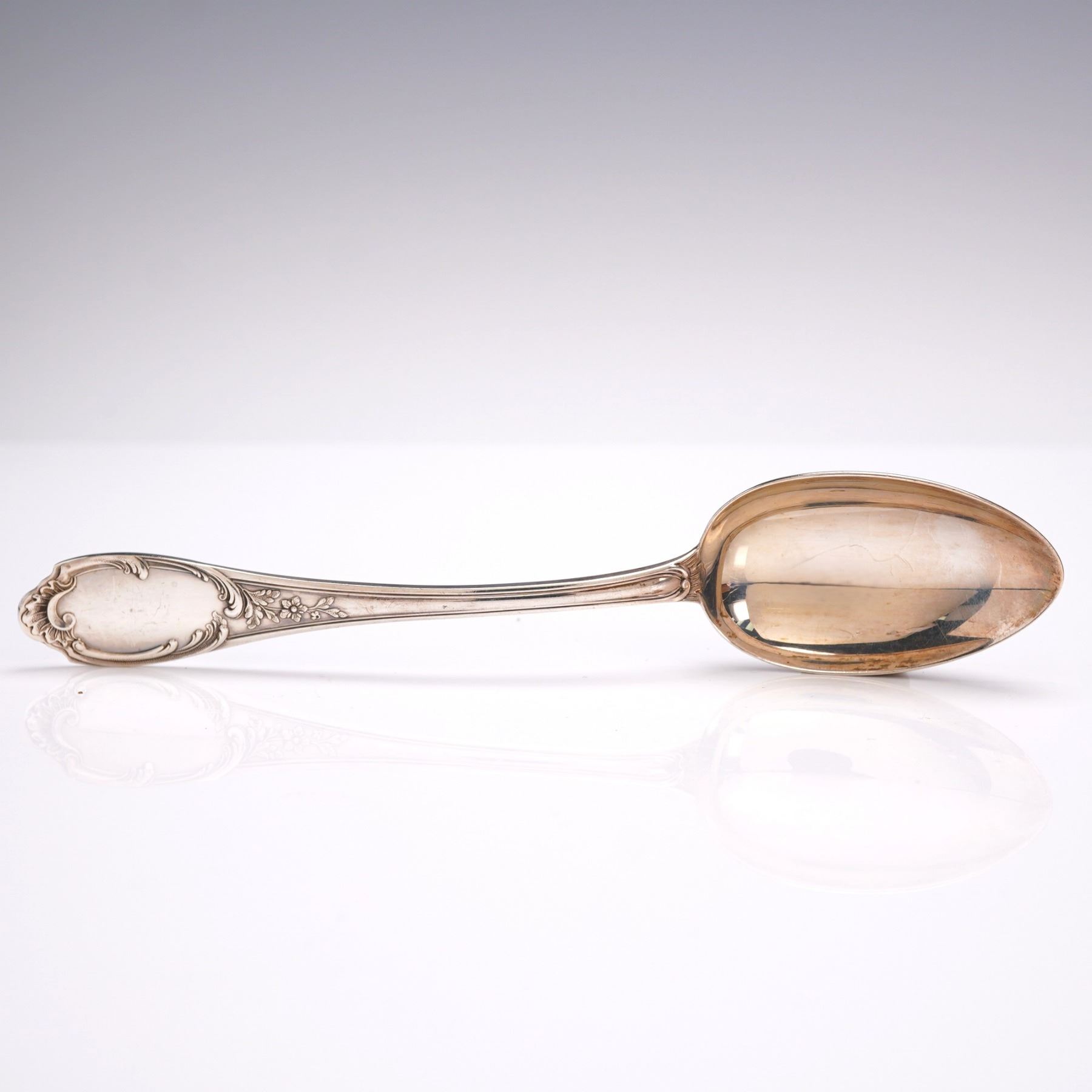 Pair of sterling silver place spoons in the richly decorated Monte Mario pattern by Buccellati, first issued in 1996. The handles display intricate floral and scroll accents, ending in a polished crest that contrasts with the surrounding detail. Each is stamped "Buccellati Sterling Italy" on the reverse. Combined net silver weight: approximately 2.77 troy oz.