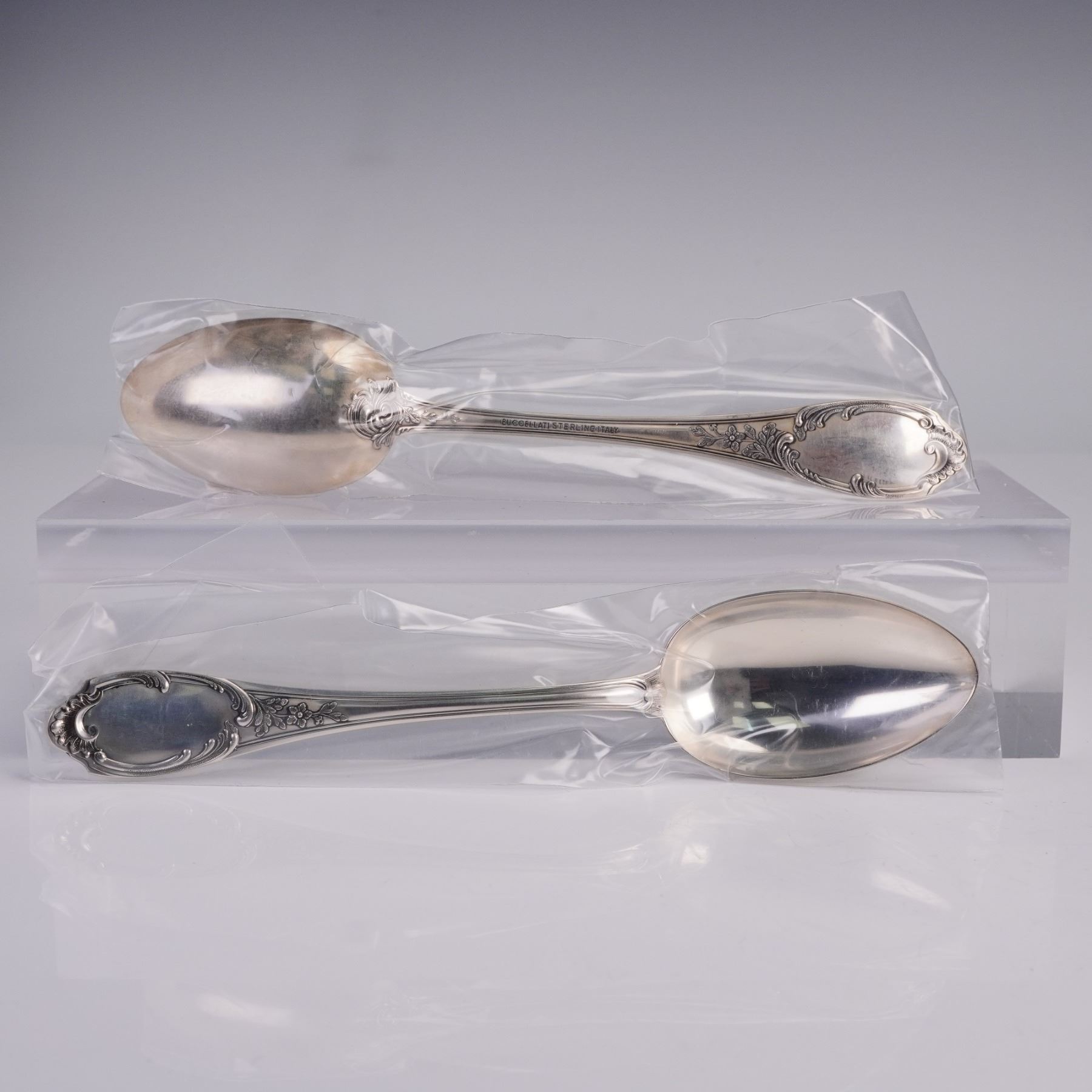 Pair of finely made sterling silver place spoons in the richly decorated Monte Mario pattern by Buccellati, first issued in 1996. The handles feature intricate, high-relief floral and scroll accents, culminating in a smooth, polished crest that offers a refined contrast to the ornate detailing. Crafted with exceptional attention to detail, each spoon is stamped "Buccellati Sterling Italy" on the reverse. Both pieces are enclosed in their original clear plastic sleeves. Combined gross weight (including packaging): approximately 3.13 oz.