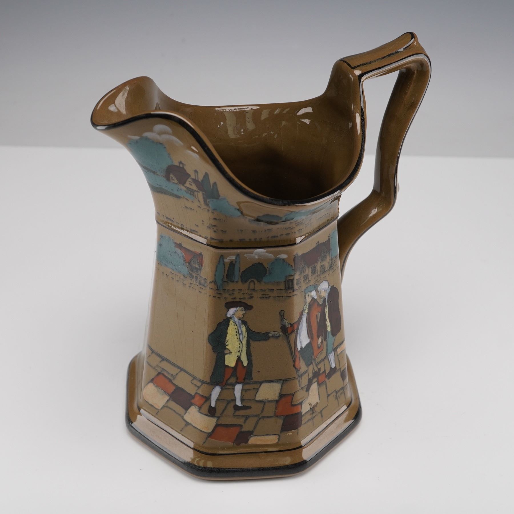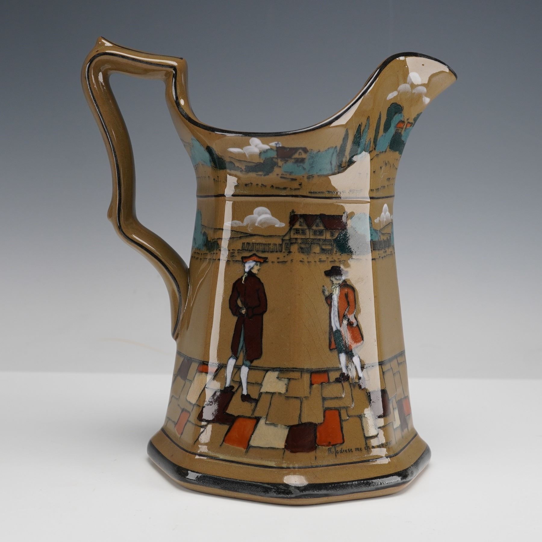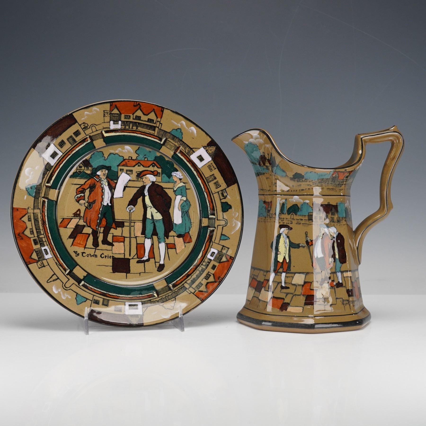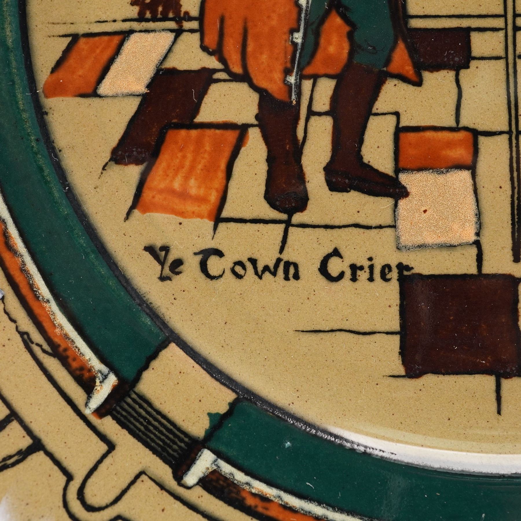 This Buffalo Pottery Deldare Ware set includes a pitcher and matching plate. The pitcher shows To Advise Me in a Whisper, with finely detailed figures in eighteenth century dress set against a painted village scene in warm brown and green hues. The plate features Ye Town Crier, showing a man reading a public notice to townsfolk in a cobblestone square, bordered by bold geometric patterns and rich earthy glazes. Buffalo Pottery backstamp. Marked Deldare Ware.