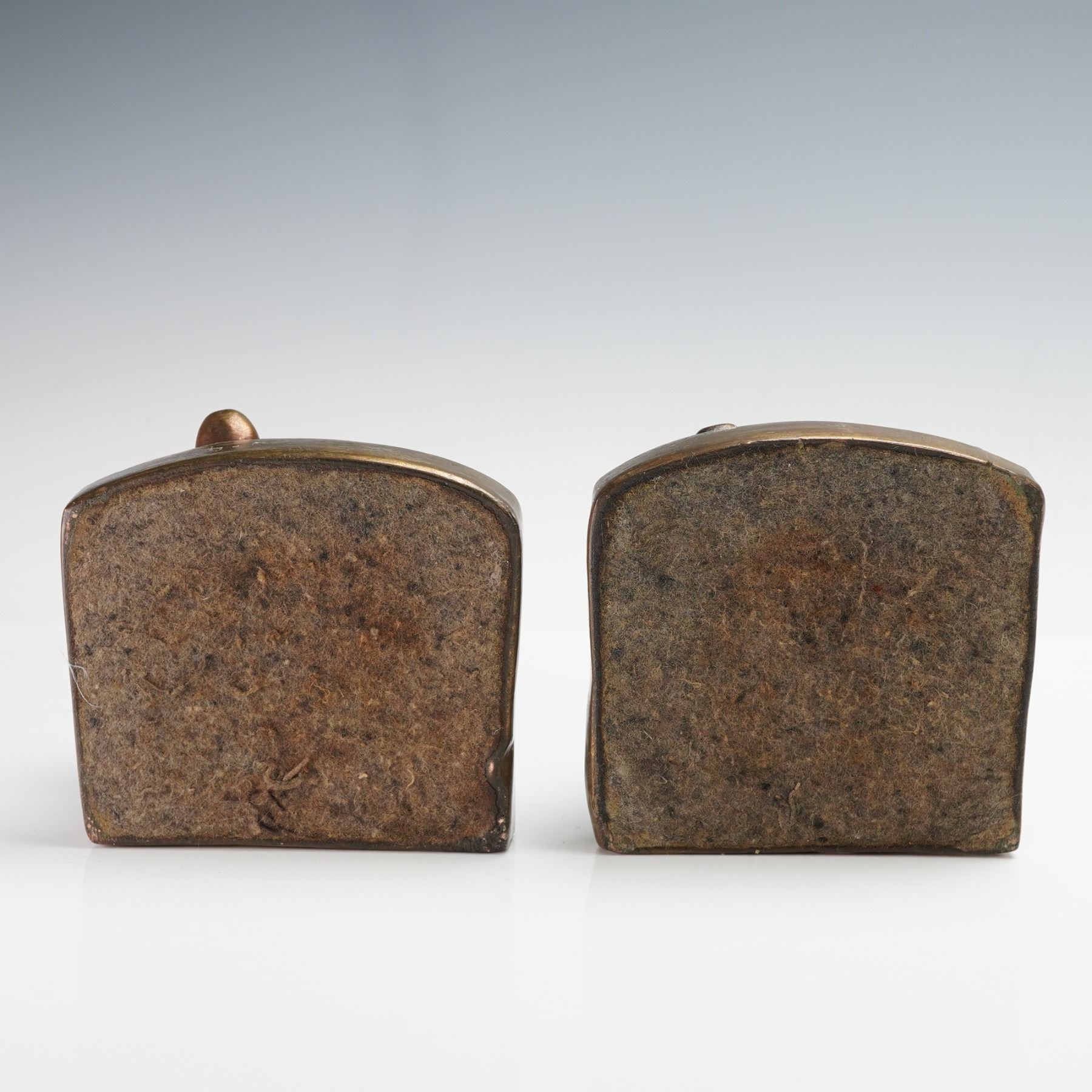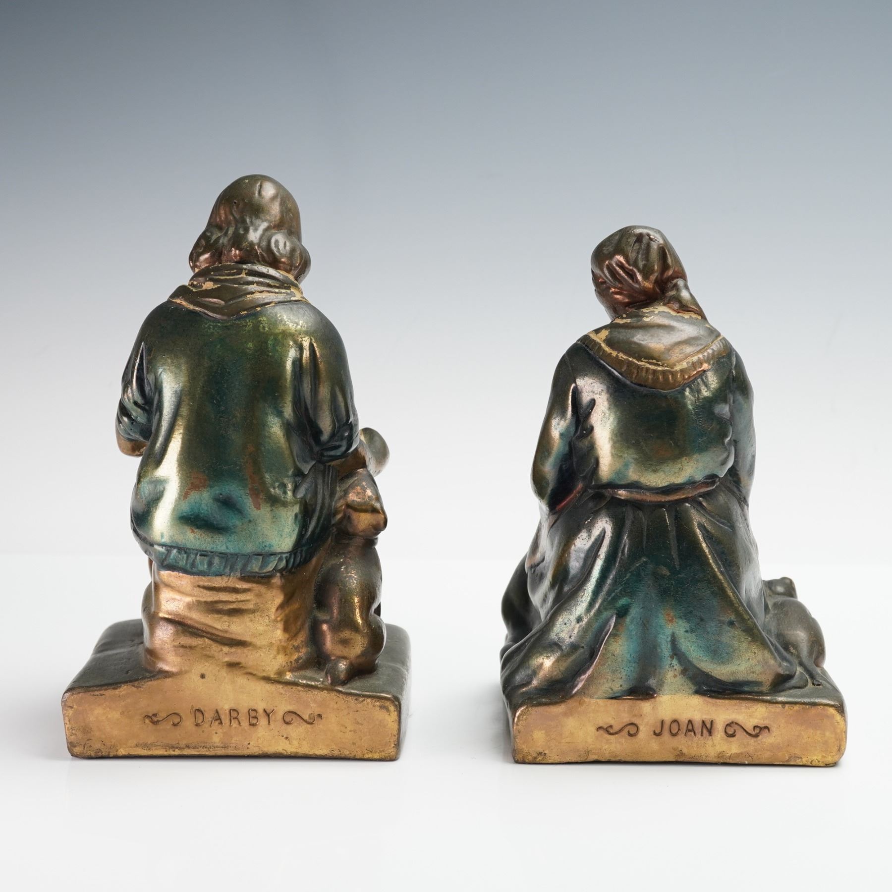 Pair of cast iron bookends depicting Darby and Joan, an elderly couple seated back-to-back. Darby is shown reading with a small dog at his side, while Joan sits knitting. Finished in a bronze and green patina with original felt bases. Each marked "Darby" and "Joan" on the reverse. Weights: 7.14 lb.