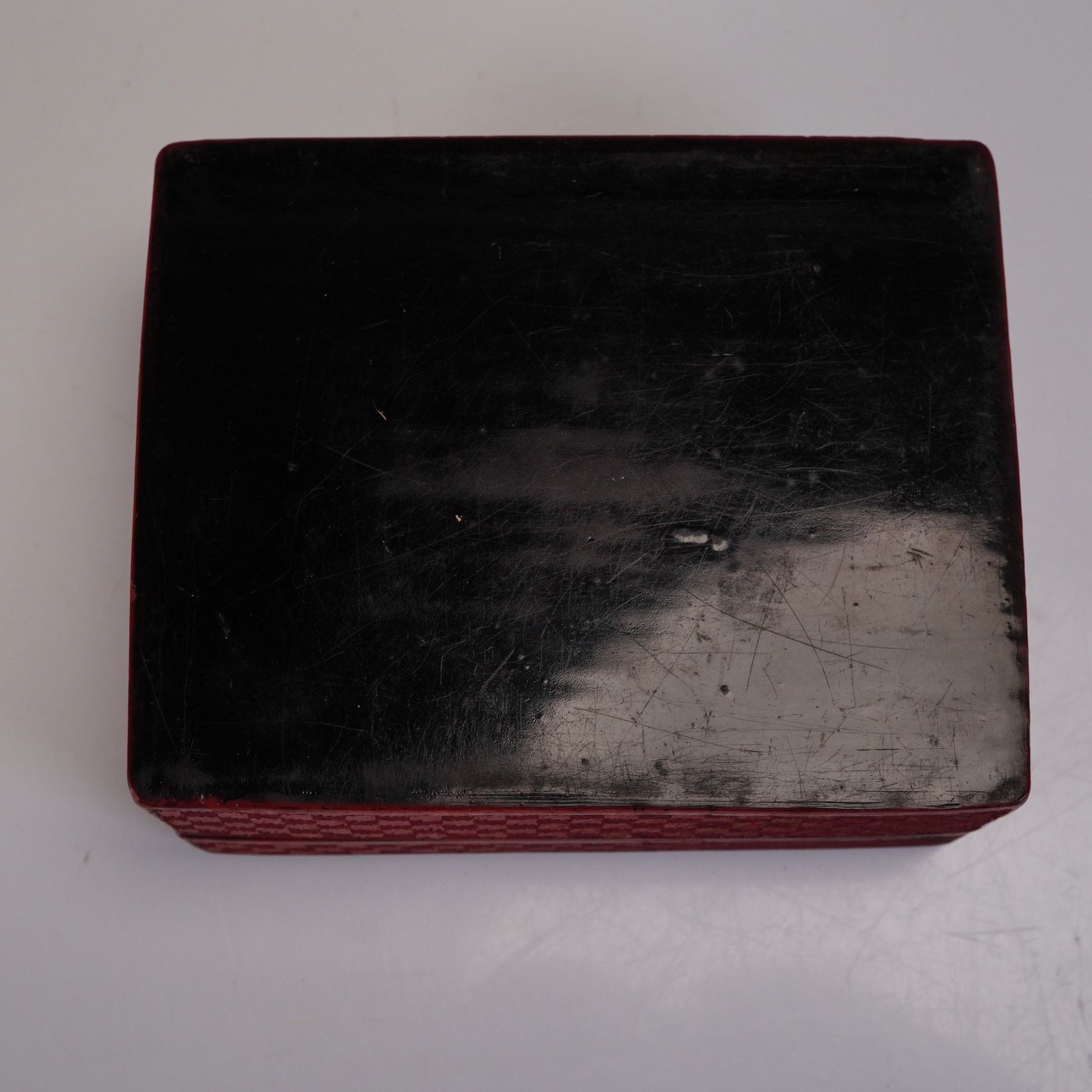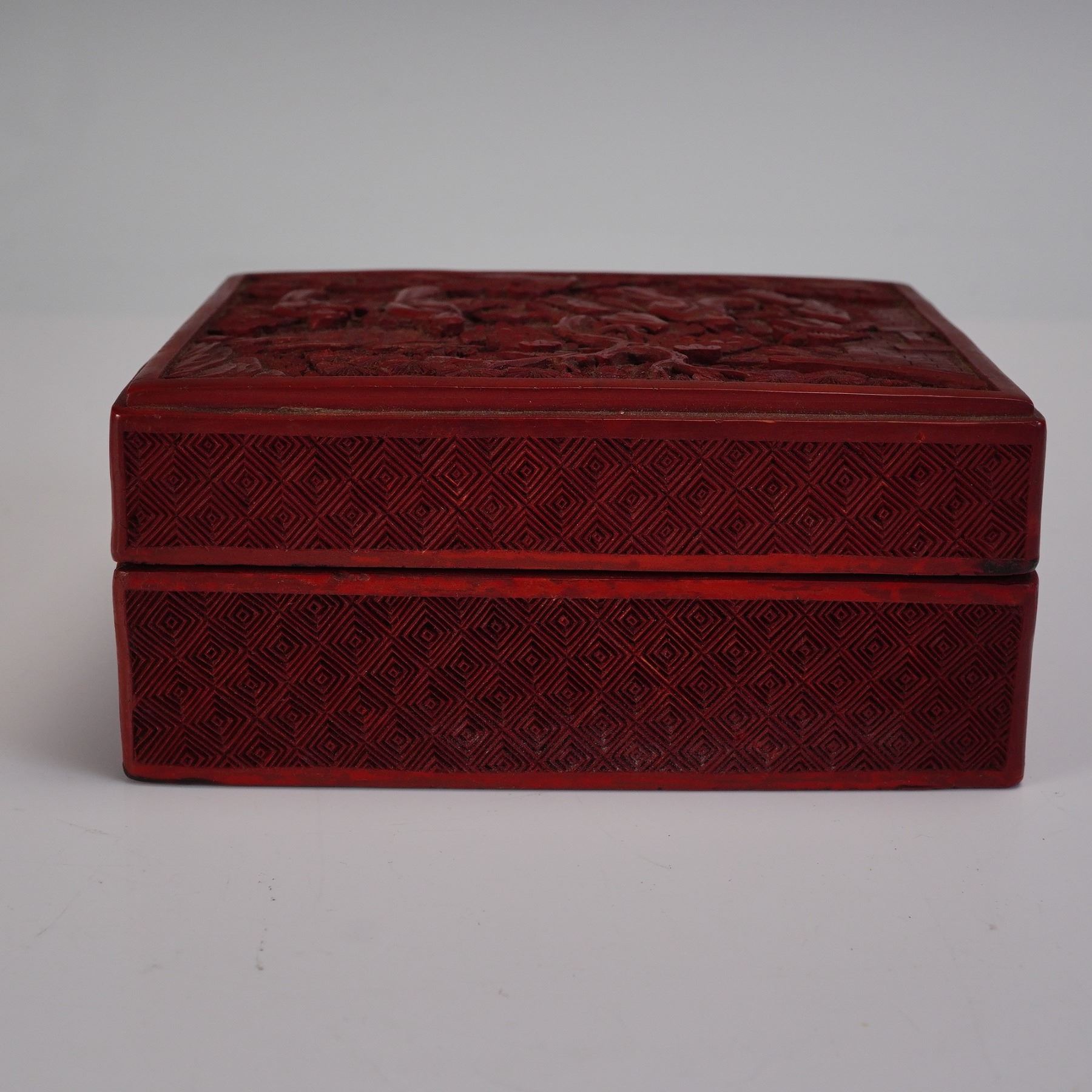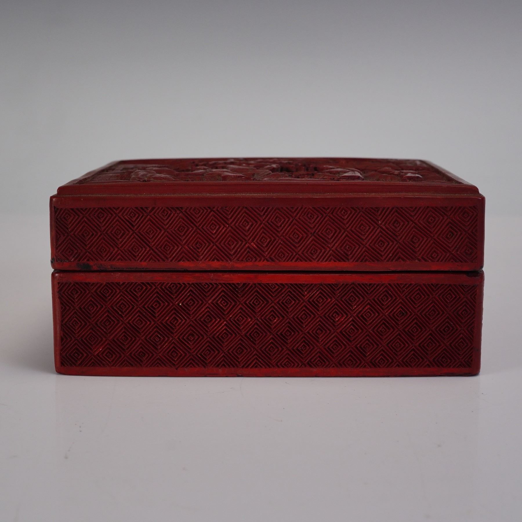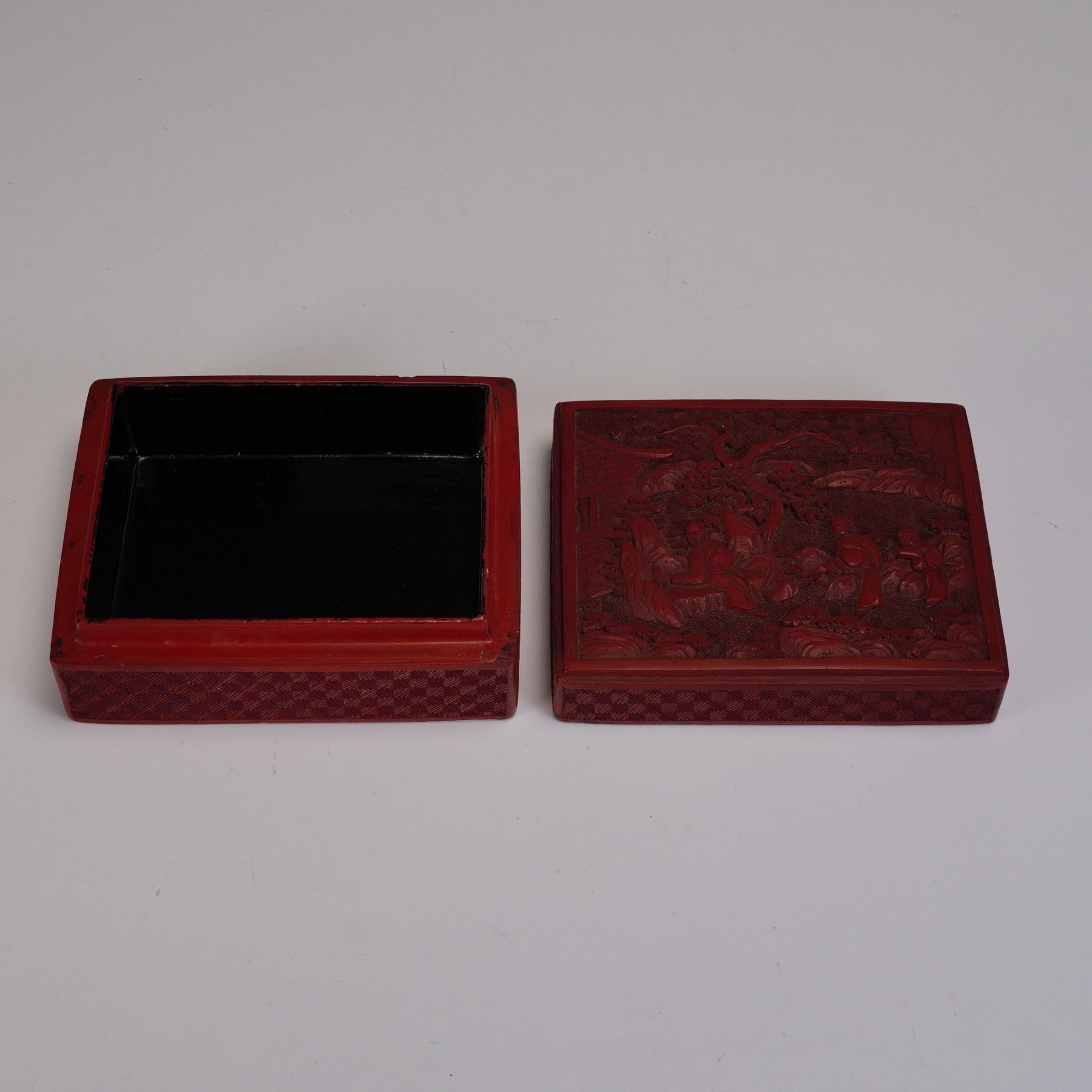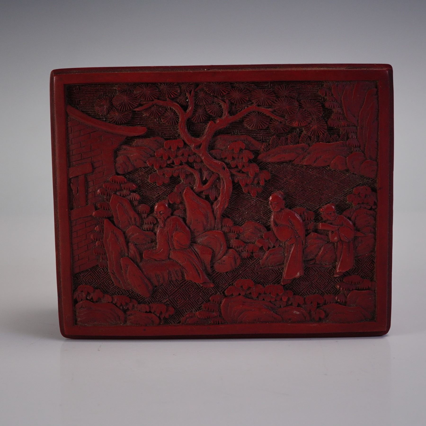 Chinese cinnabar lacquer box with carved figures and landscape scene. The rectangular lid depicts three robed figures in a courtyard surrounded by trees, rocks, and architectural elements. The sides are adorned with an incised diamond pattern, while the interior and base are finished in black lacquer. Includes box and fitted lid.