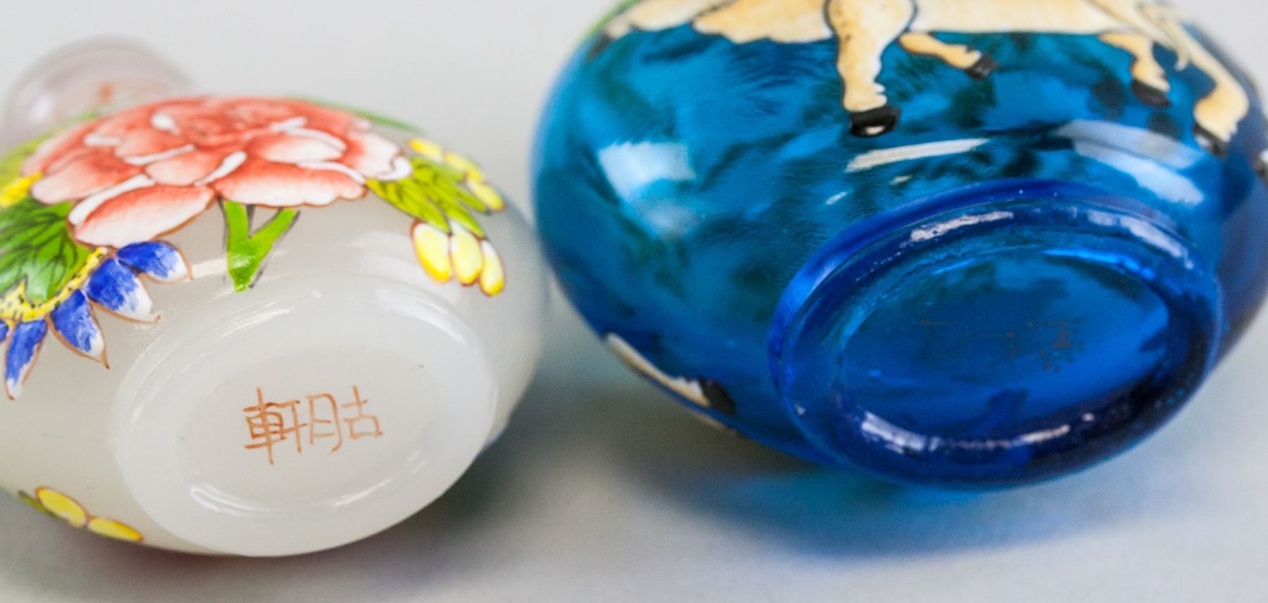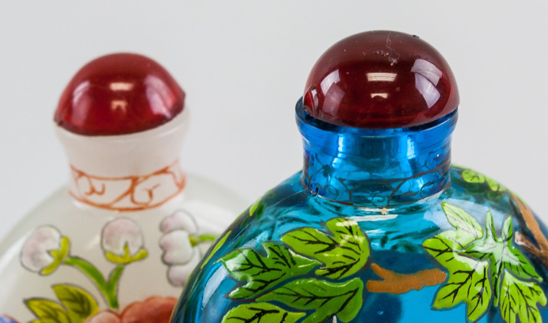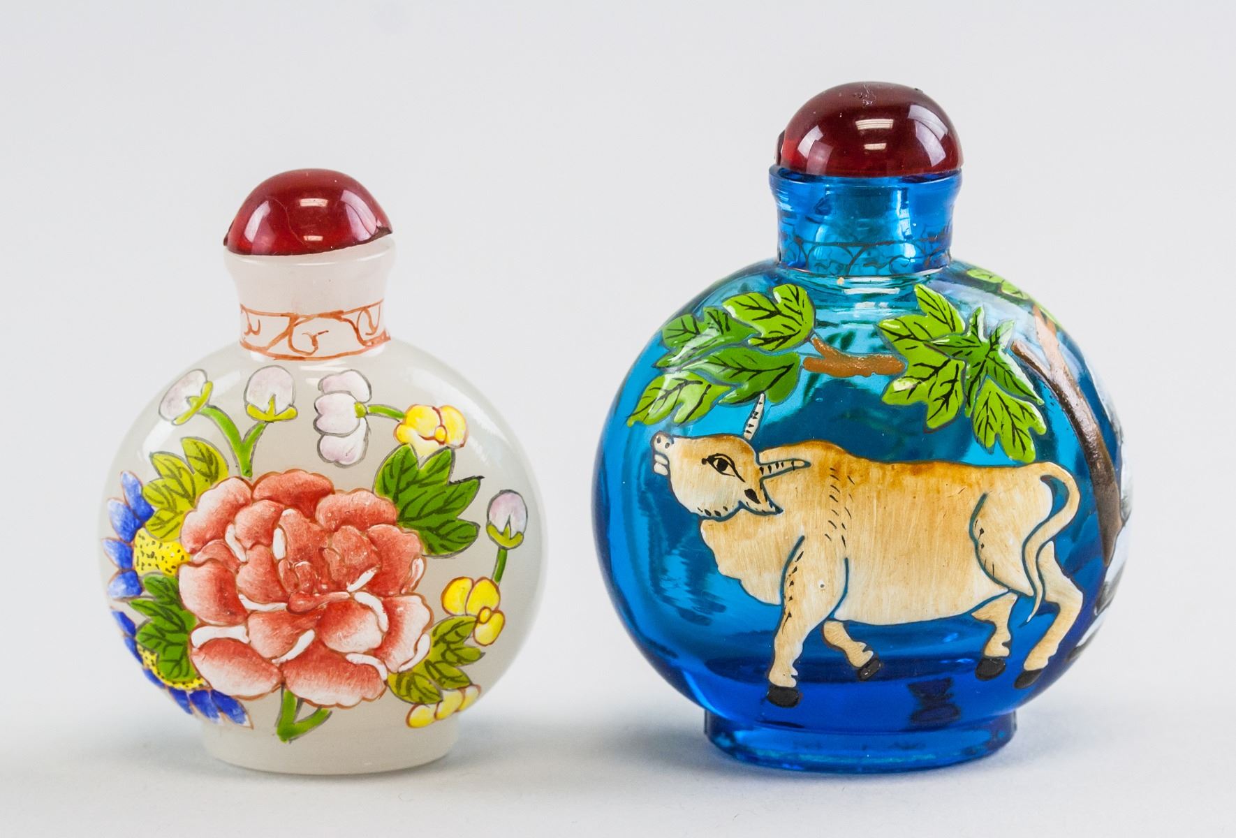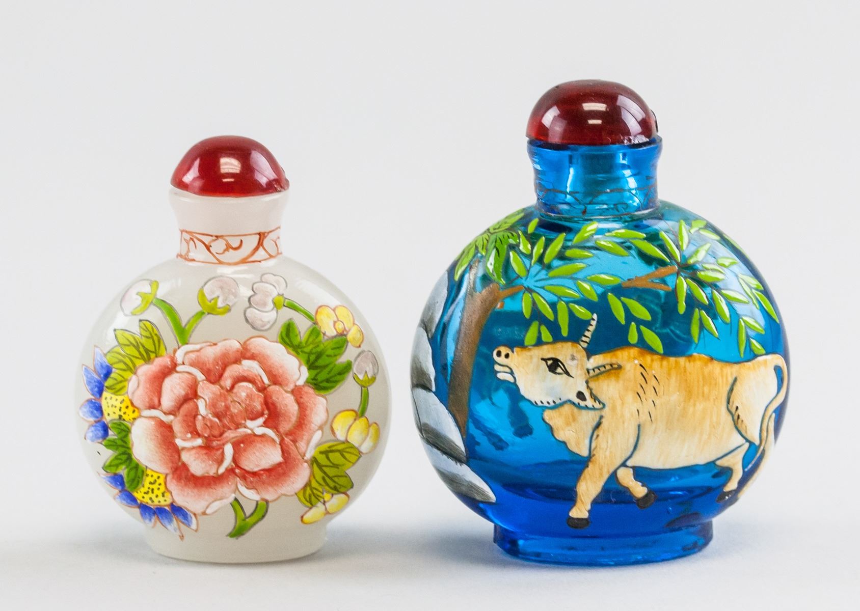 Lot of 2 snuff bottles. One painted with flowers with "Hu Xuan" in Chinese characters on base. The other painted with a cow on a blue background with illegible inscription on base. Both with red caps. 6.5 x 5.5 cm, 41 grams and 62 grams.
